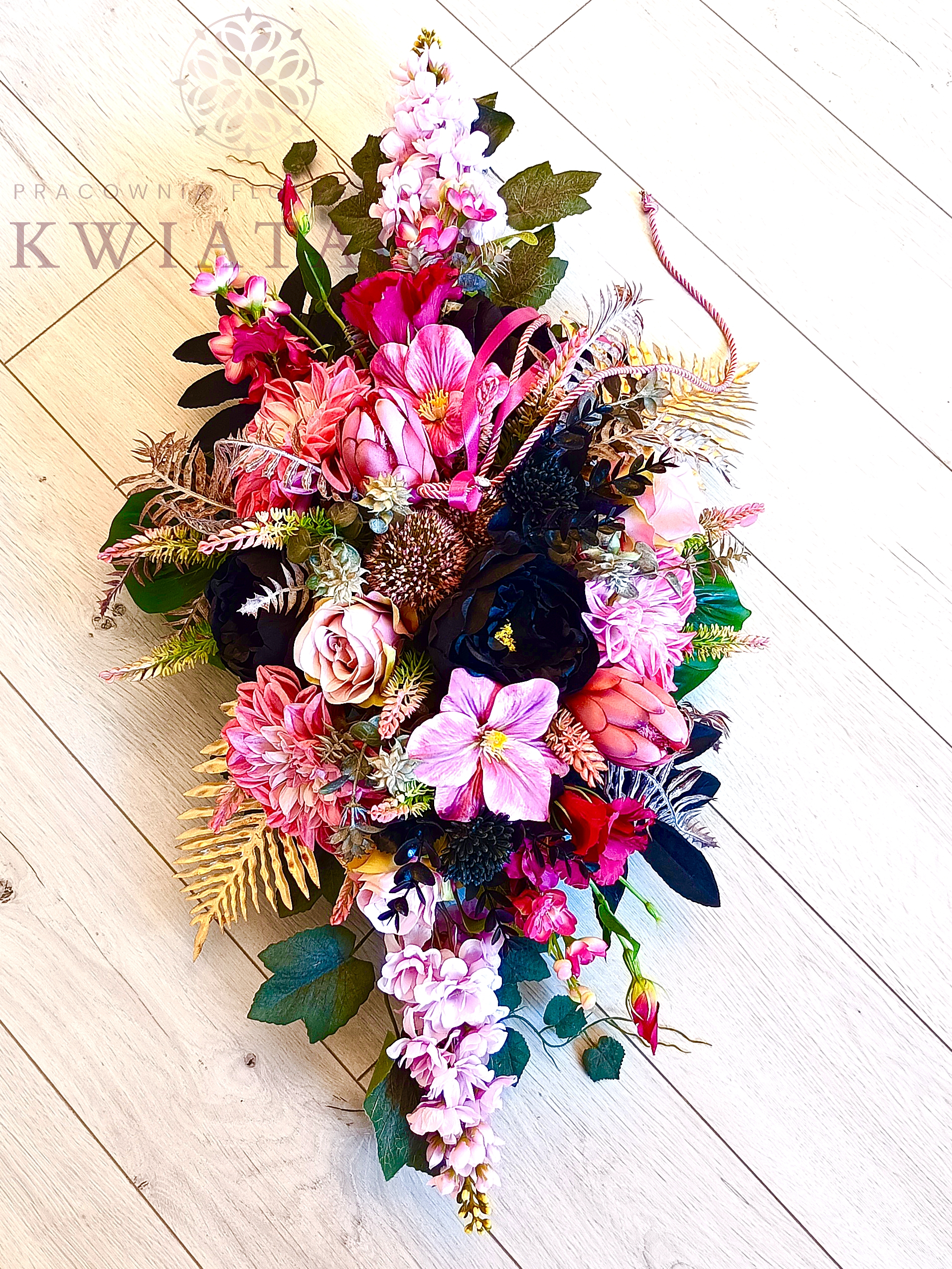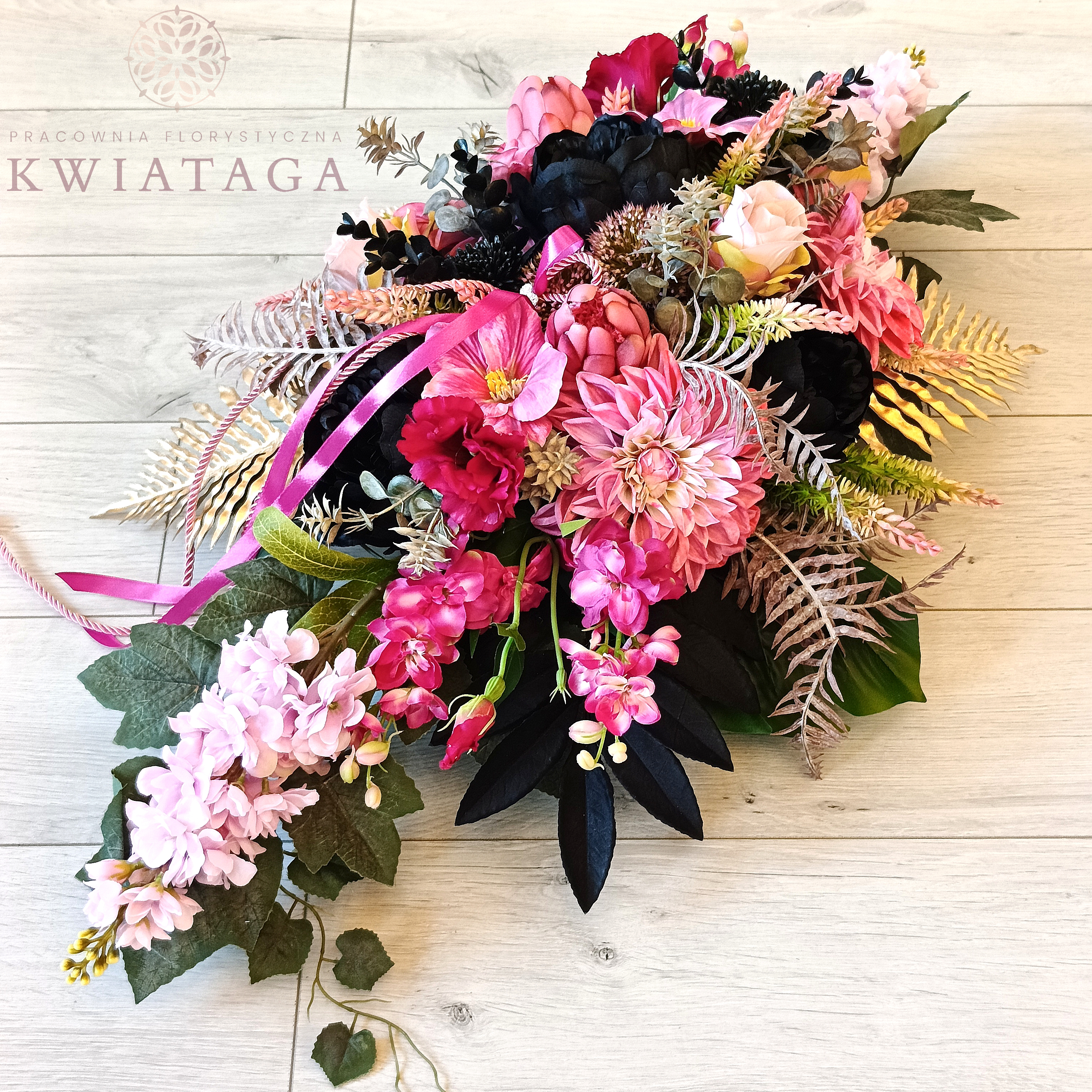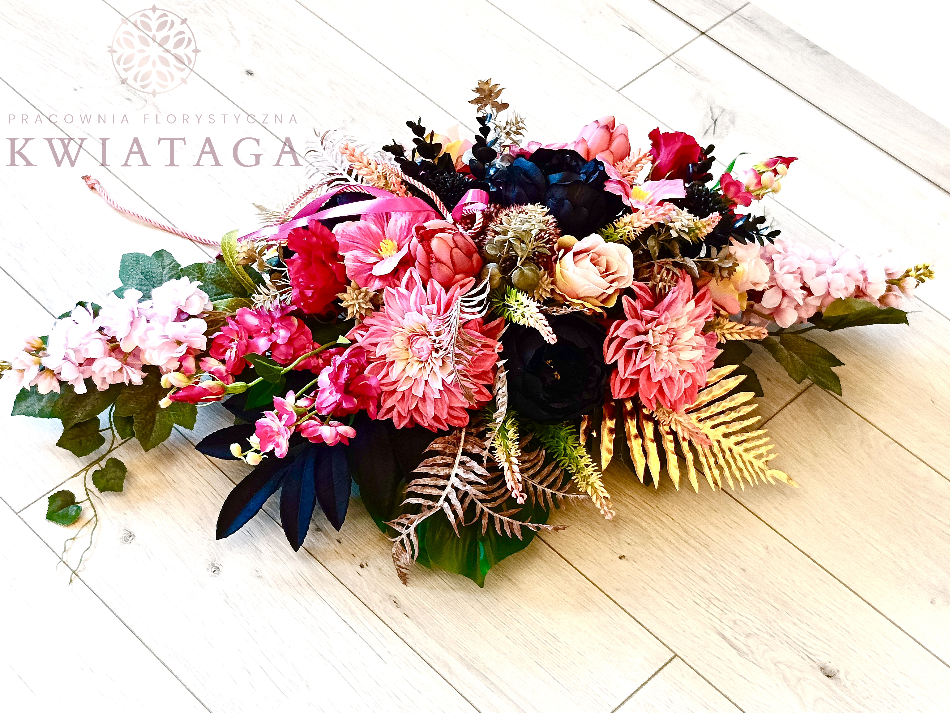 Elegancka, podłużna dekoracja nagrobna w barwach fuksji, różu i czerni z odrobiną złota. Stroik wykonany jest z kwiatów sztucznych wysokiej jakości. Podstawą jest obciążona, plastikowa doniczka. Wymiary kompozycji: długość 90cm, szerokość 50cm. Kompozycja idealna zarówno na pojedynczy jak i podwójny pomnik.
