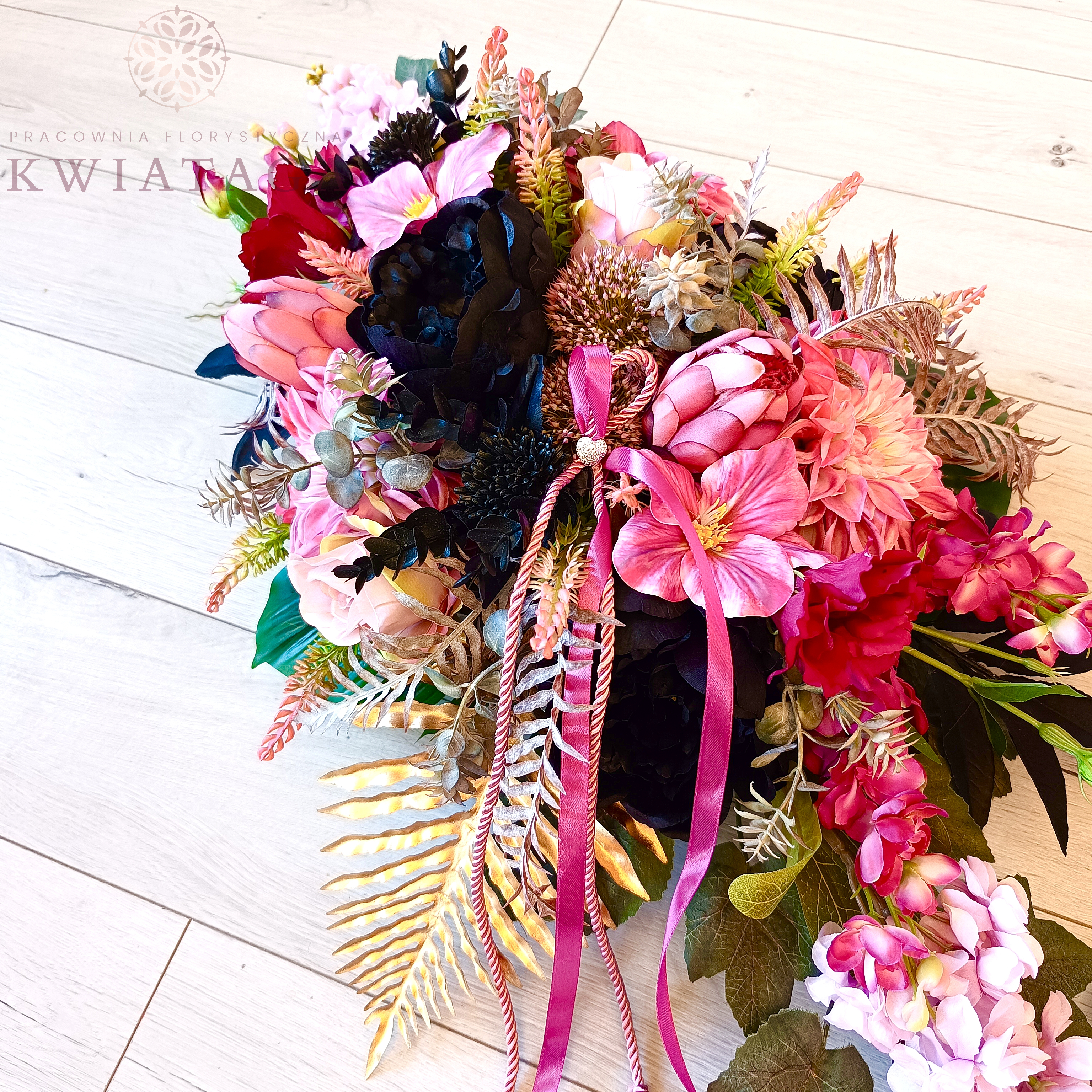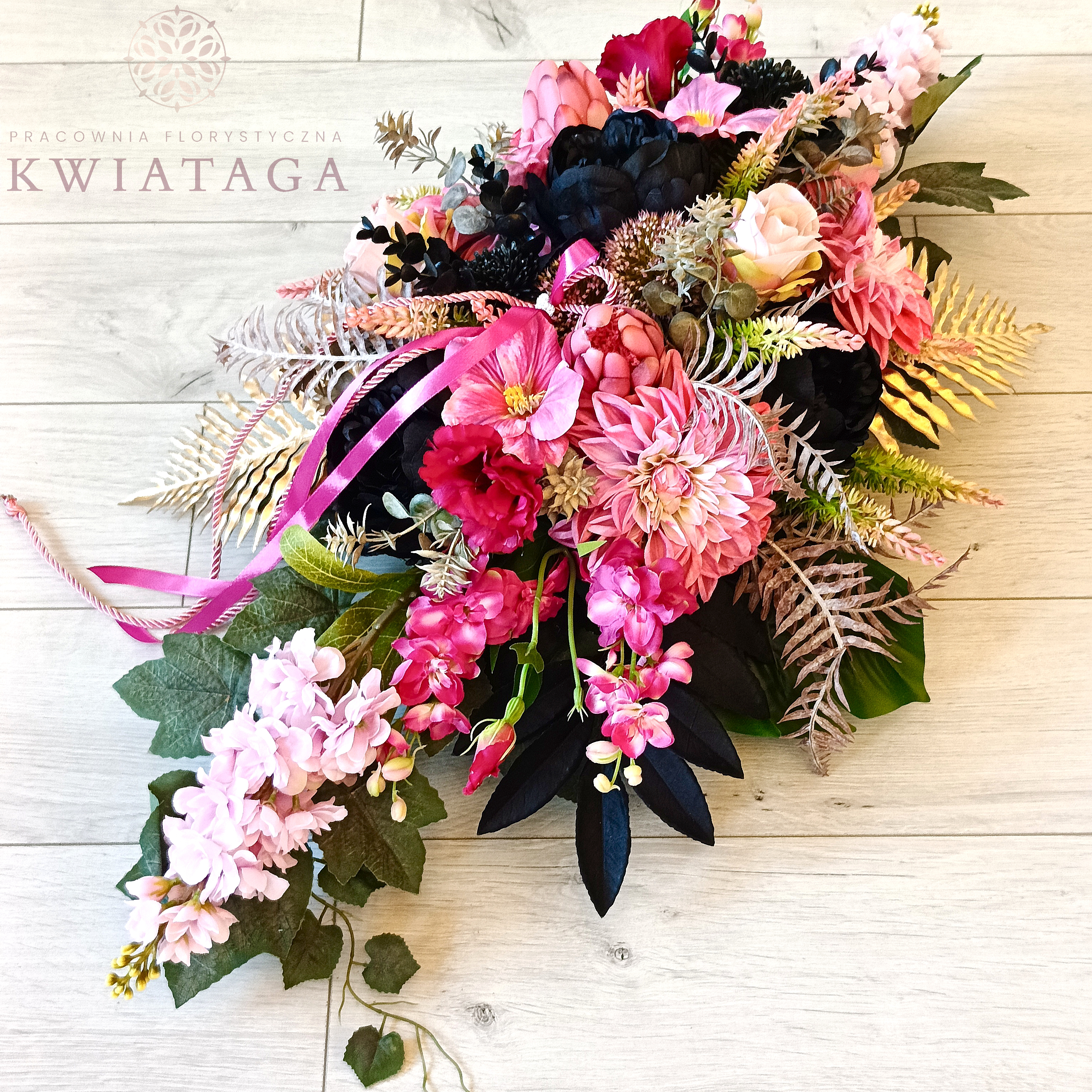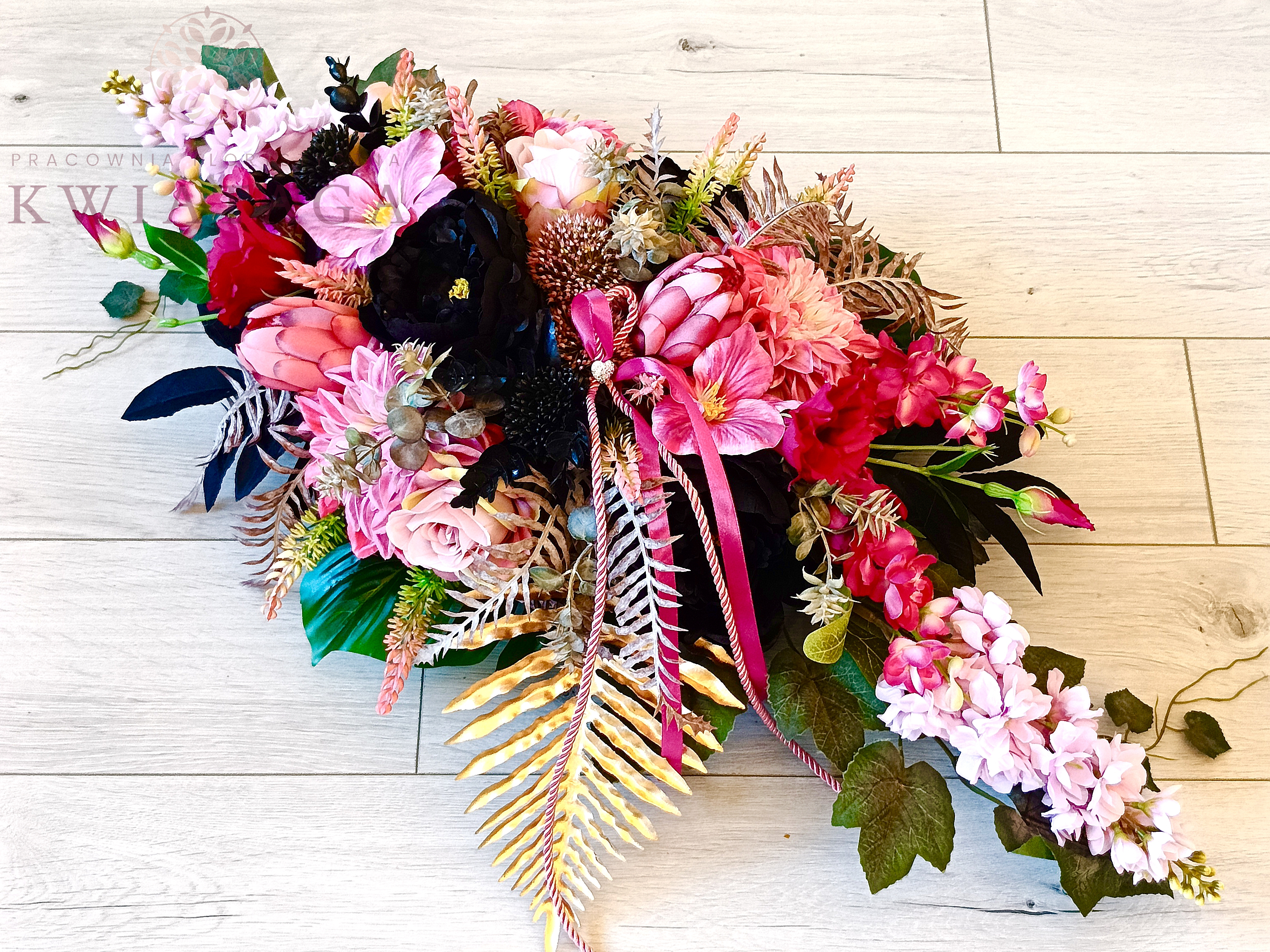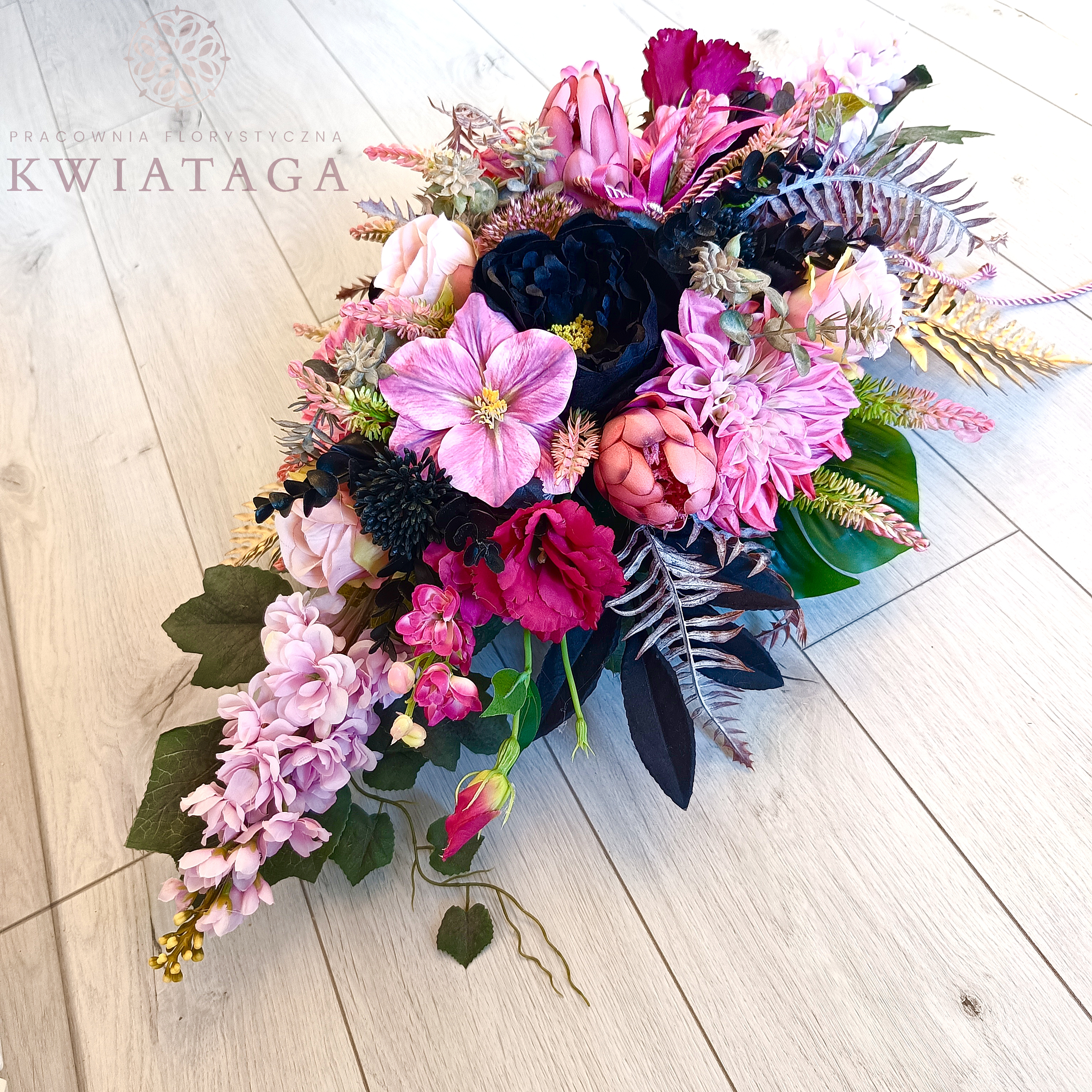 Elegancka, podłużna dekoracja nagrobna w barwach fuksji, różu i czerni z odrobiną złota. Stroik wykonany jest z kwiatów sztucznych wysokiej jakości. Podstawą jest obciążona, plastikowa doniczka. Wymiary kompozycji: długość 90cm, szerokość 50cm. Kompozycja idealna zarówno na pojedynczy jak i podwójny pomnik.