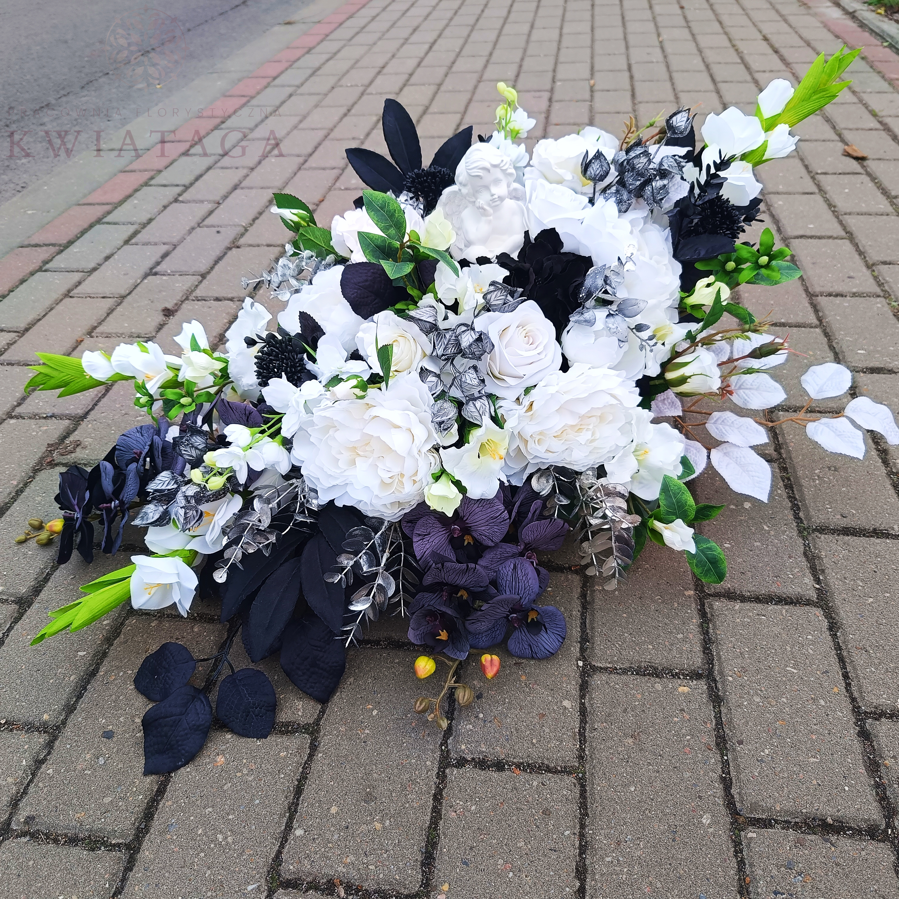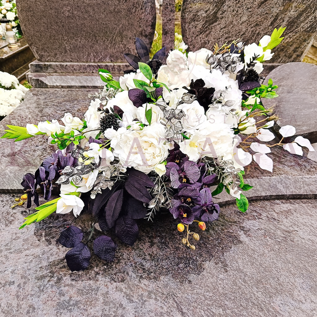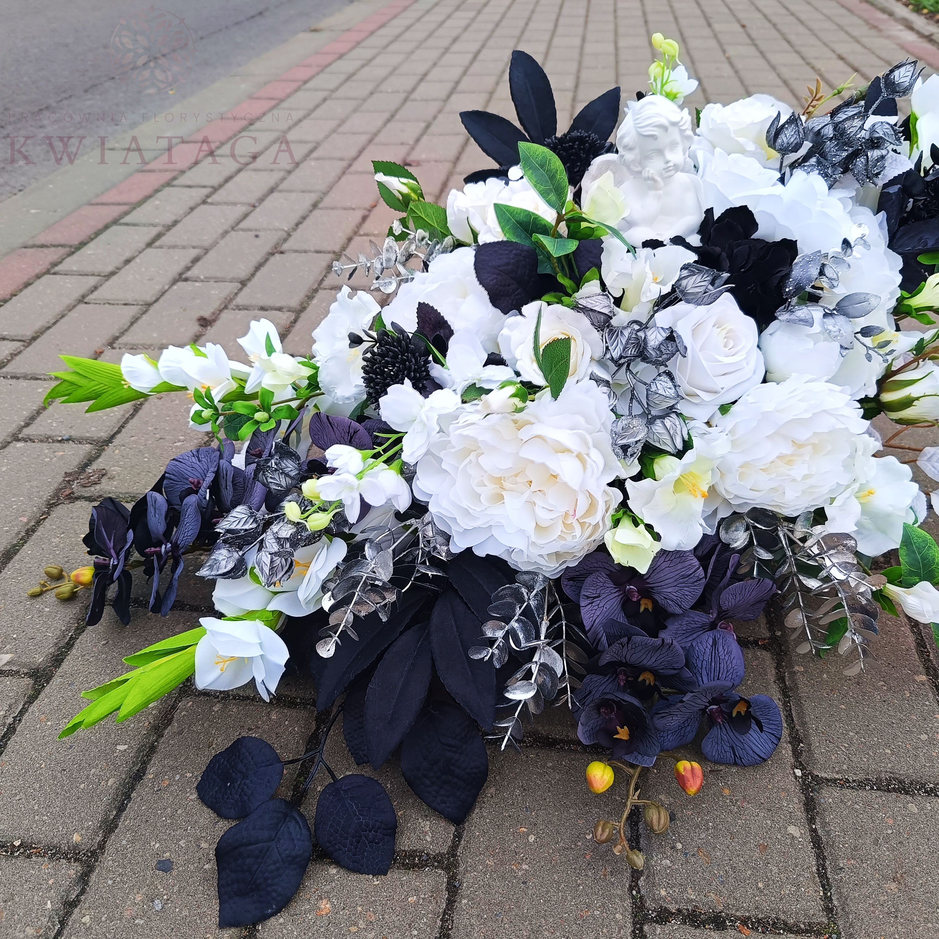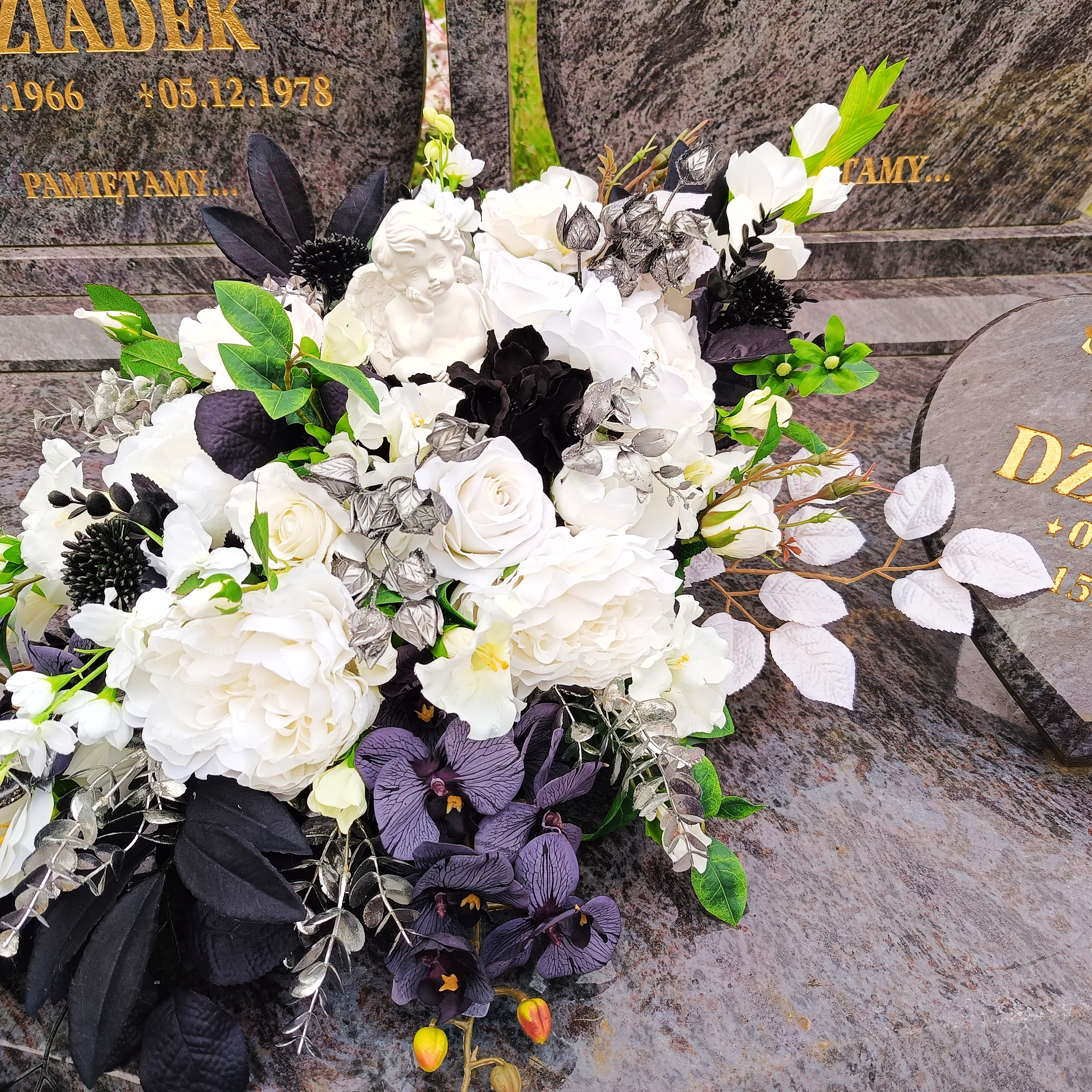 Duża, elegancka dekoracja nagrobna, w oryginalnej asymetrycznej formie. Stroik w barwach bieli, czerni, szarości z nutą srebra, wykonany jest z kwiatów sztucznych wysokiej jakości. Punktem centralnym kompozycji jest figurka białego aniołka, zaś podstawą jest obciążona, plastikowa doniczka. Wymiary kompozycji: długość 95cm, szerokość 50cm, wysokość 40cm. Stroik idealny na podwójny pomnik.