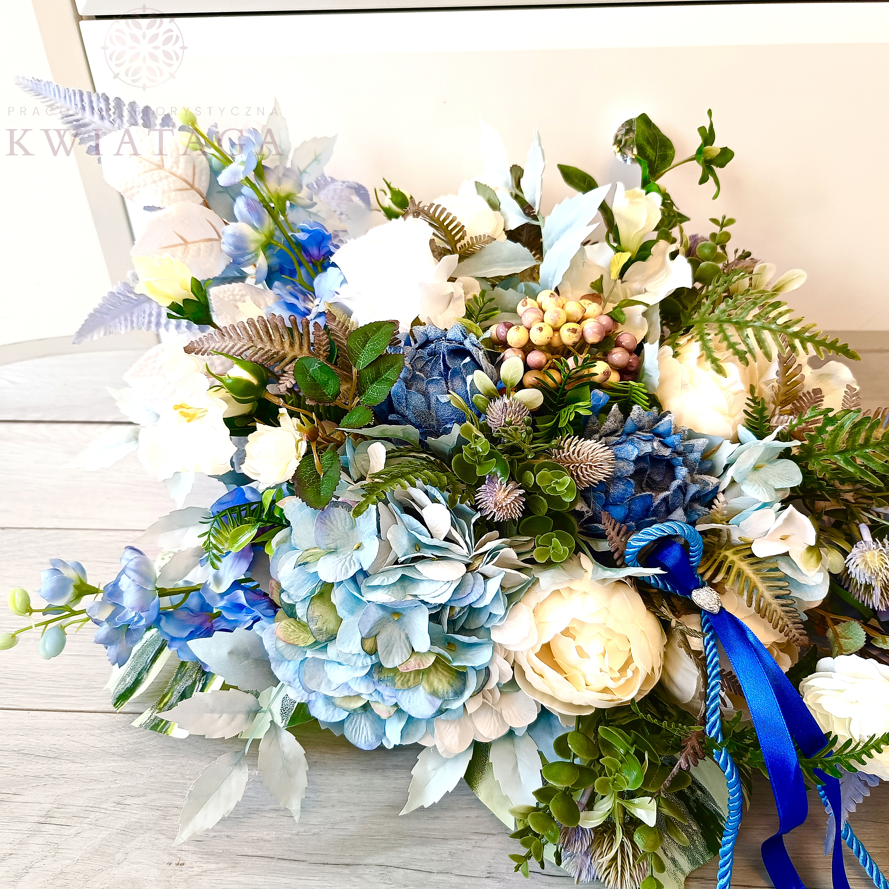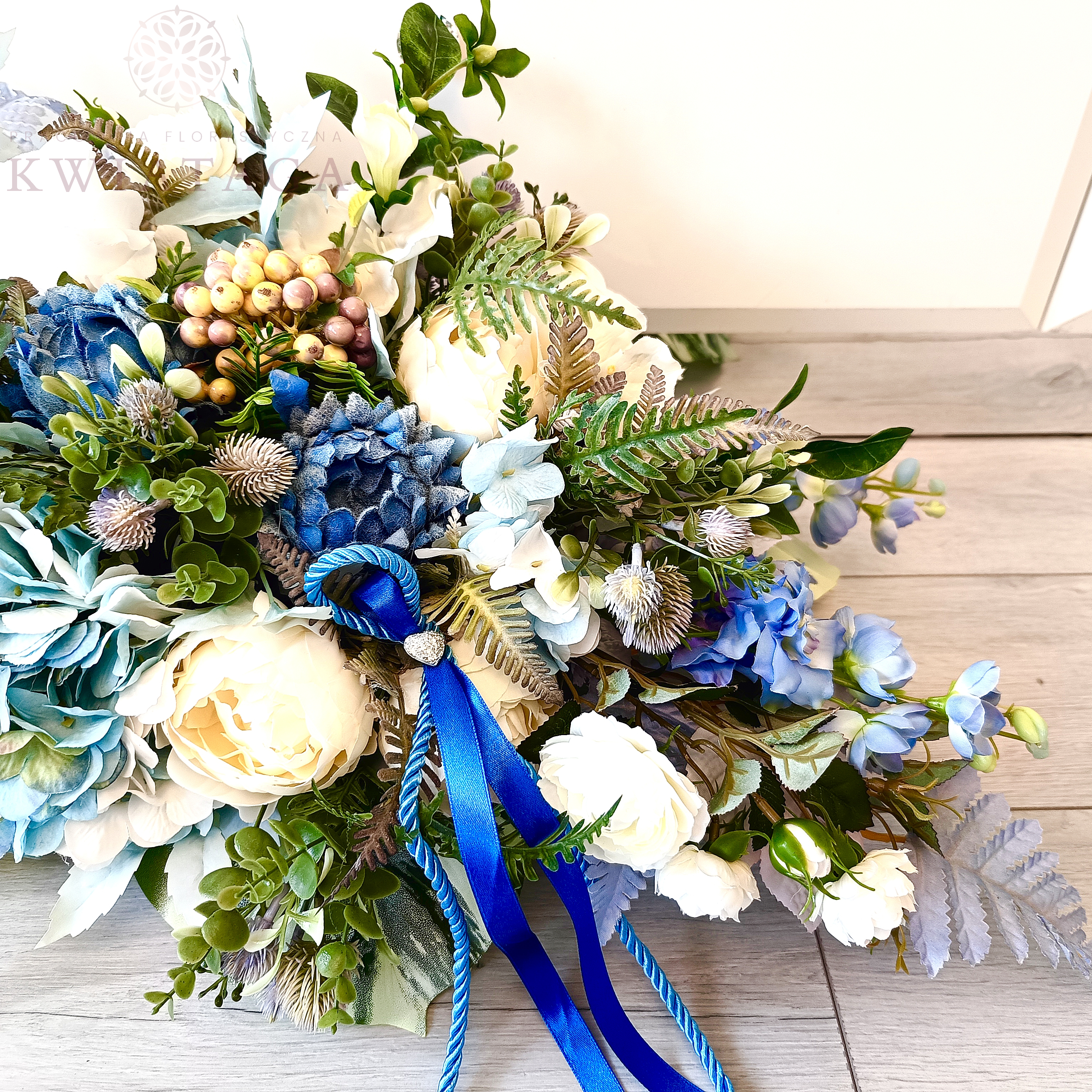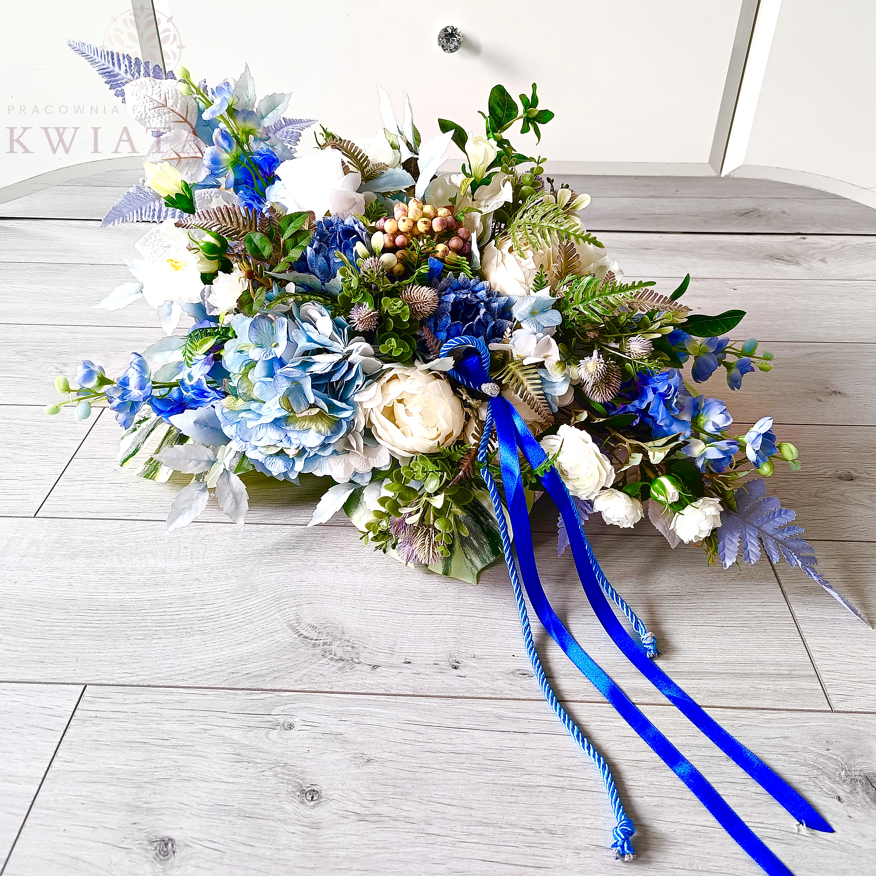 Elegancka dekoracja nagrobna, w oryginalnej asymetrycznej formie. Stroik w barwach bieli i niebieskości w odcieniach, wykonany jest z kwiatów sztucznych wysokiej jakości. Podstawą jest obciążona, plastikowa doniczka. Wymiary kompozycji: długość 64cm, szerokość 42cm, wysokość 33cm w najwyższym punkcie. Stroik idealny na pojedynczy pomnik lub nagrobek dziecięcy.
