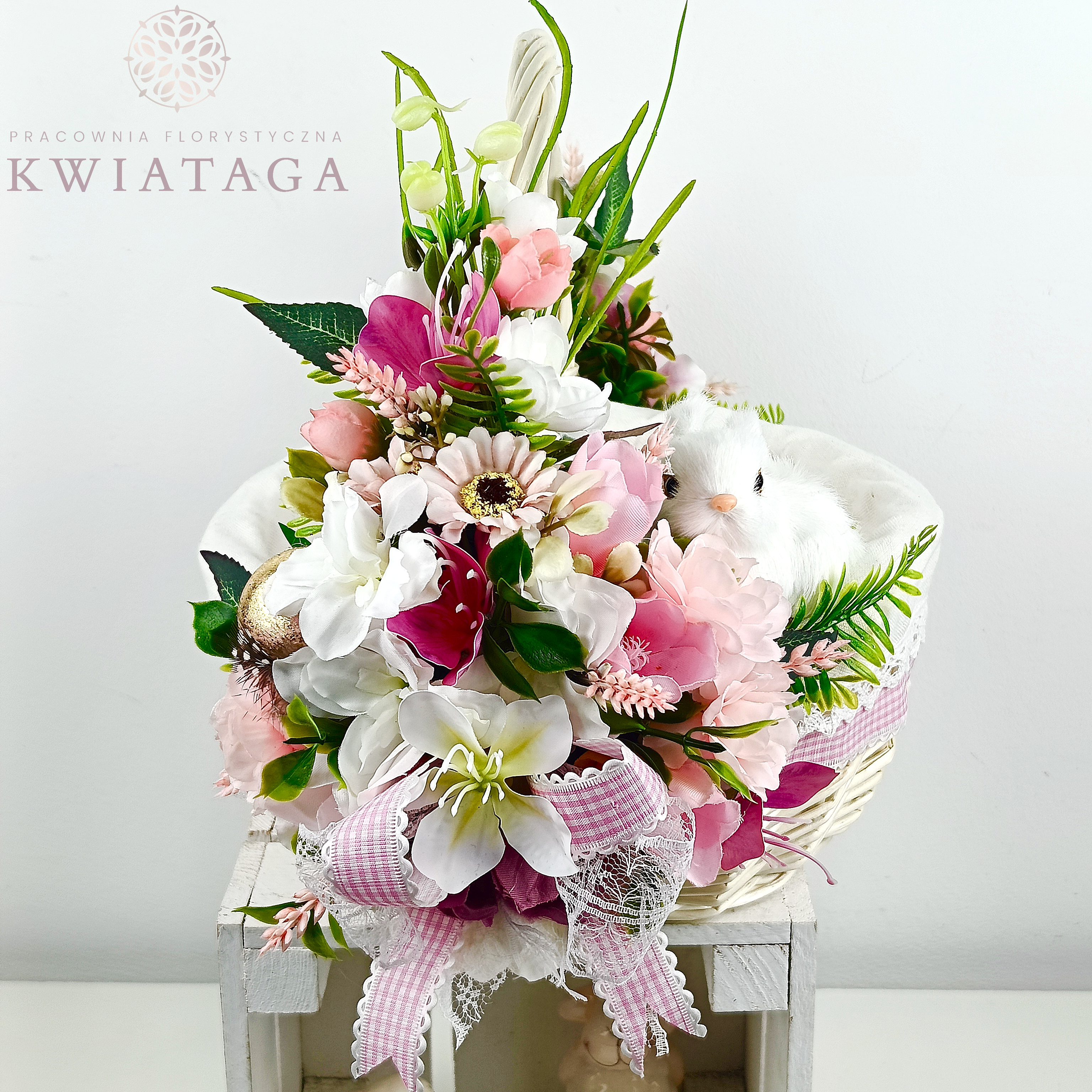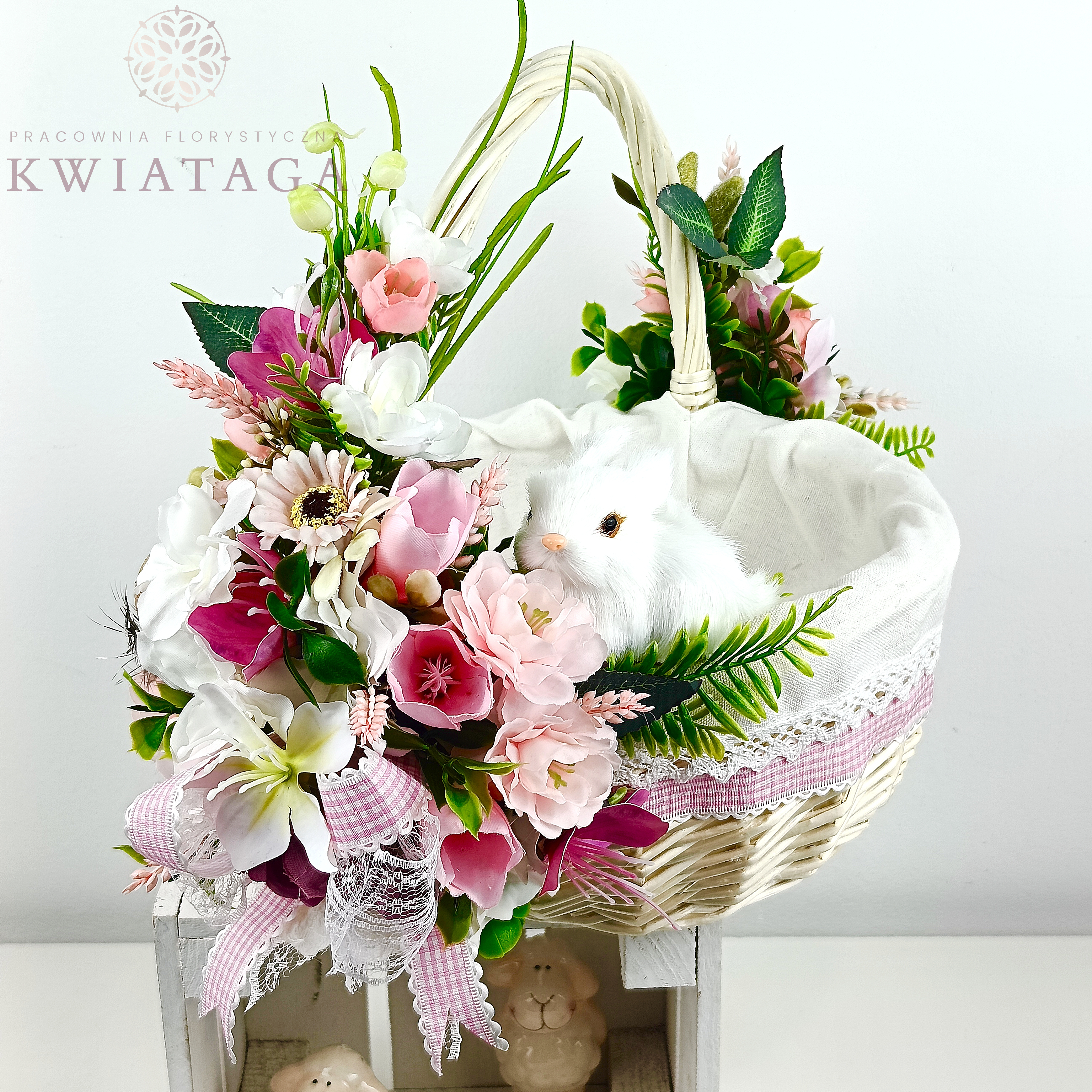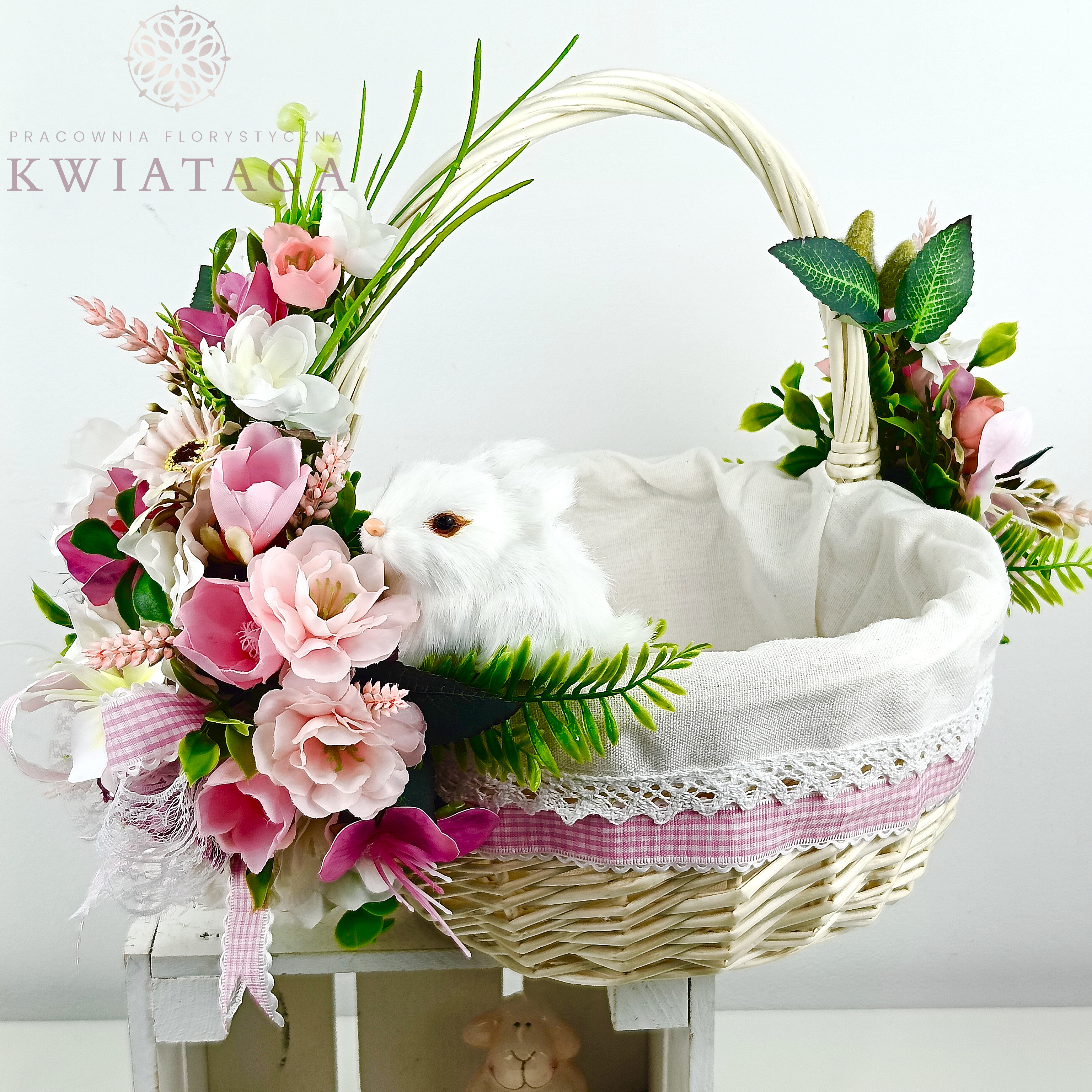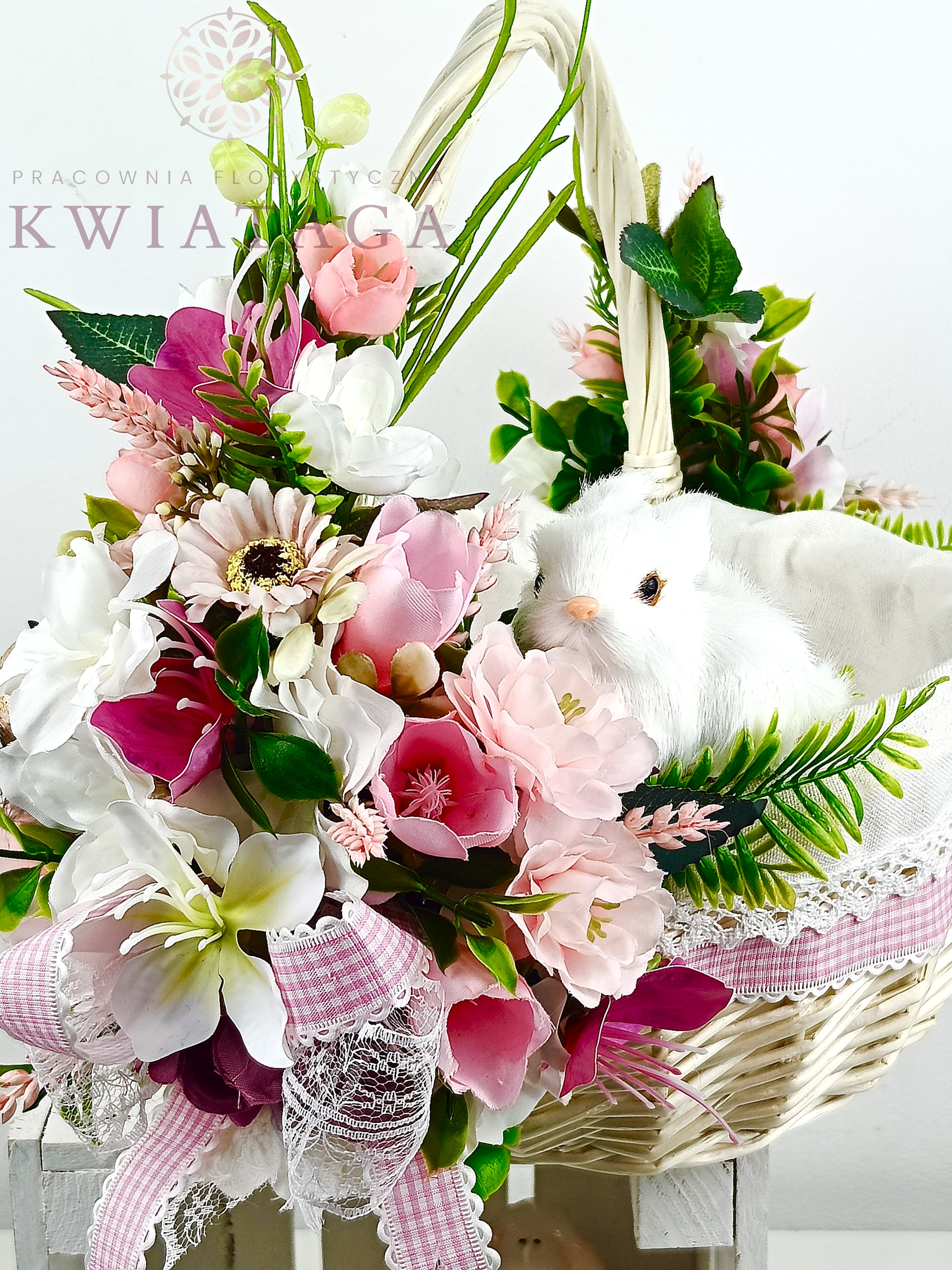 Strona główna » Florystyka z kwiatów sztucznych wysokiej jakości » Wielkanoc / Wiosna » Koszyki Wielkanocne » Koszyk wielkanocny duży, biało - różowy z wyściółką nr 39