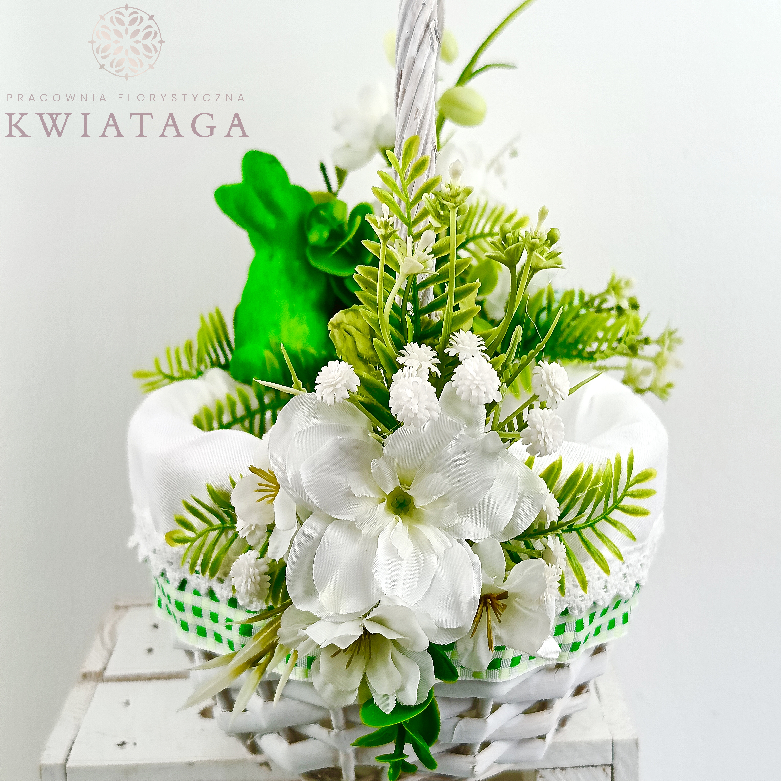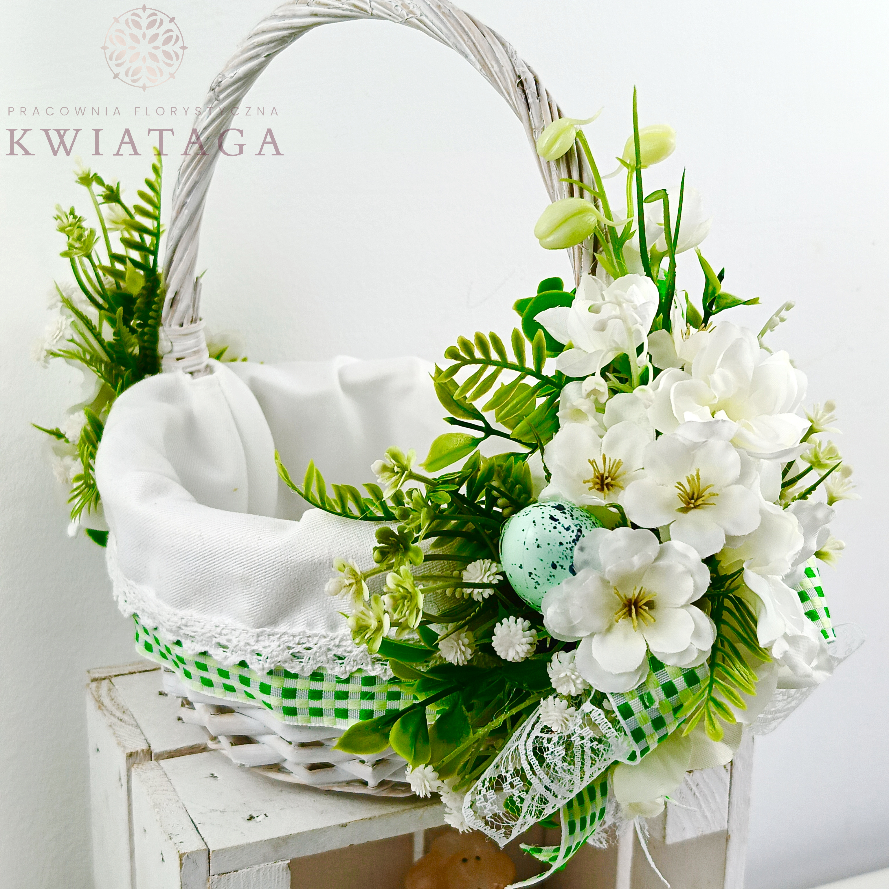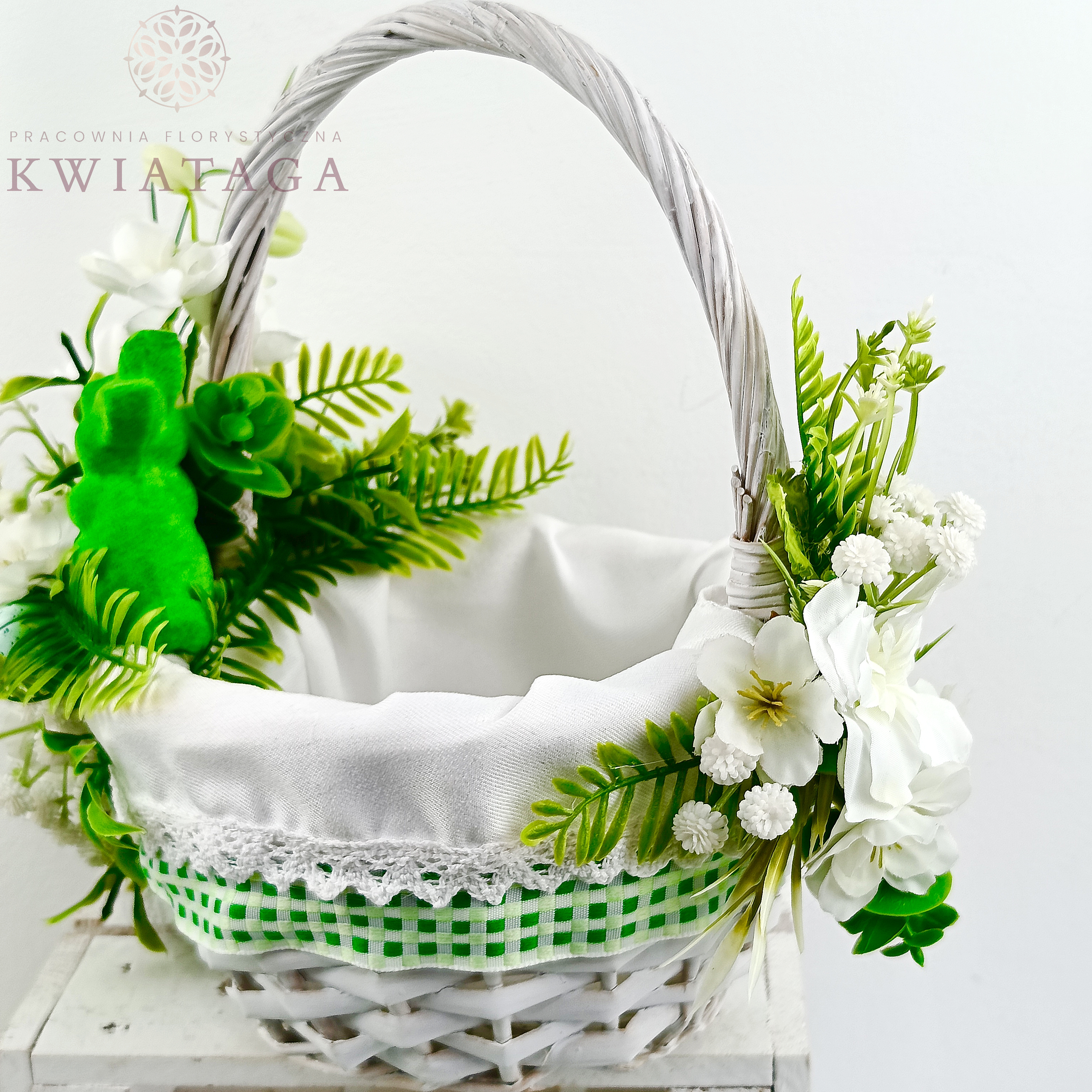 Strona główna » Florystyka z kwiatów sztucznych wysokiej jakości » Wielkanoc / Wiosna » Koszyki Wielkanocne » Koszyk wielkanocny mały, biało - zielony z wyściółką nr 26