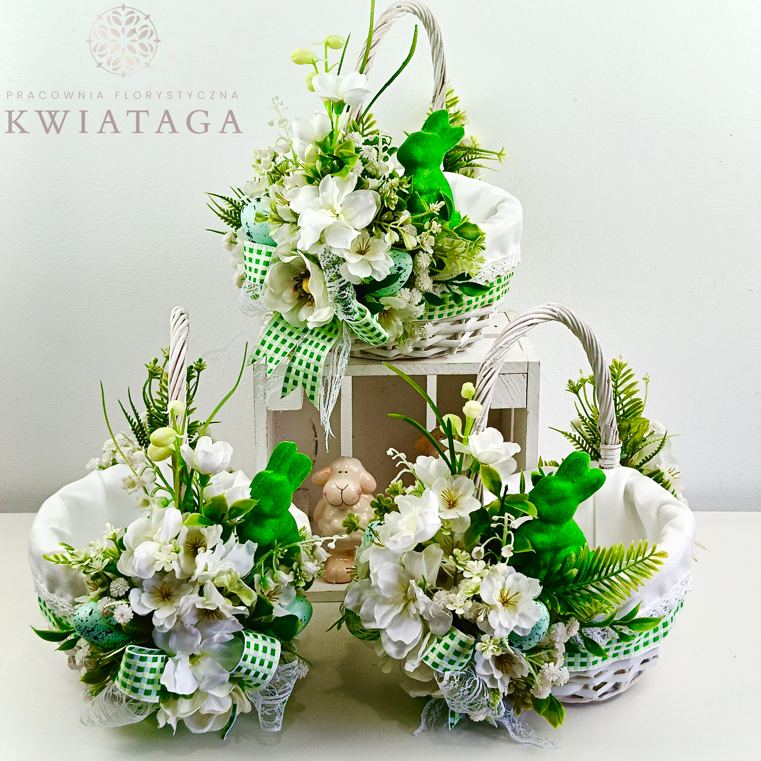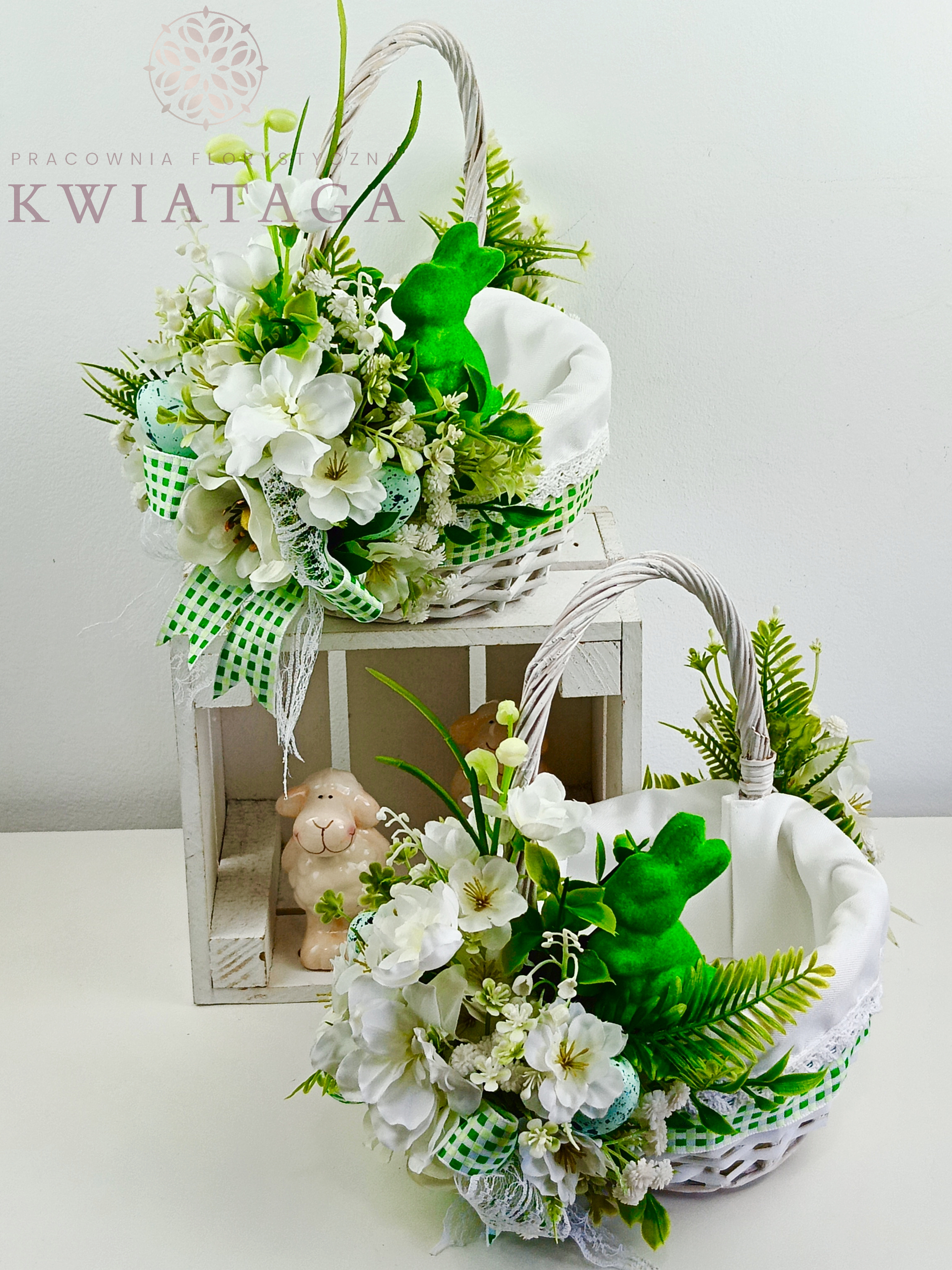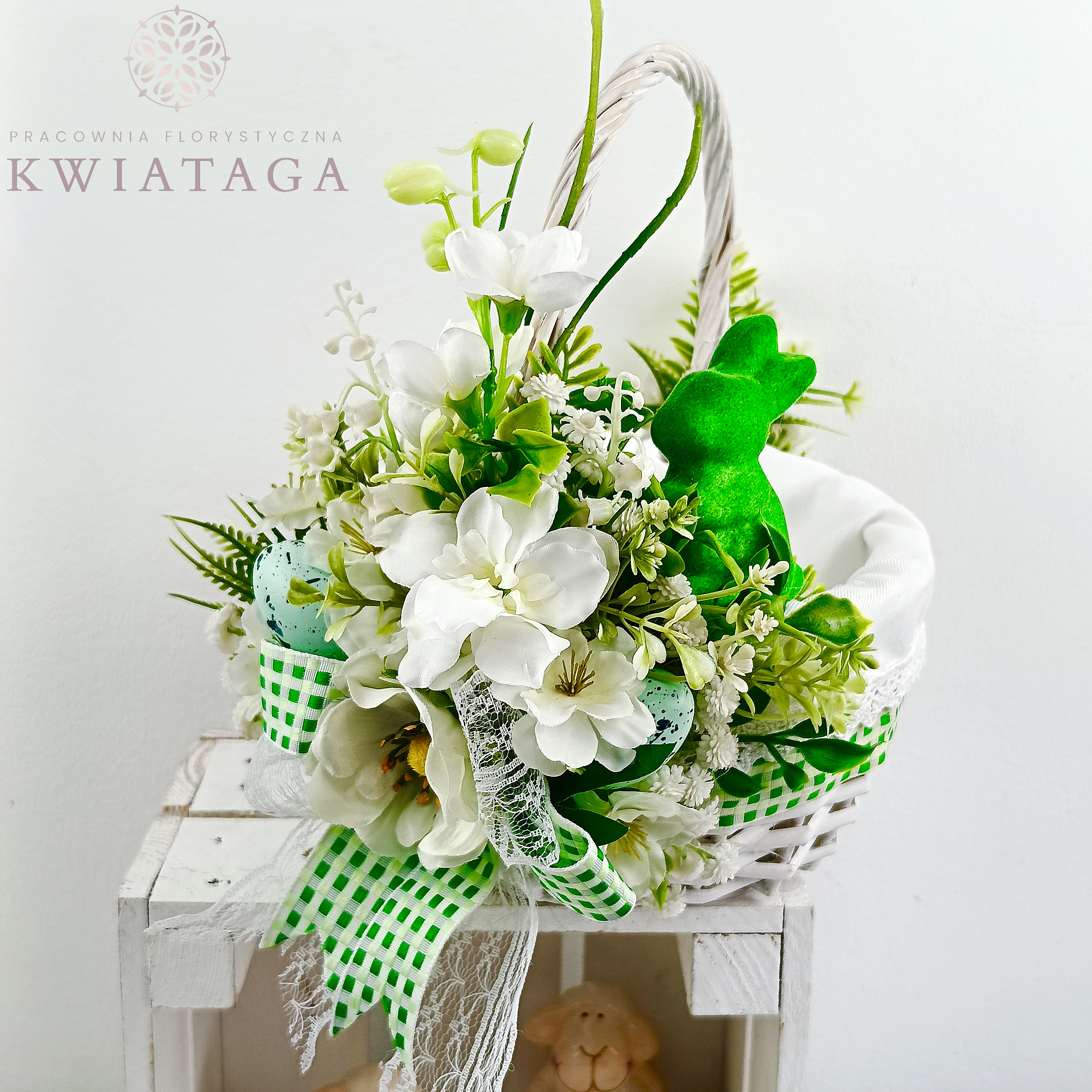 Strona główna » Florystyka z kwiatów sztucznych wysokiej jakości » Wielkanoc / Wiosna » Koszyki Wielkanocne » Koszyk wielkanocny mały, biało - zielony z wyściółką nr 26