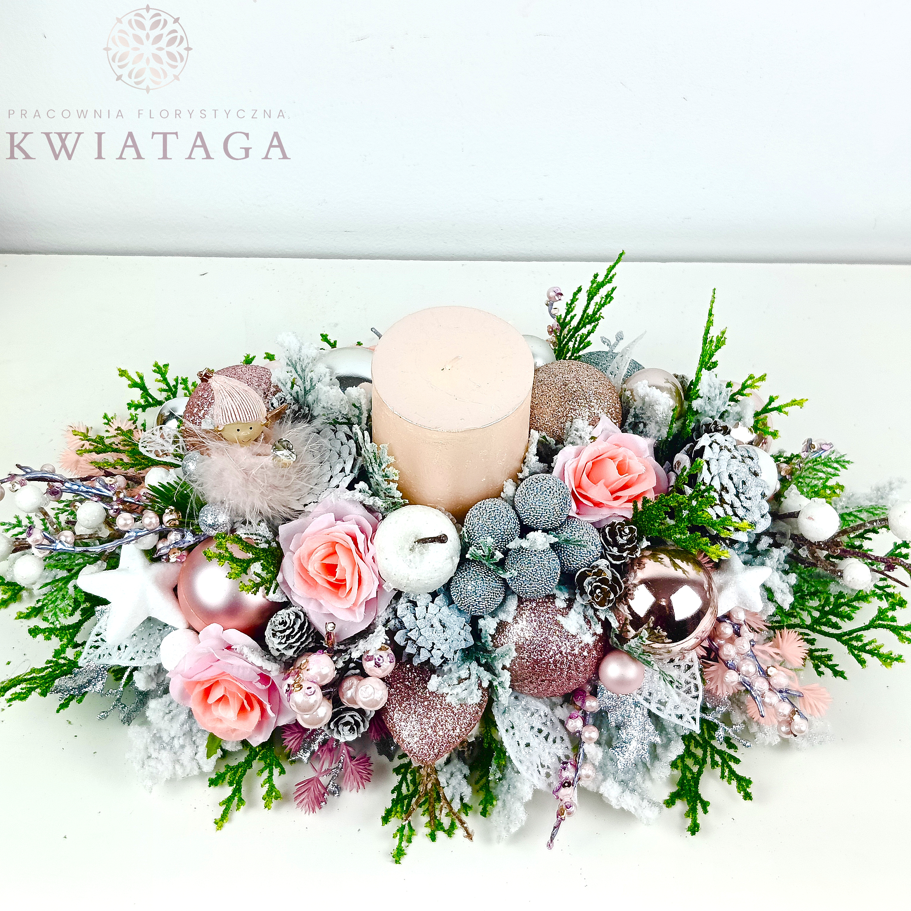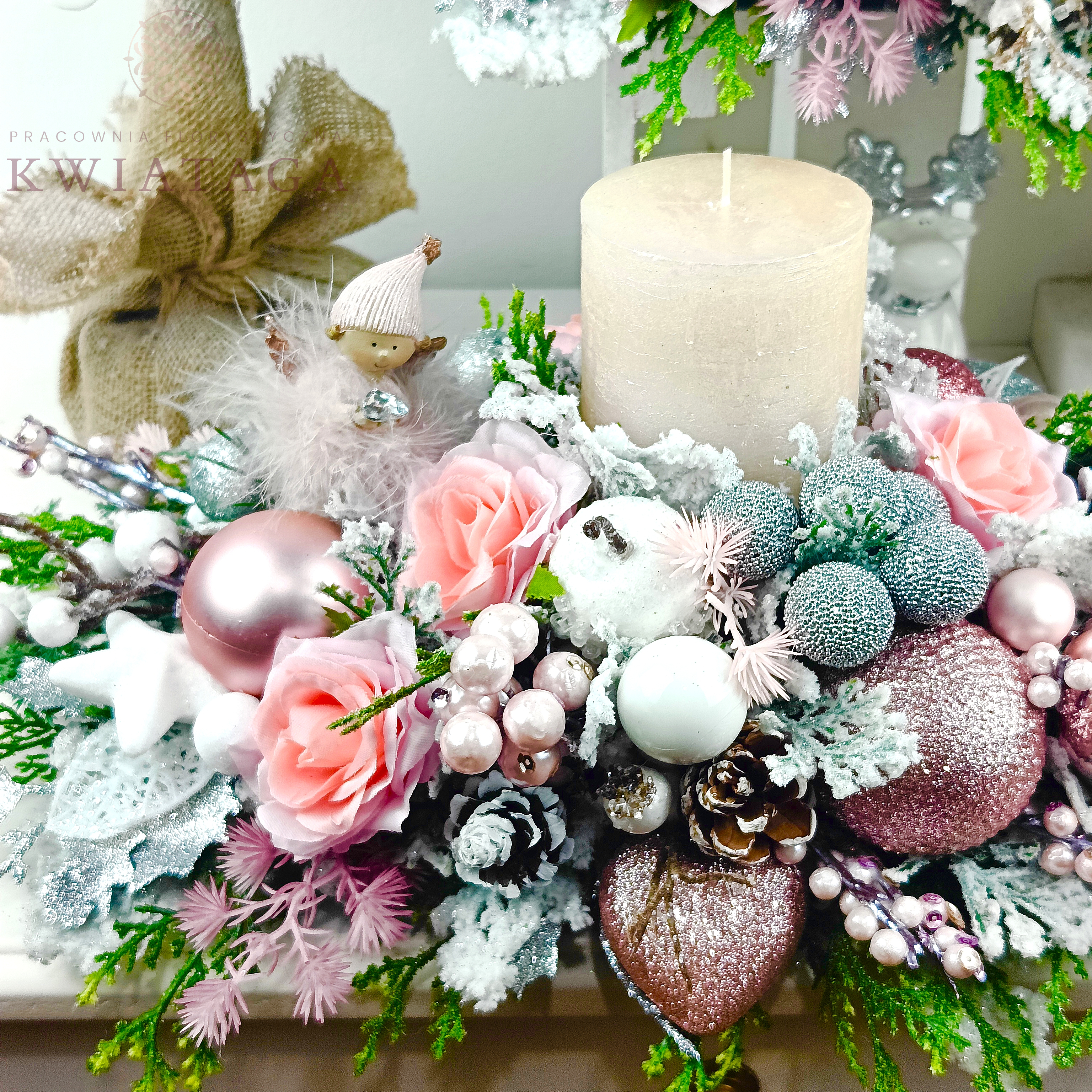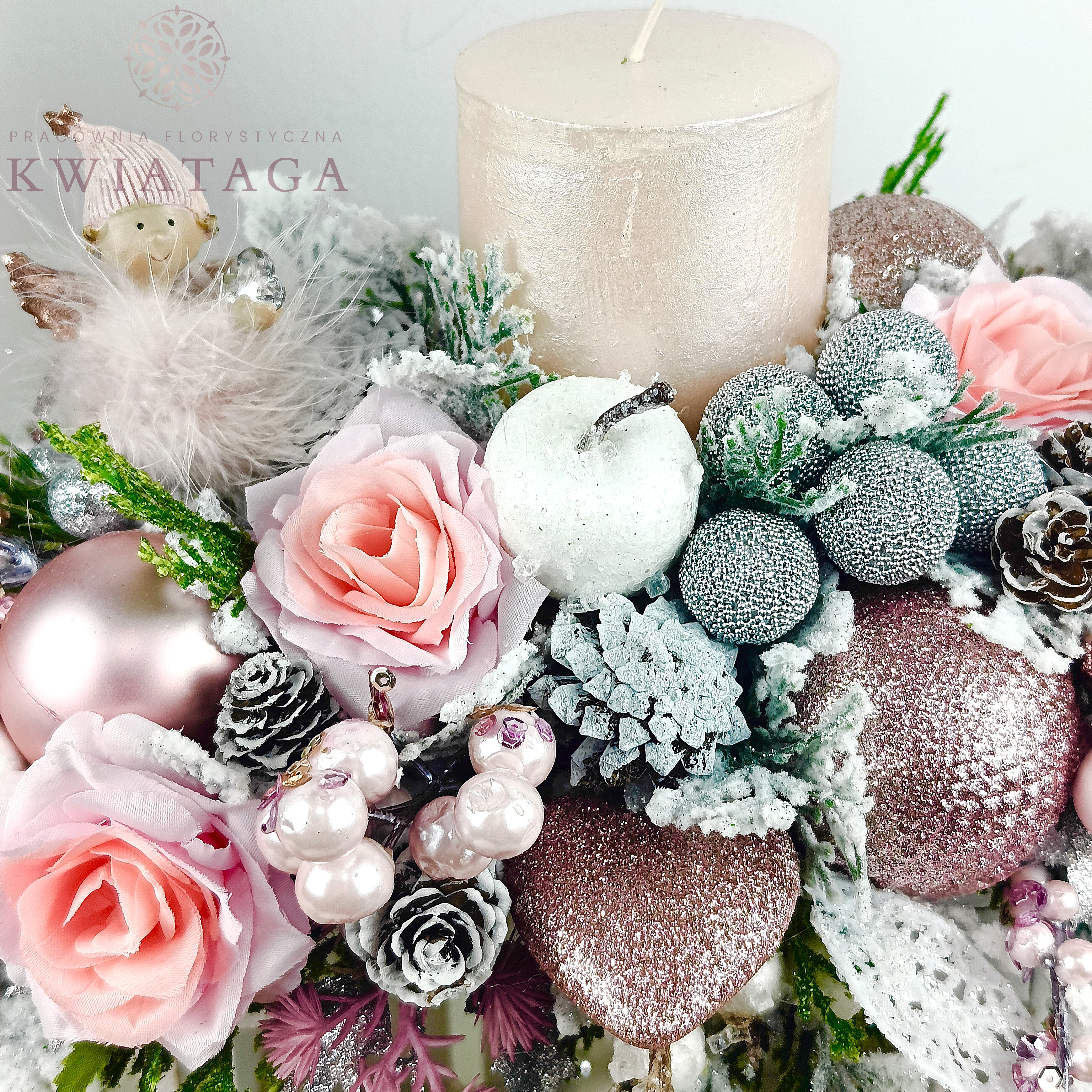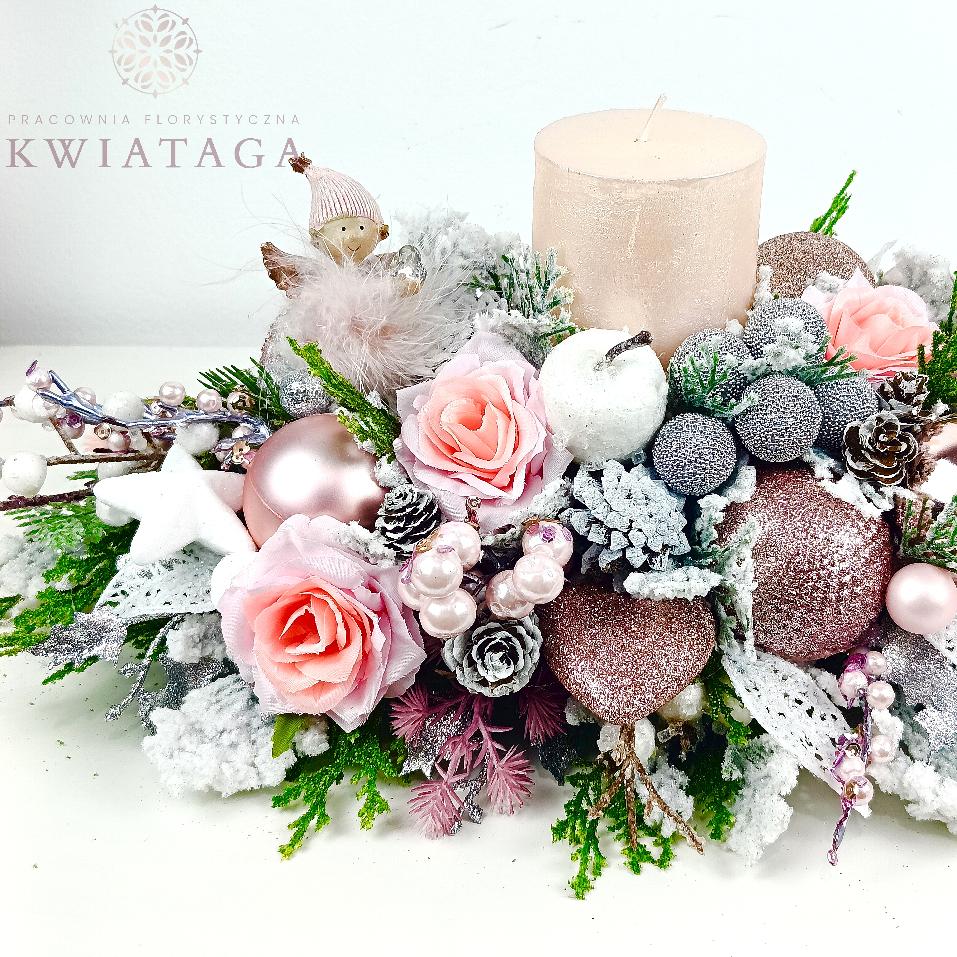 Elegancki, wydłużony stroik w kolorach pastelowego różu, bieli i srebra. Wykonany jest z wysokiej jakości sztucznego świerku i ozdobnych gałązek, bogato zdobiony szklanymi i plastikowymi bombkami ,kwiatami różowych róż, uzupełniony różnorodnymi elementami dekoracyjnymi. Punktem centralnym kompozycji świątecznej jest blado różowa świeca oraz figurka małego, różowego skrzata, zaś podstawą jest plastikowy podstawek.