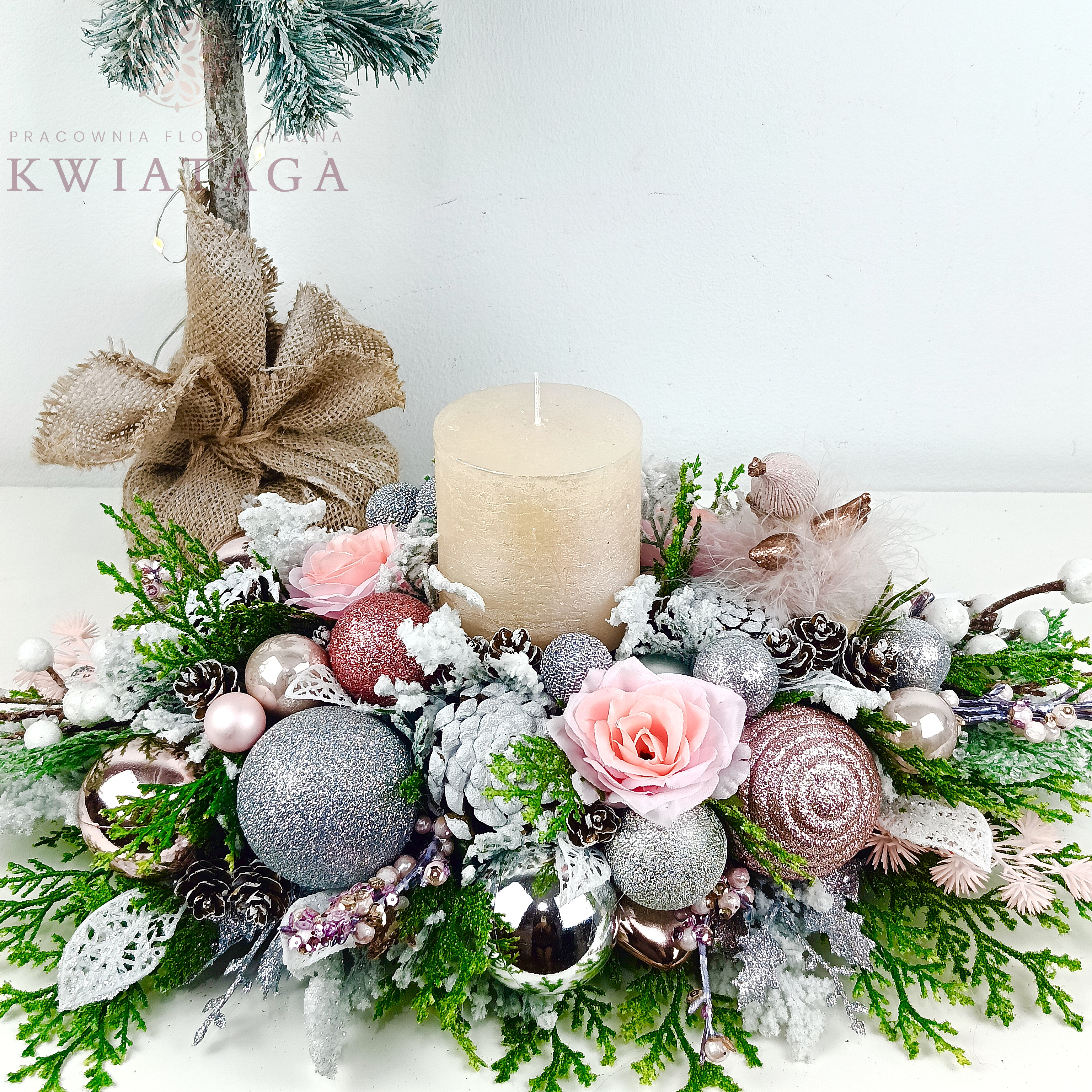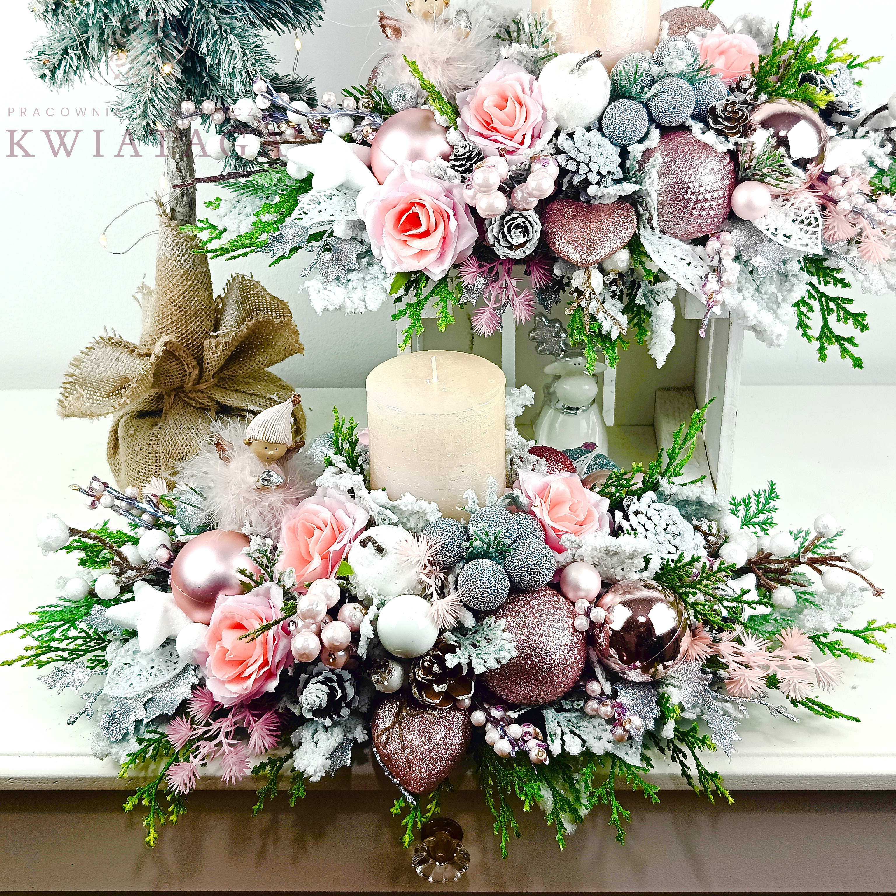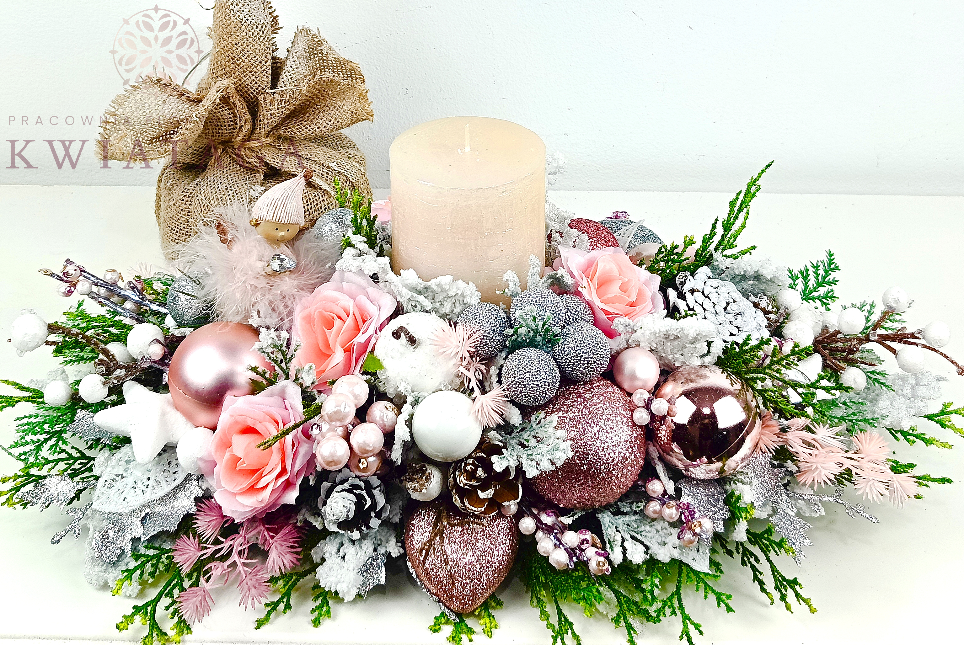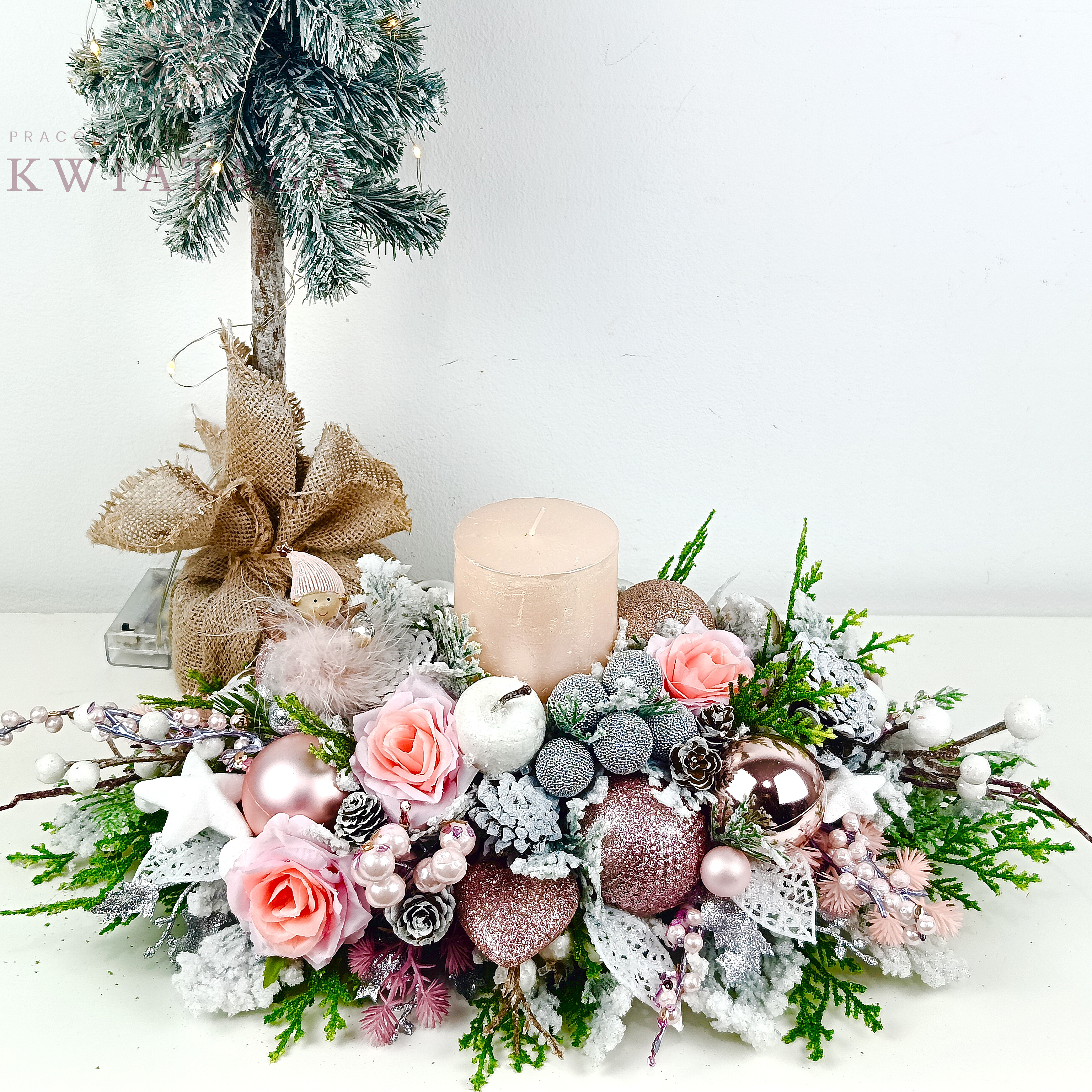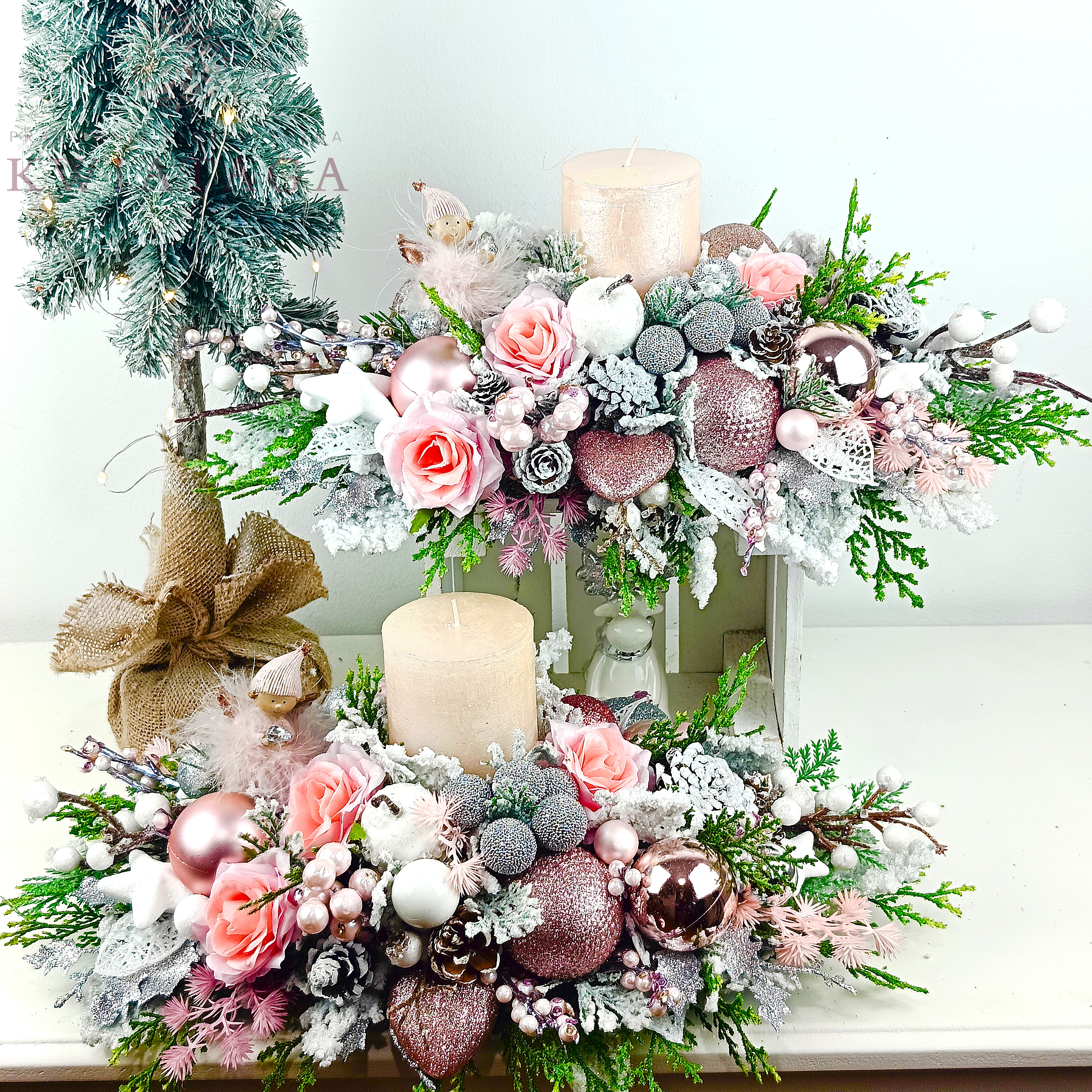 Elegancki, wydłużony stroik w kolorach pastelowego różu, bieli i srebra. Wykonany jest z wysokiej jakości sztucznego świerku i ozdobnych gałązek, bogato zdobiony szklanymi i plastikowymi bombkami ,kwiatami różowych róż, uzupełniony różnorodnymi elementami dekoracyjnymi. Punktem centralnym kompozycji świątecznej jest blado różowa świeca oraz figurka małego, różowego skrzata, zaś podstawą jest plastikowy podstawek.