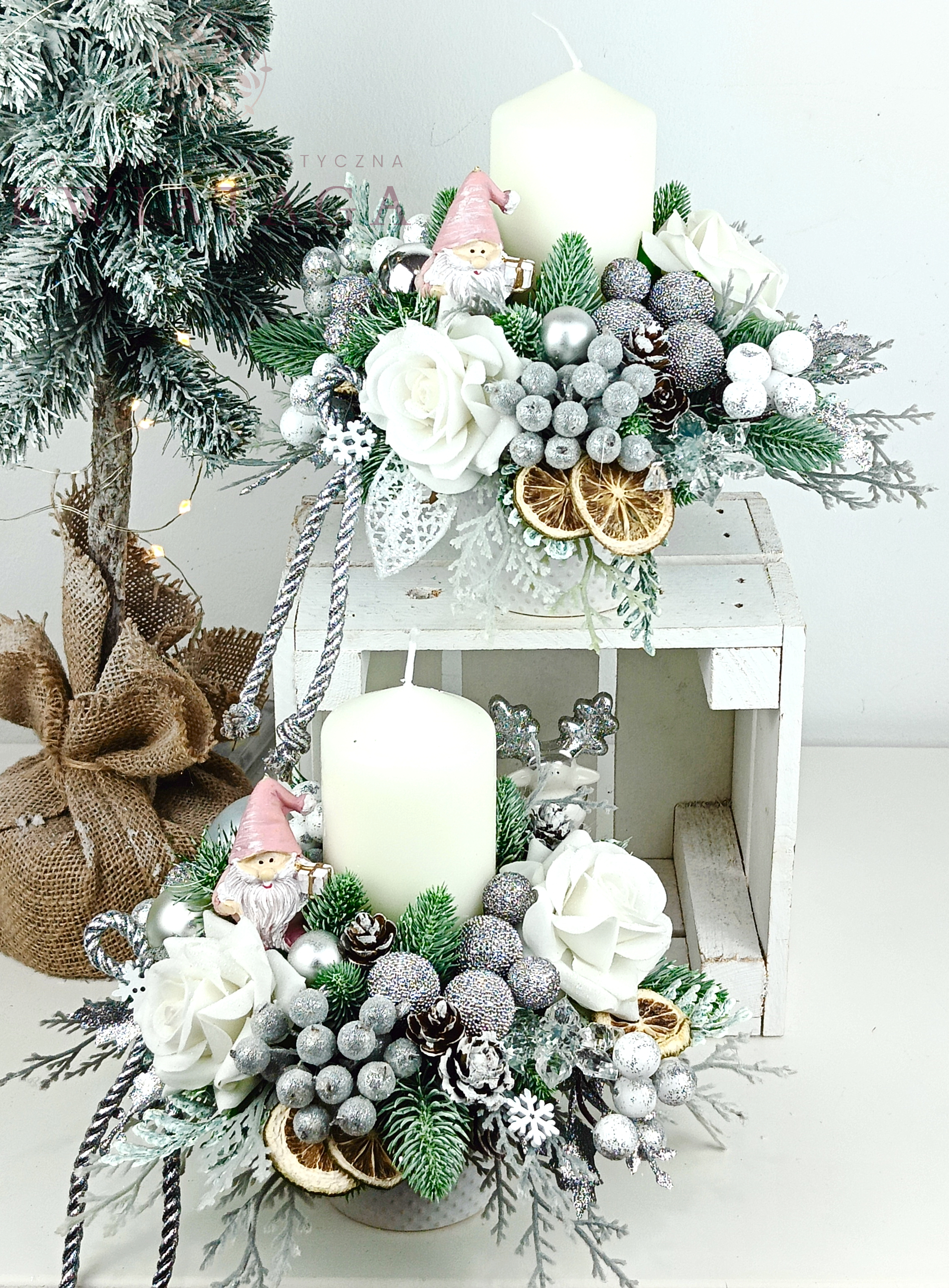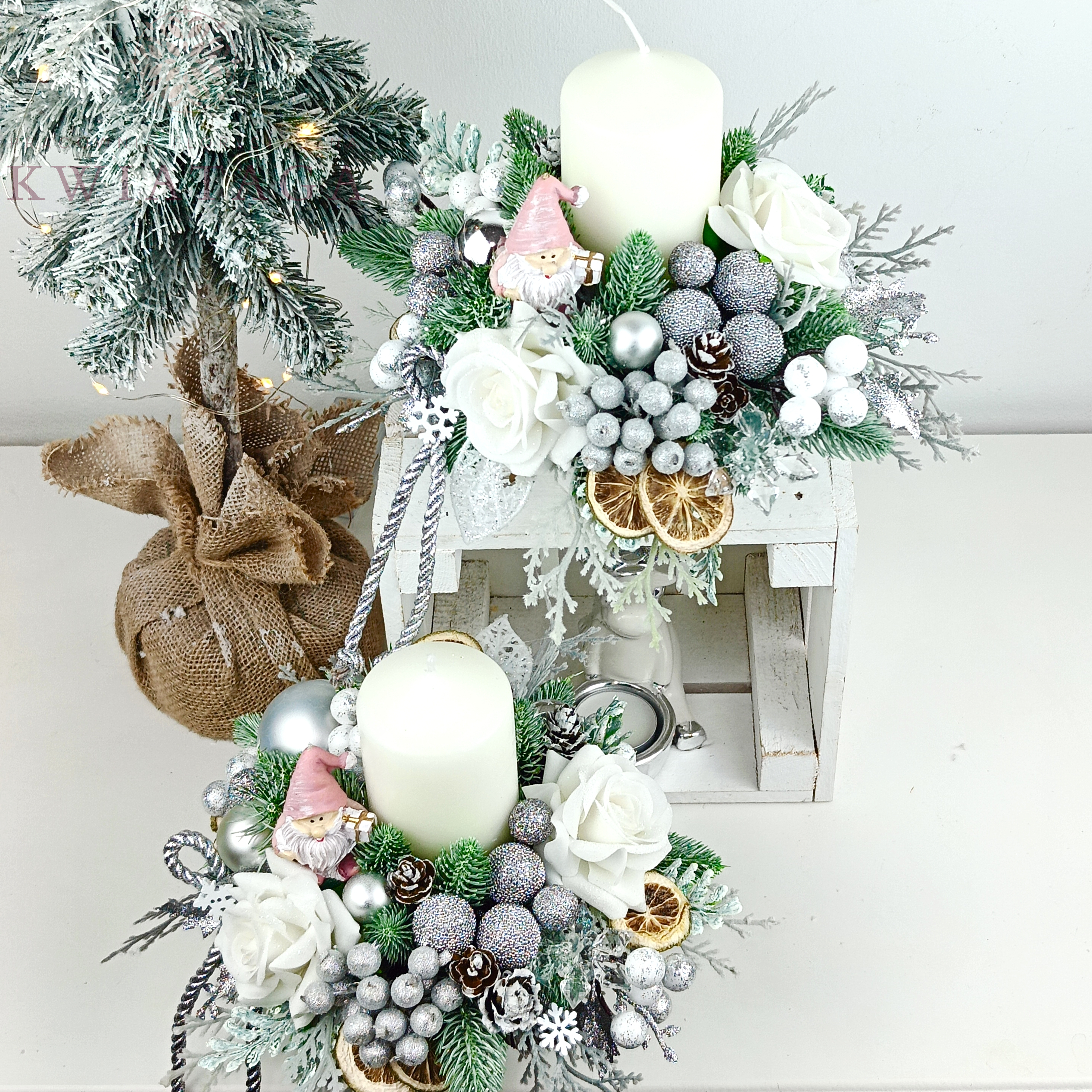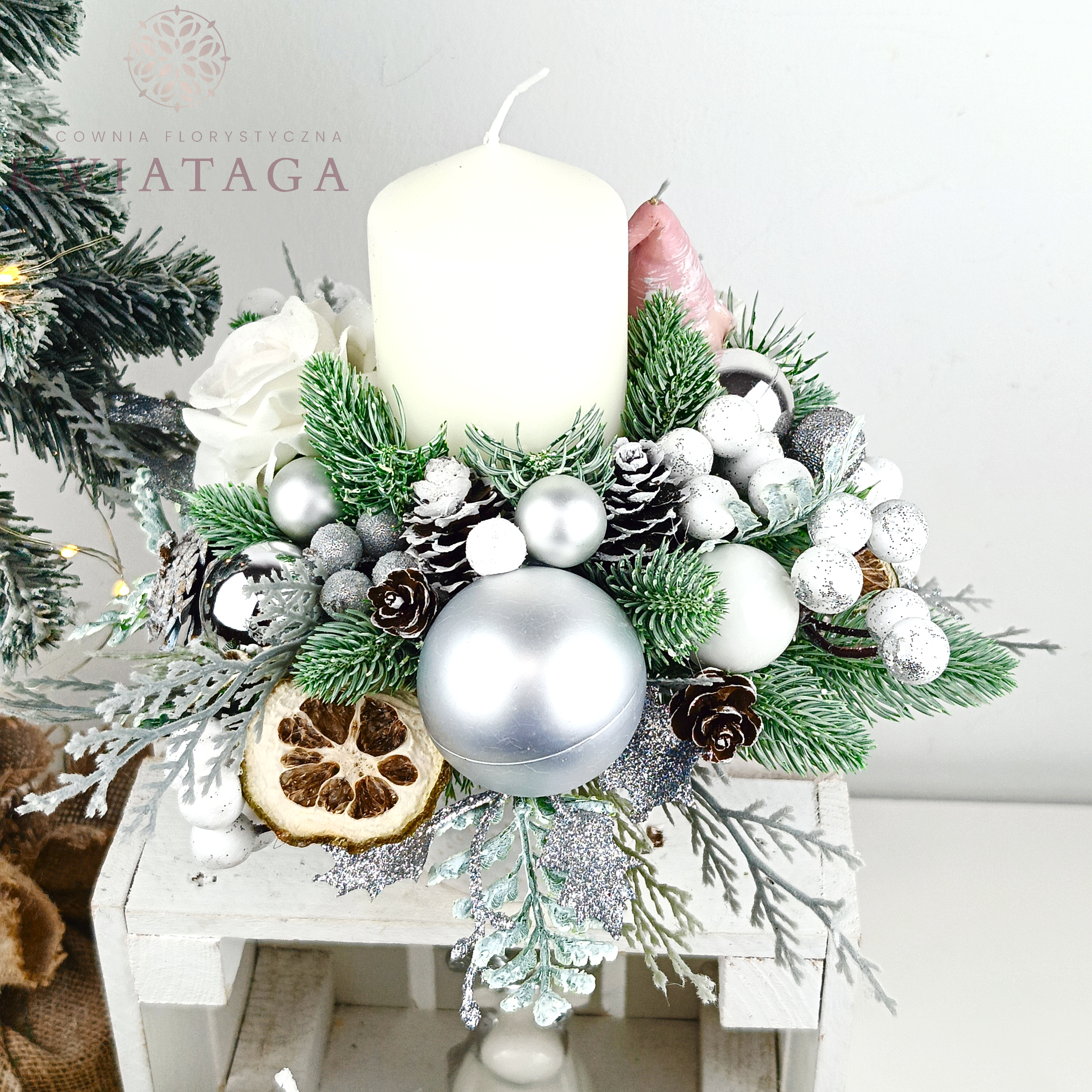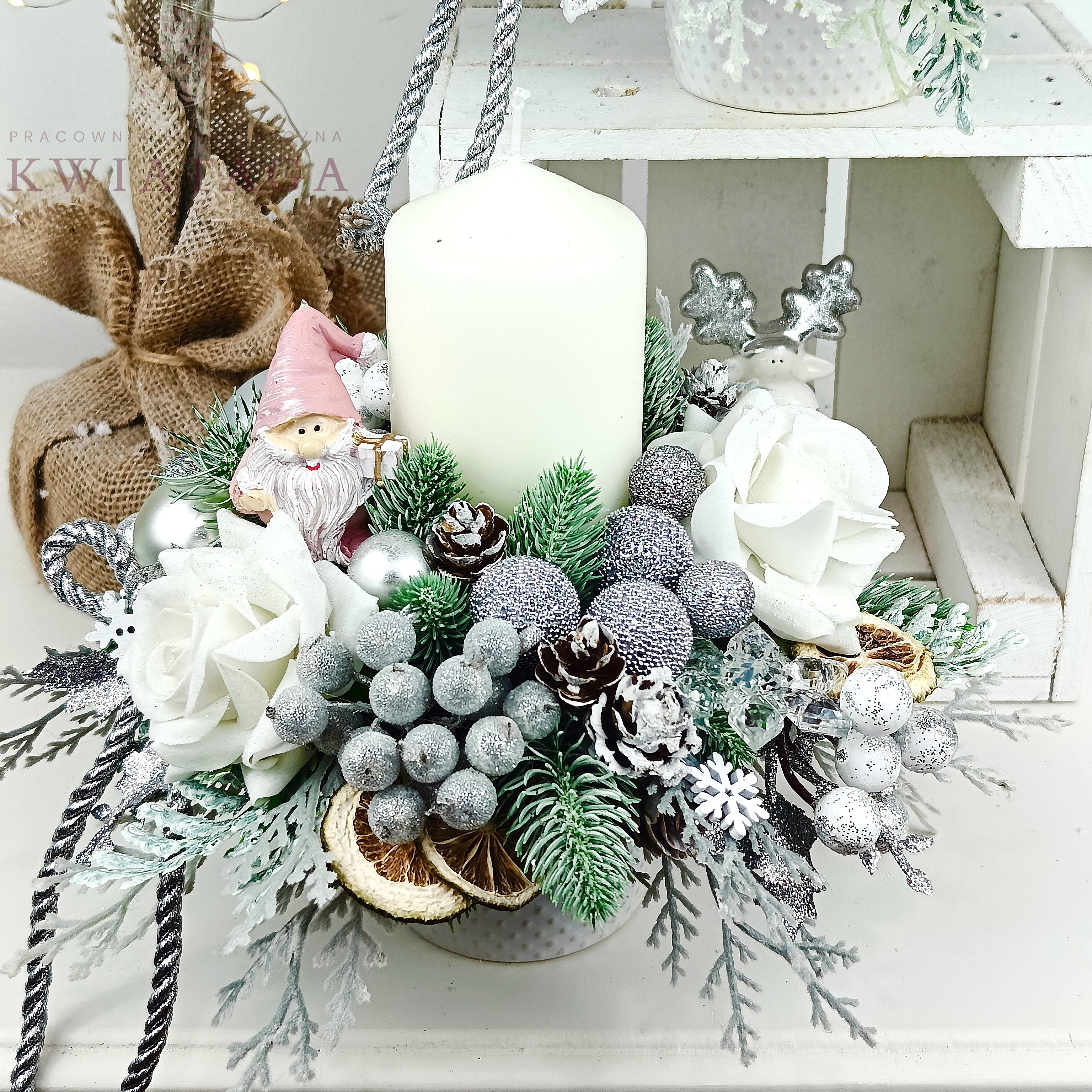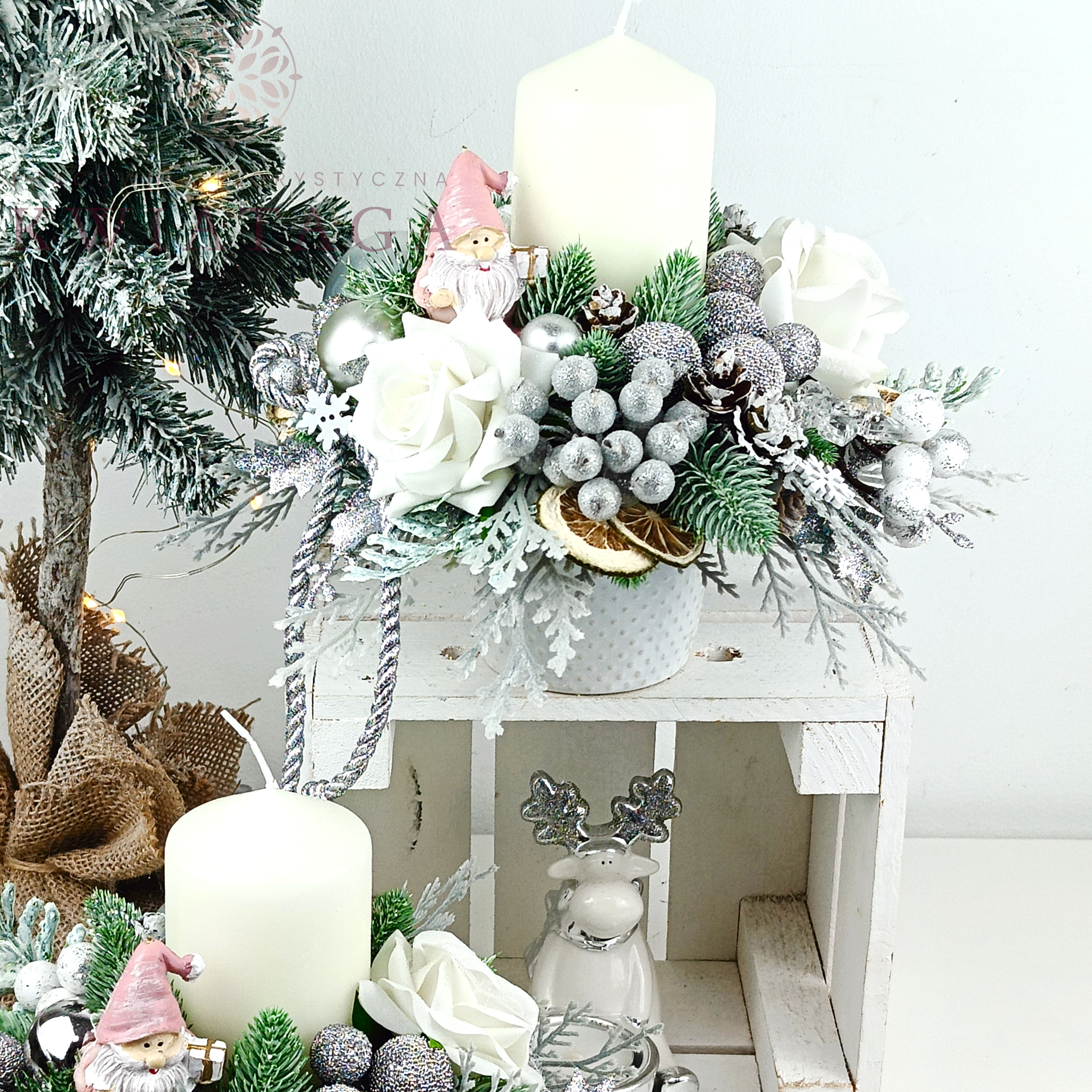 Elegancki, okrągły stroik w kolorach bieli, srebra i pastelowej zieleni. Wykonany jest z wysokiej jakości sztucznego, ośnieżonego igliwia, brokatowych i ozdobnych gałązek. Zdobiony szklanymi i plastikowymi bombkami, kwiatami brokatowej róży, uzupełniony różnorodnymi elementami dekoracyjnymi. Punktem centralnym kompozycji jest biała świeca i figurka słodkiego, różowego mikołajka, zaś podstawą jest białe, ceramiczne naczynie o szerokości 6,5cm.