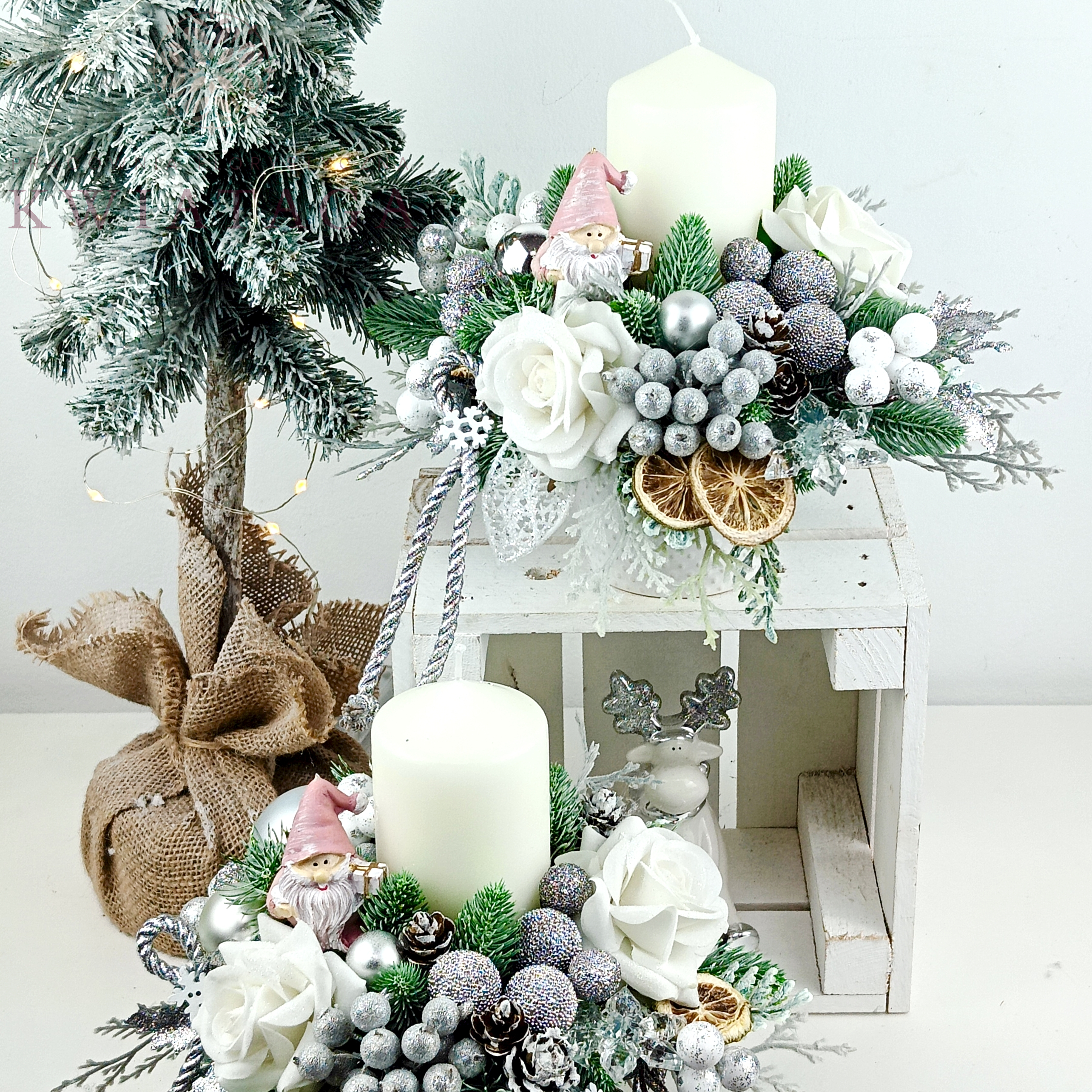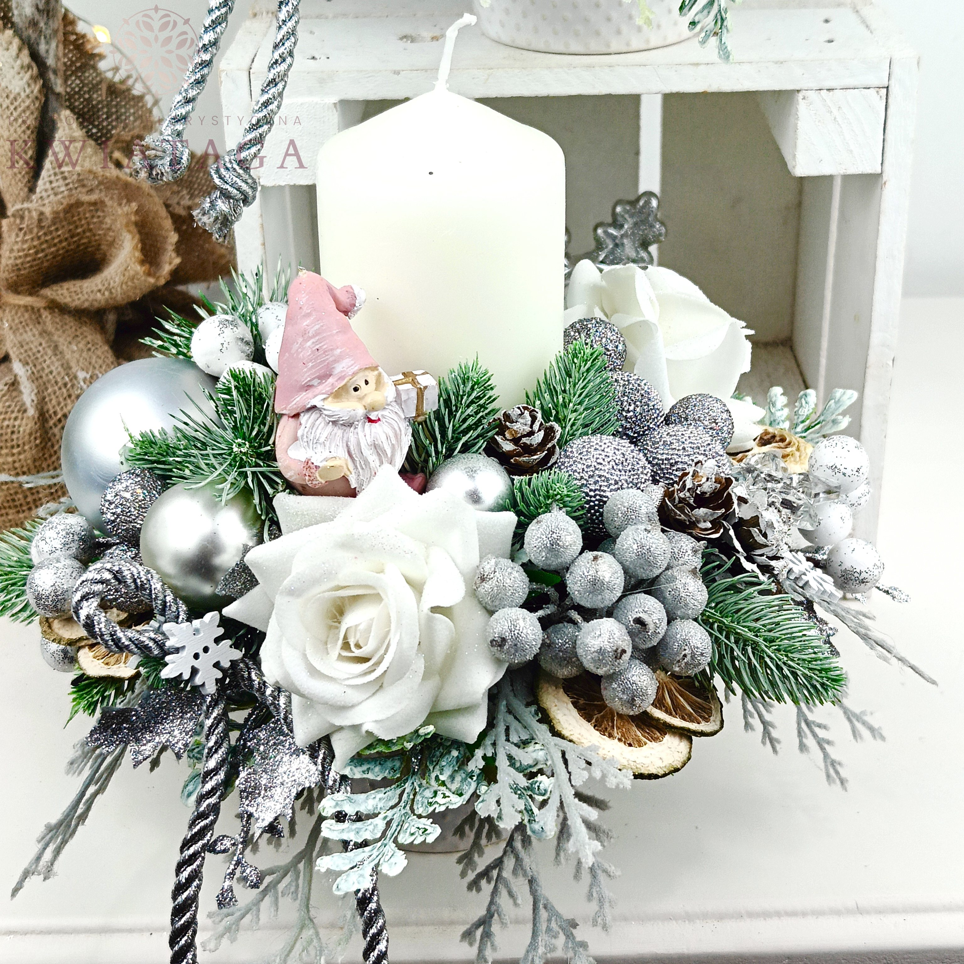 Strona główna » Florystyka z kwiatów sztucznych wysokiej jakości » Boże Narodzenie » Stroiki świąteczne » Stroik biało - srebrny z mikołajkiem nr 60