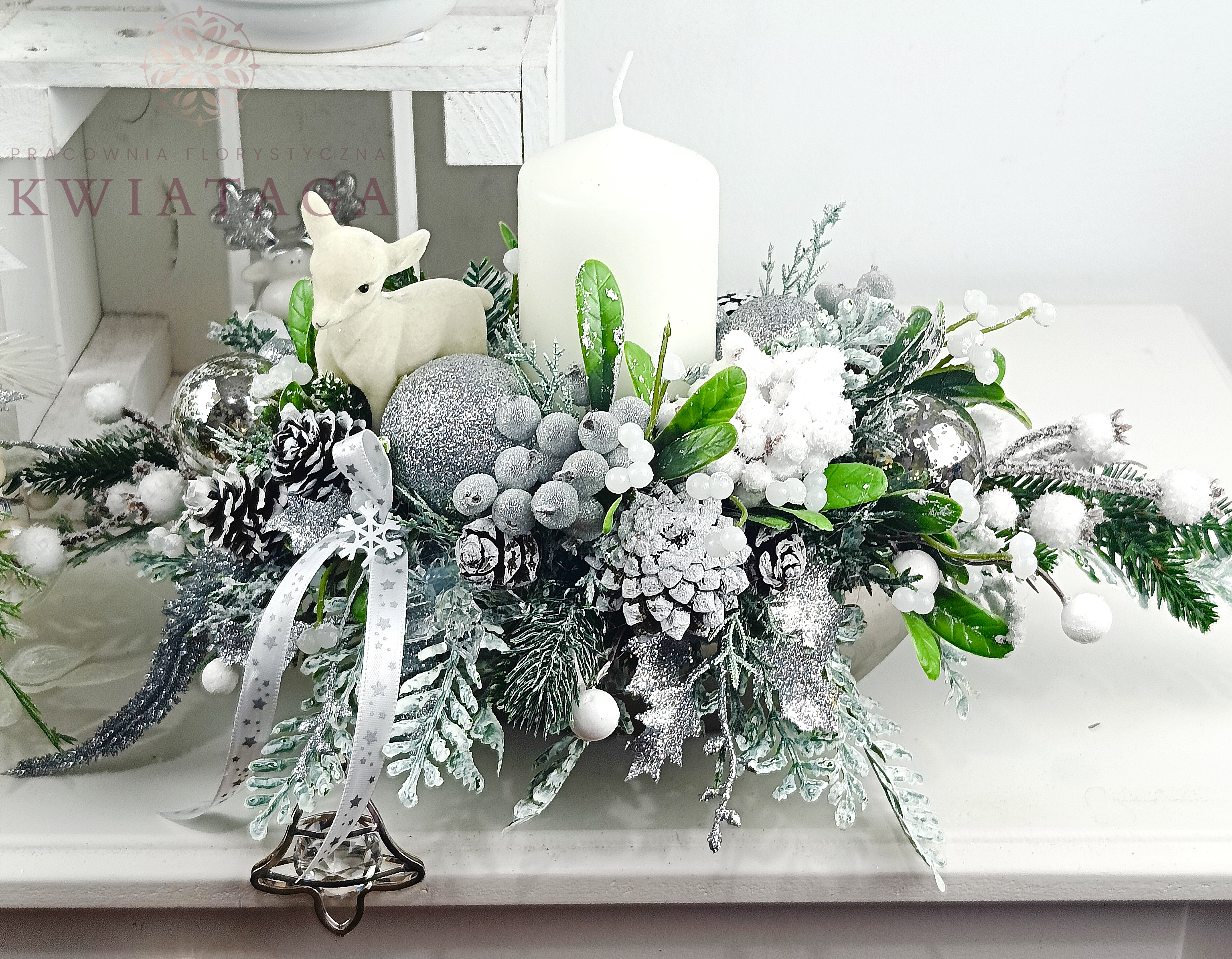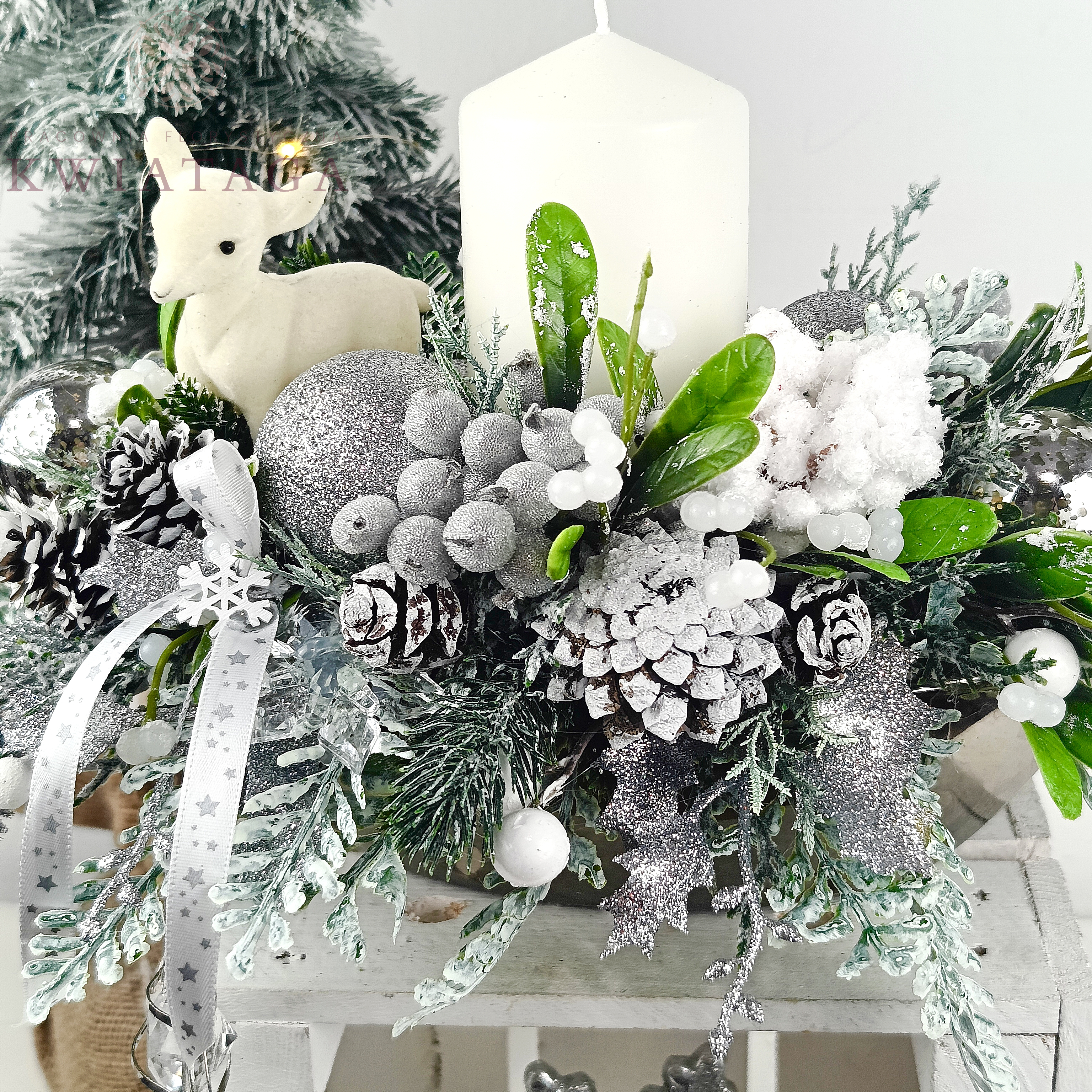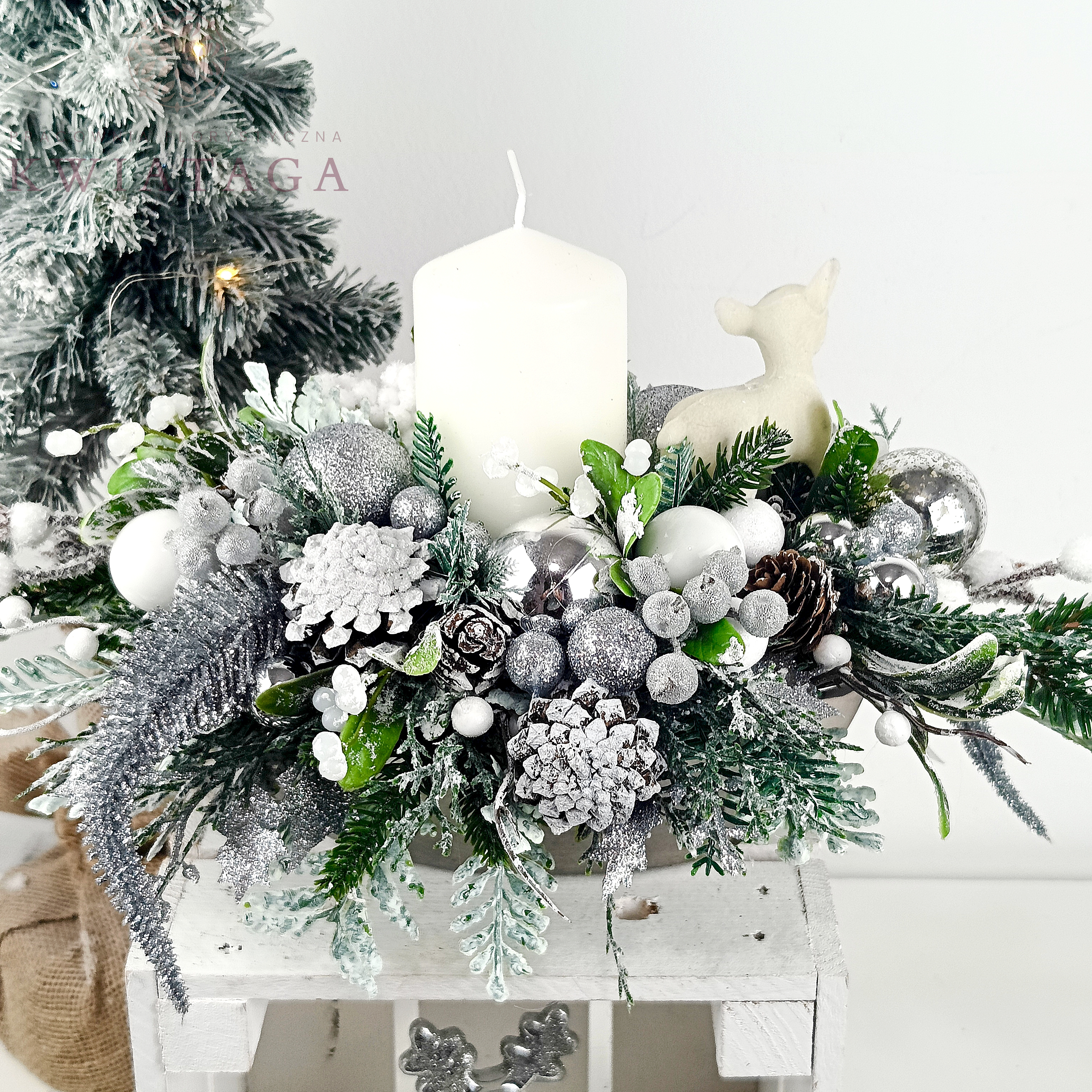 Elegancki, wydłużony stroik w kolorach bieli i srebra. Wykonany jest z wysokiej jakości sztucznego igliwia, brokatowych i ozdobnych gałązek. Zdobiony szklanymi i plastikowymi bombkami, uzupełniony różnorodnymi elementami dekoracyjnymi. Punktem centralnym kompozycji jest biała świeca, i figurka sarenki, zaś podstawą jest ceramiczne, srebrne naczynie.