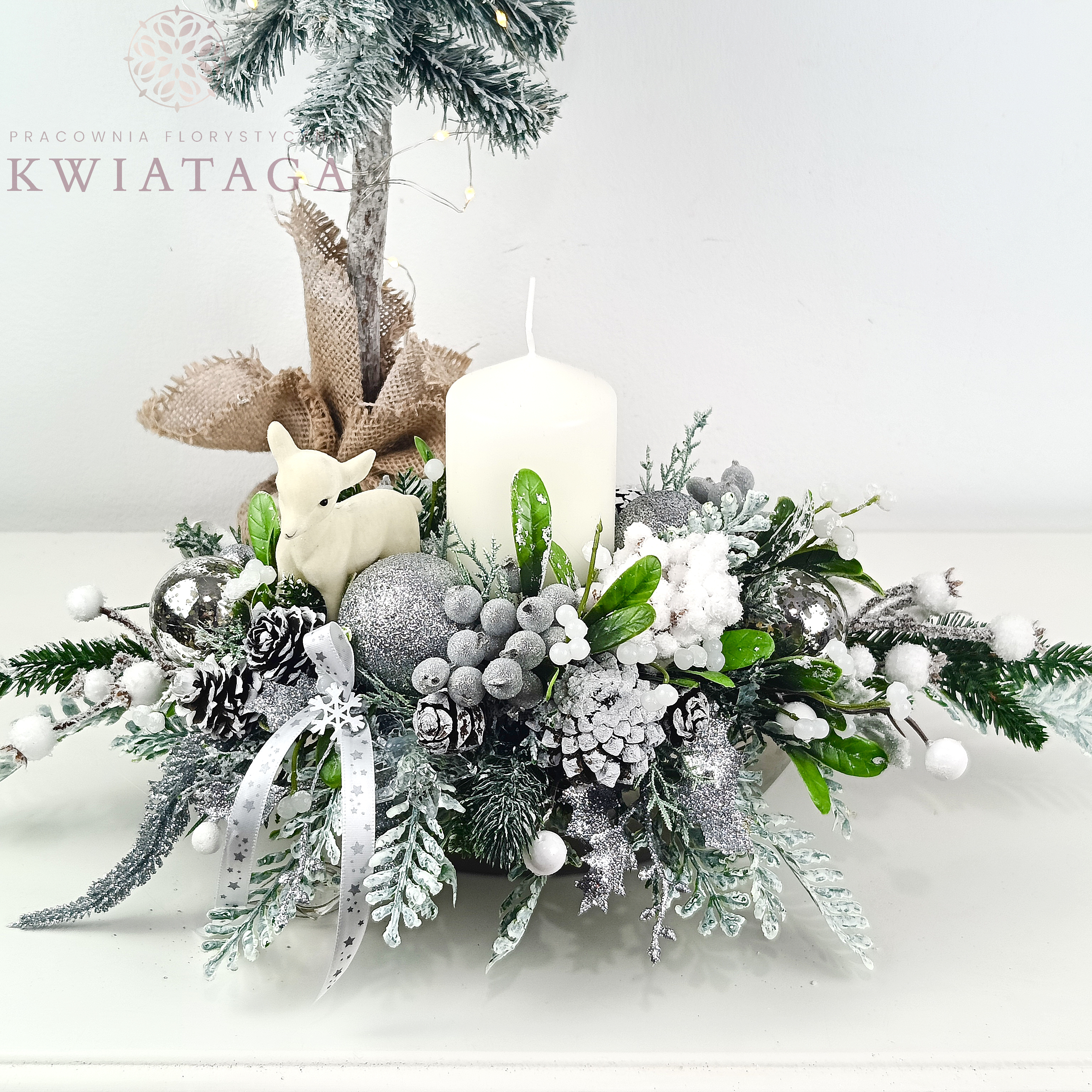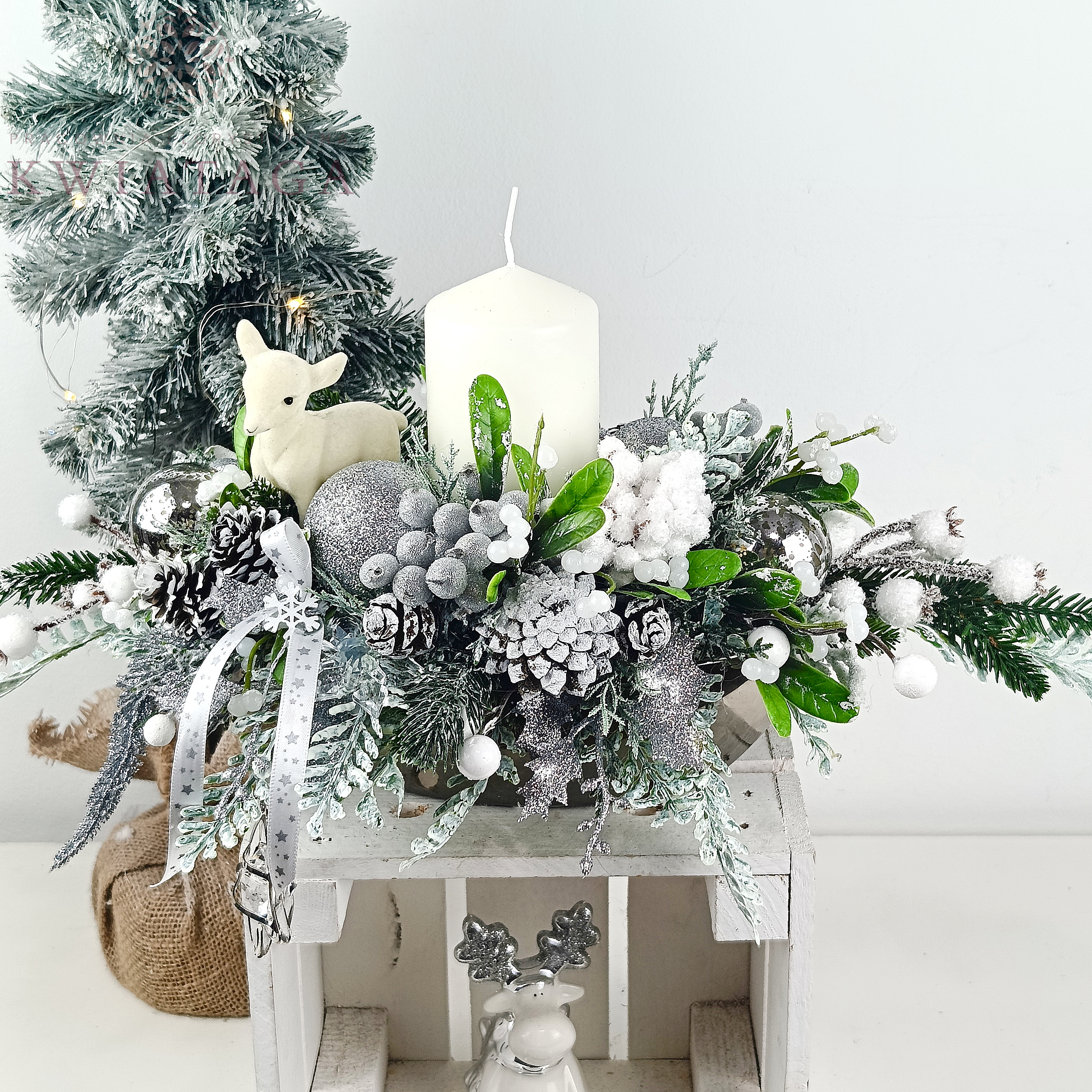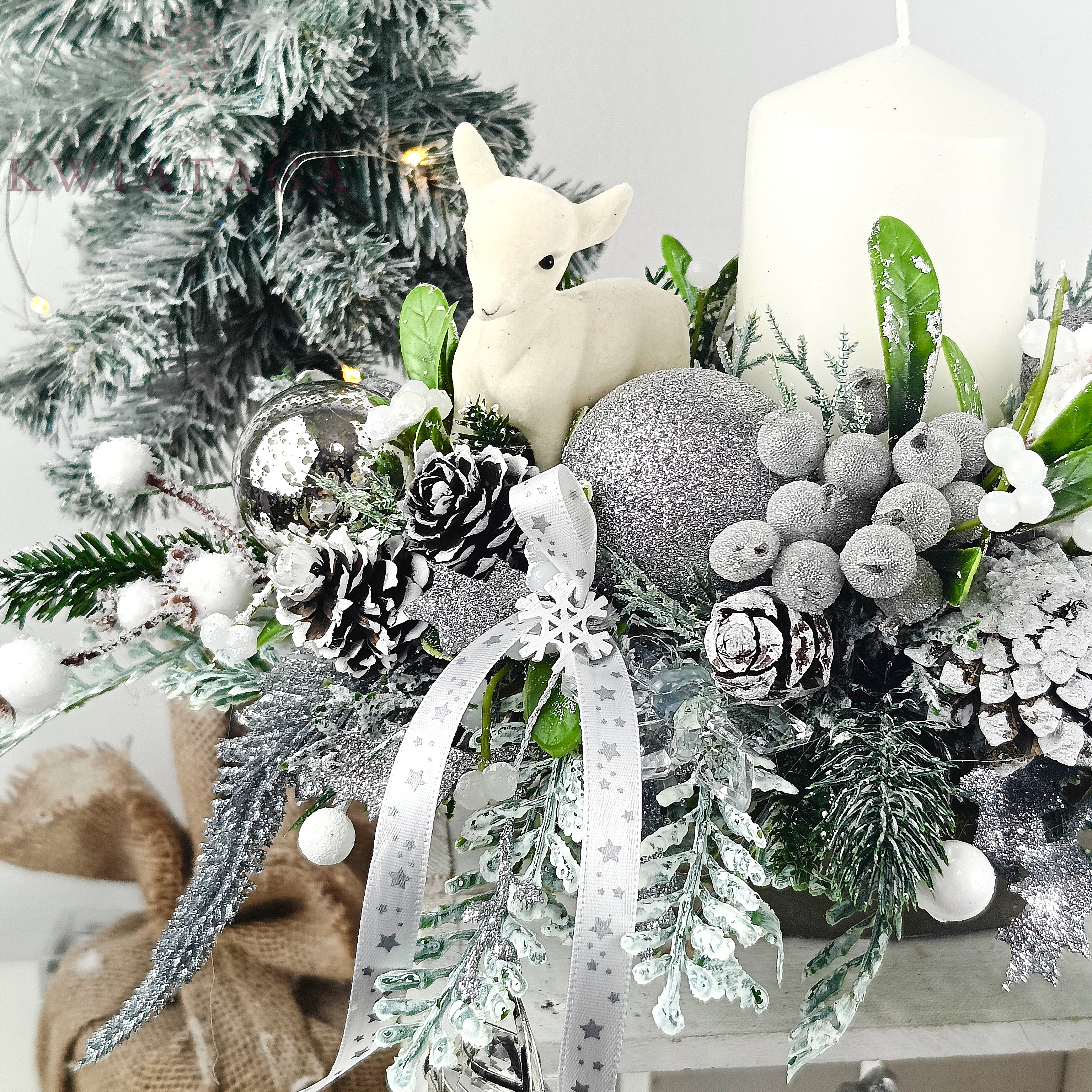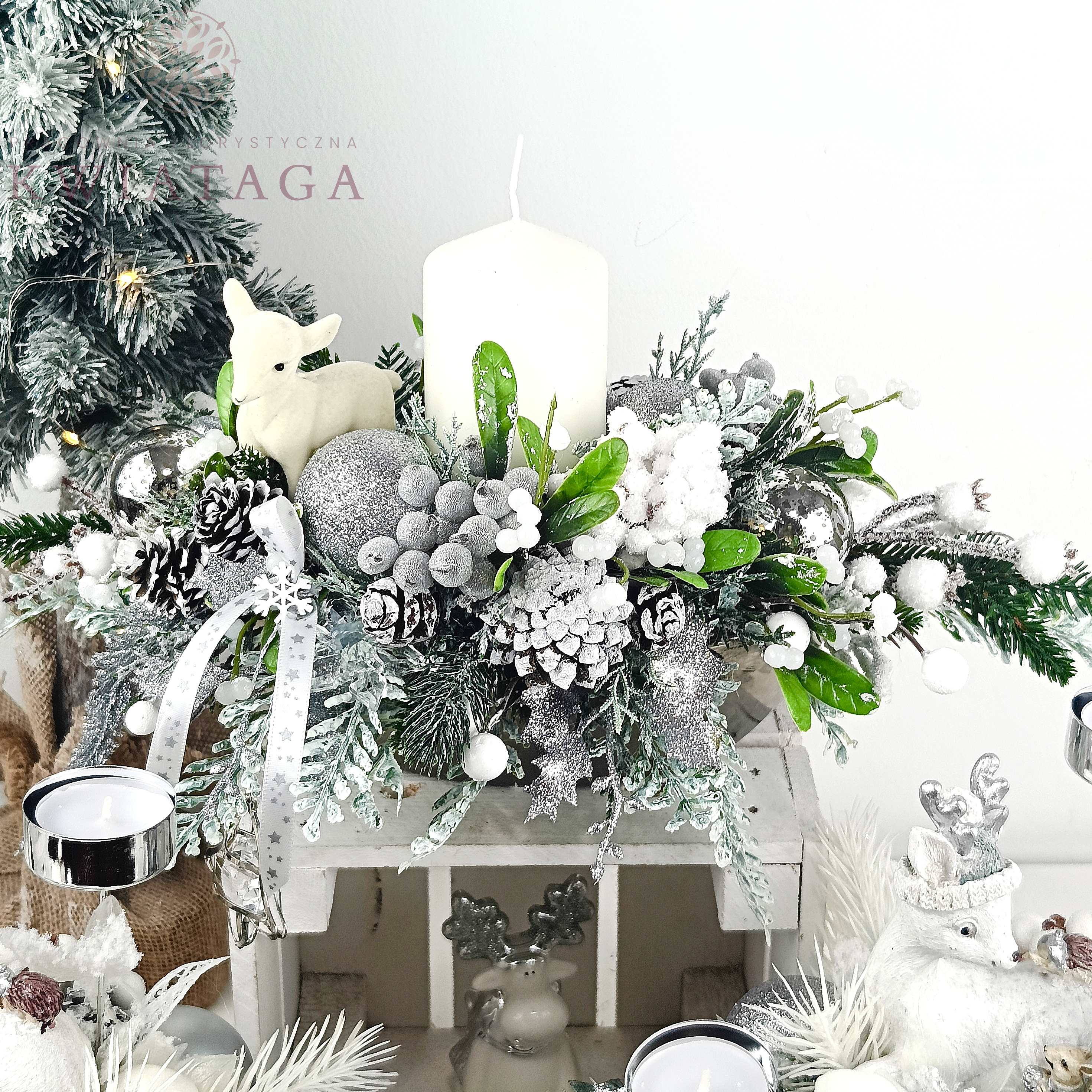 Elegancki, wydłużony stroik w kolorach bieli i srebra. Wykonany jest z wysokiej jakości sztucznego igliwia, brokatowych i ozdobnych gałązek. Zdobiony szklanymi i plastikowymi bombkami, uzupełniony różnorodnymi elementami dekoracyjnymi. Punktem centralnym kompozycji jest biała świeca, i figurka sarenki, zaś podstawą jest ceramiczne, srebrne naczynie.