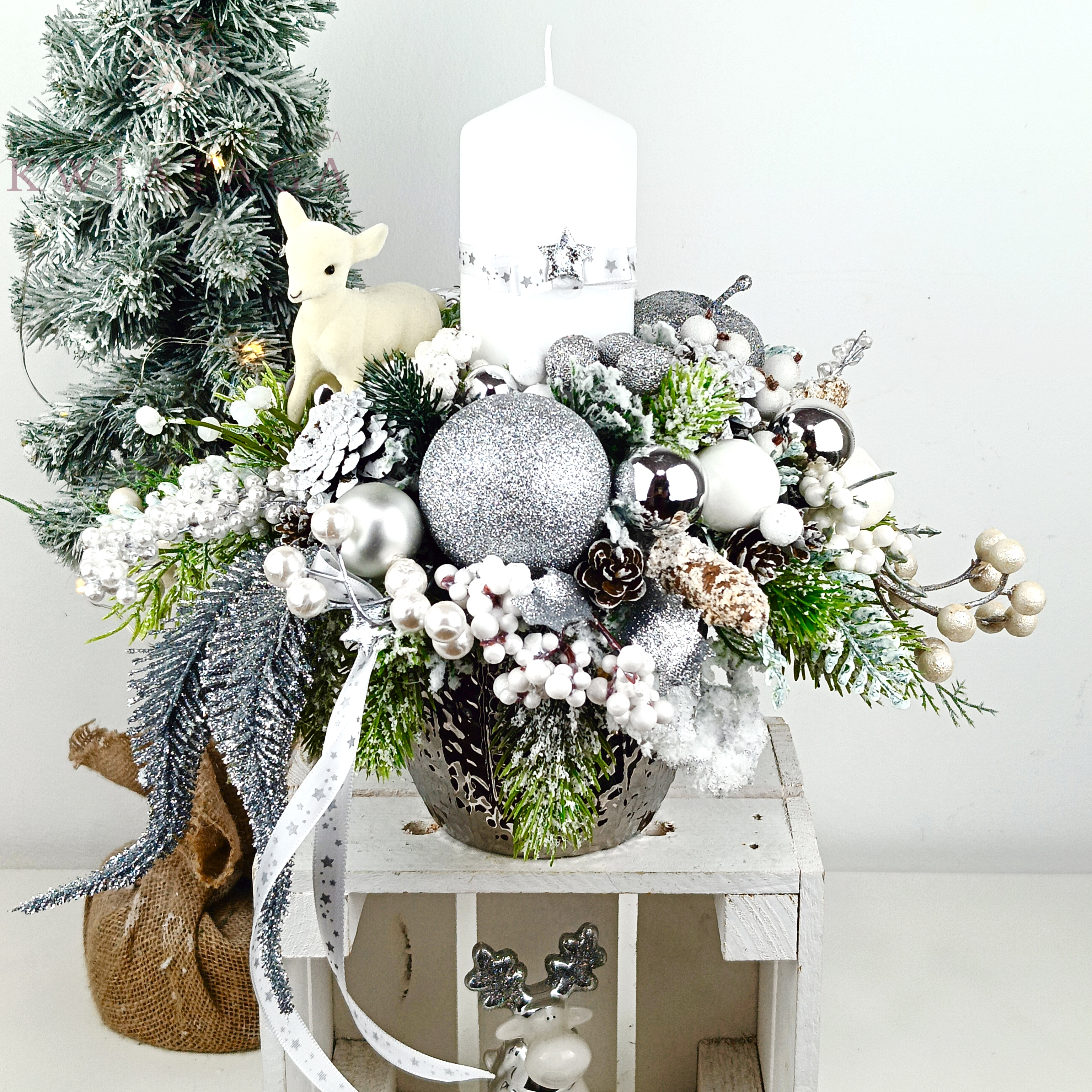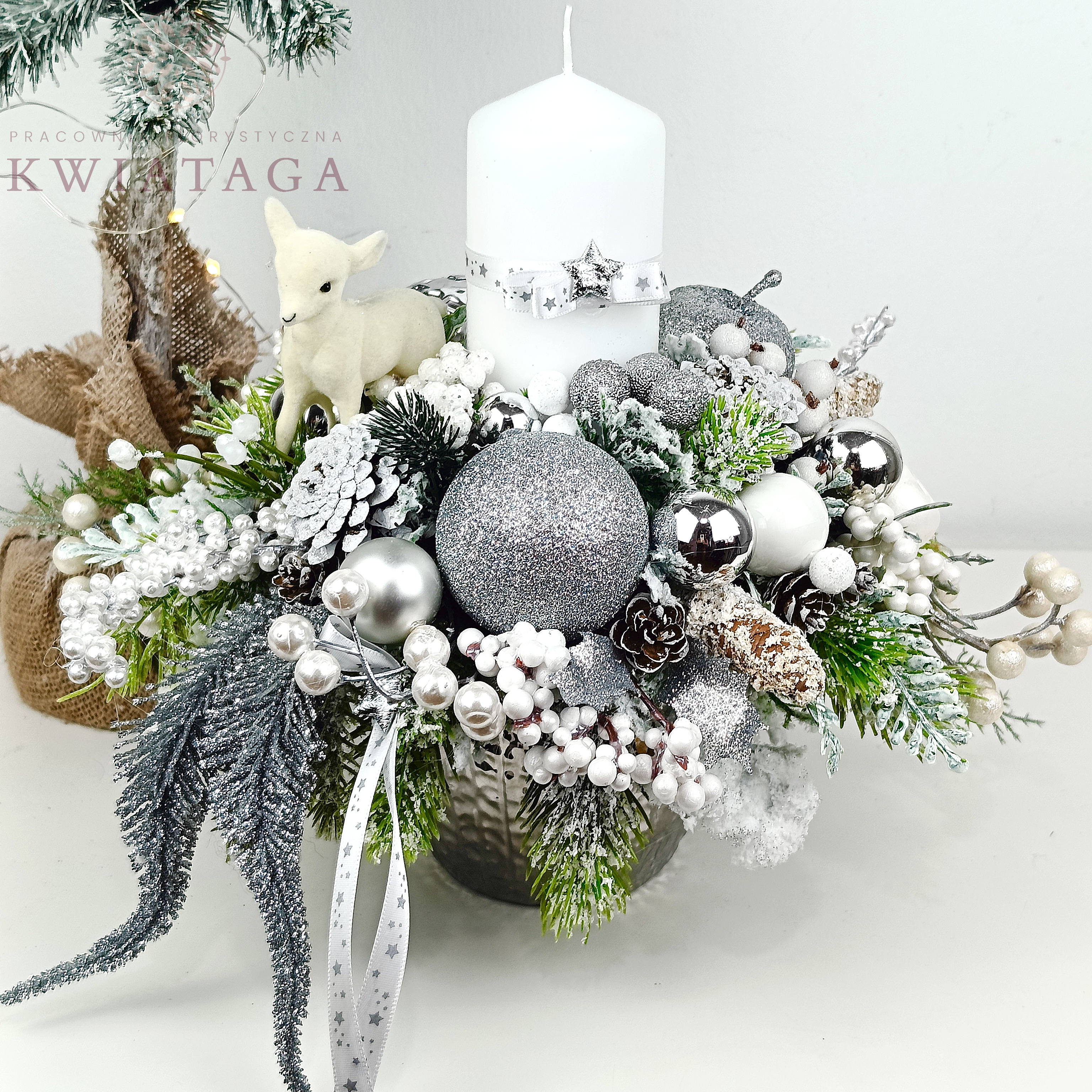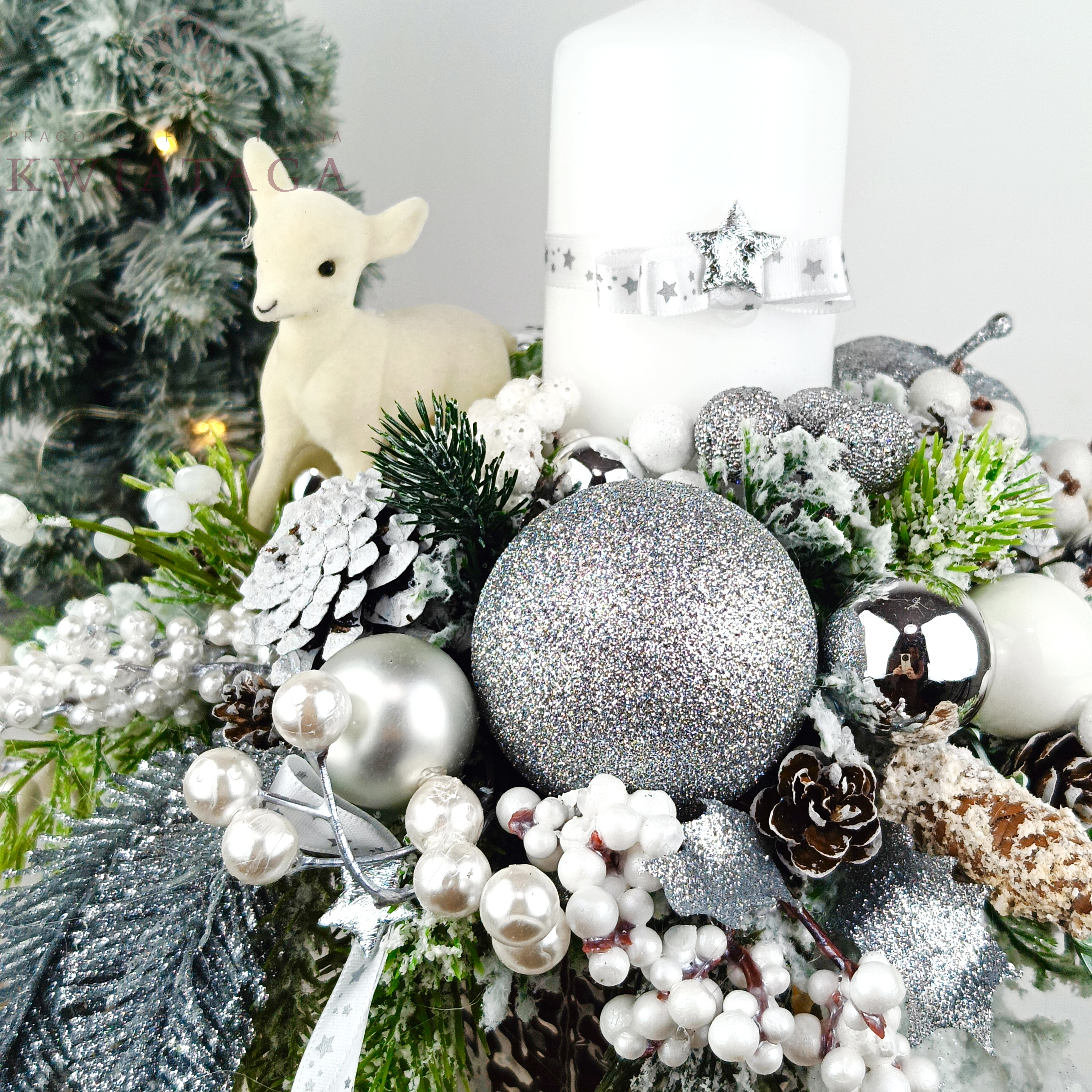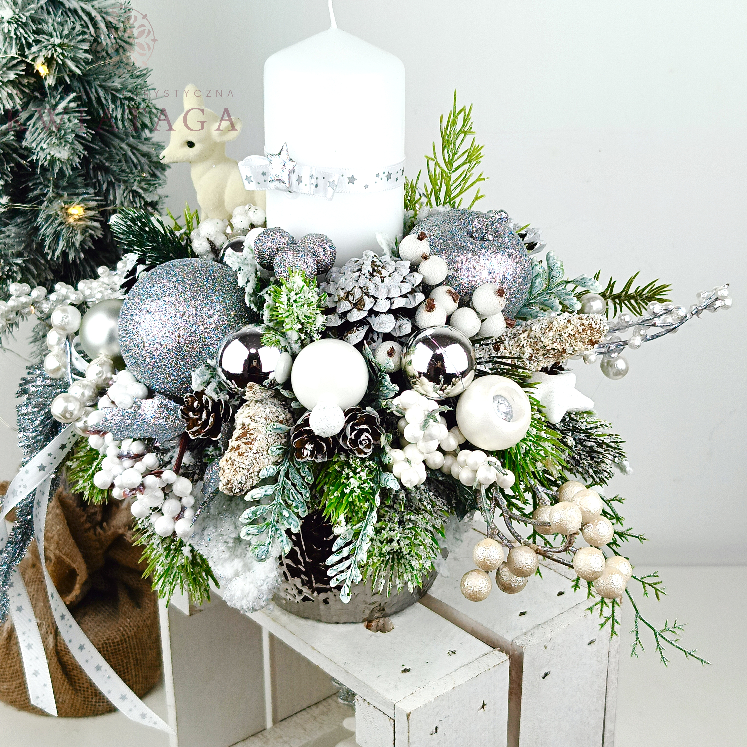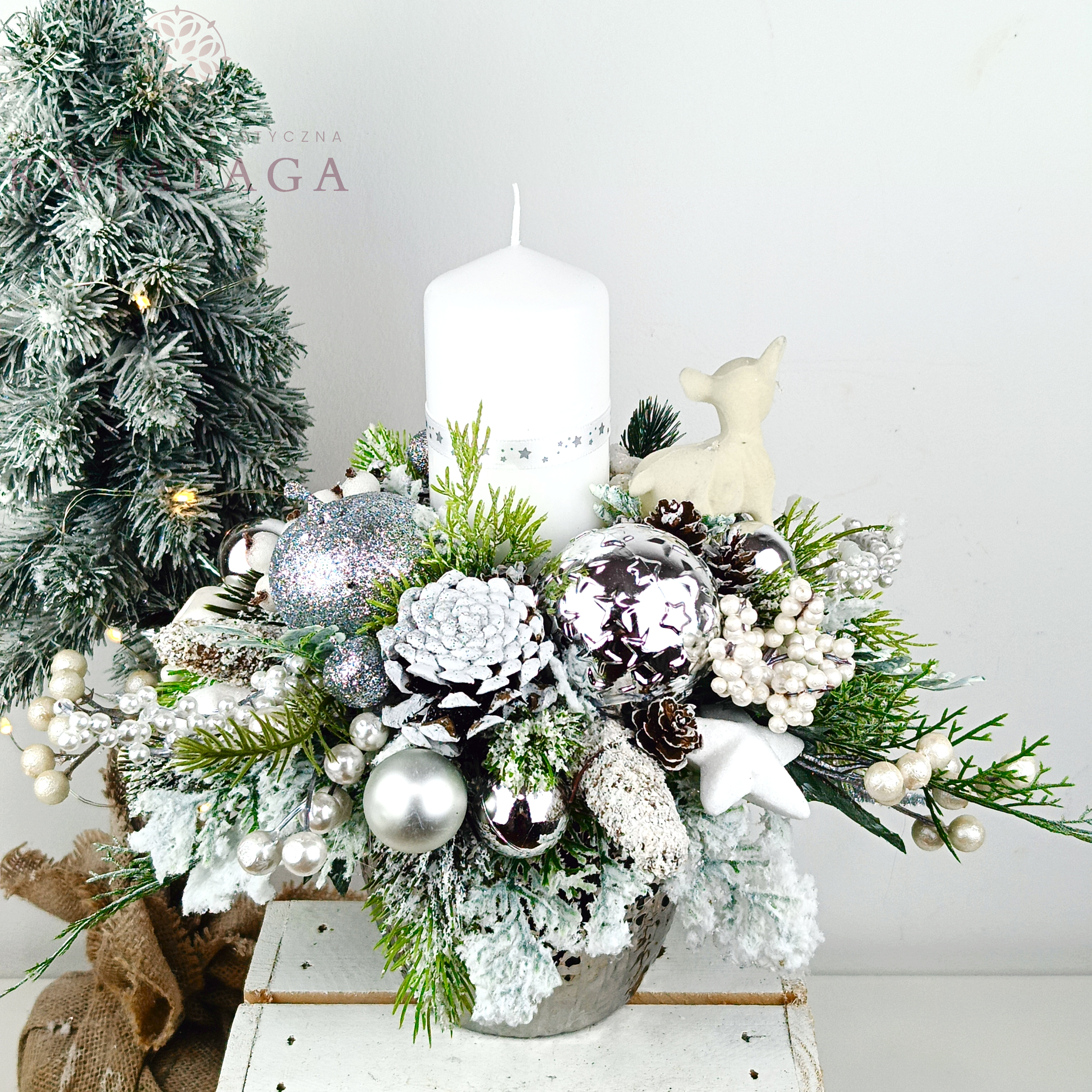 Elegancki, okrągły stroik w kolorach bieli i srebra. Wykonany jest z wysokiej jakości sztucznego, ośnieżonego igliwia, brokatowych i ozdobnych gałązek. Zdobiony szklanymi i plastikowymi bombkami, uzupełniony różnorodnymi elementami dekoracyjnymi. Punktem centralnym kompozycji jest biała świeca i słodka figurka sarenki, zaś podstawą ceramiczne, srebrne naczynie.