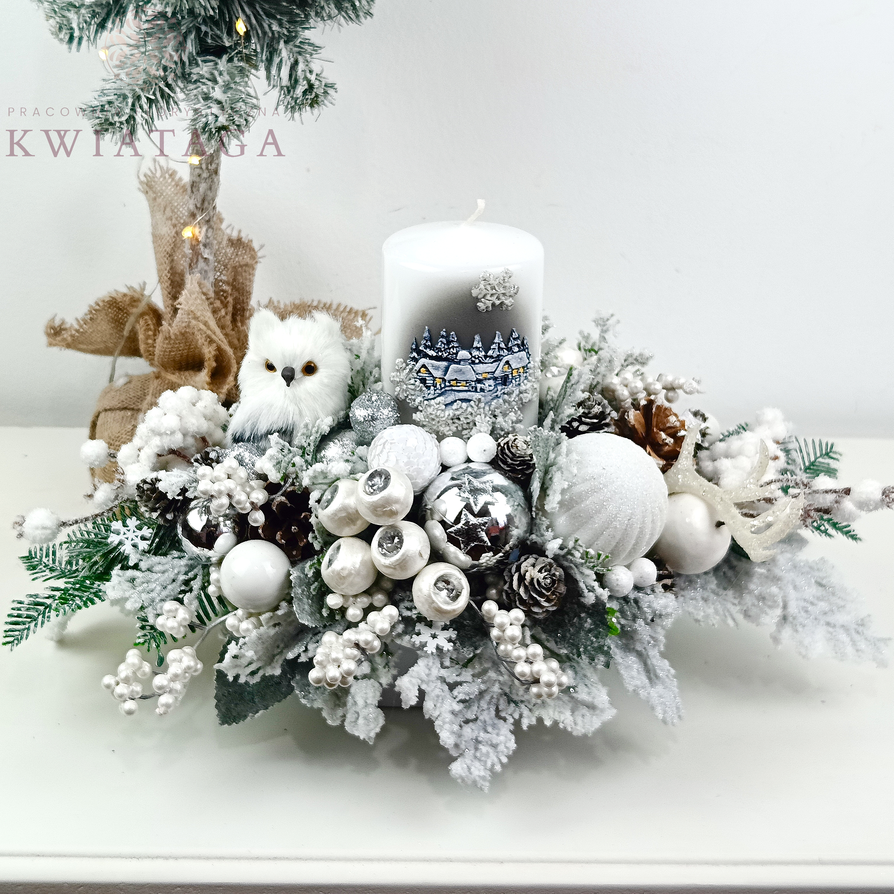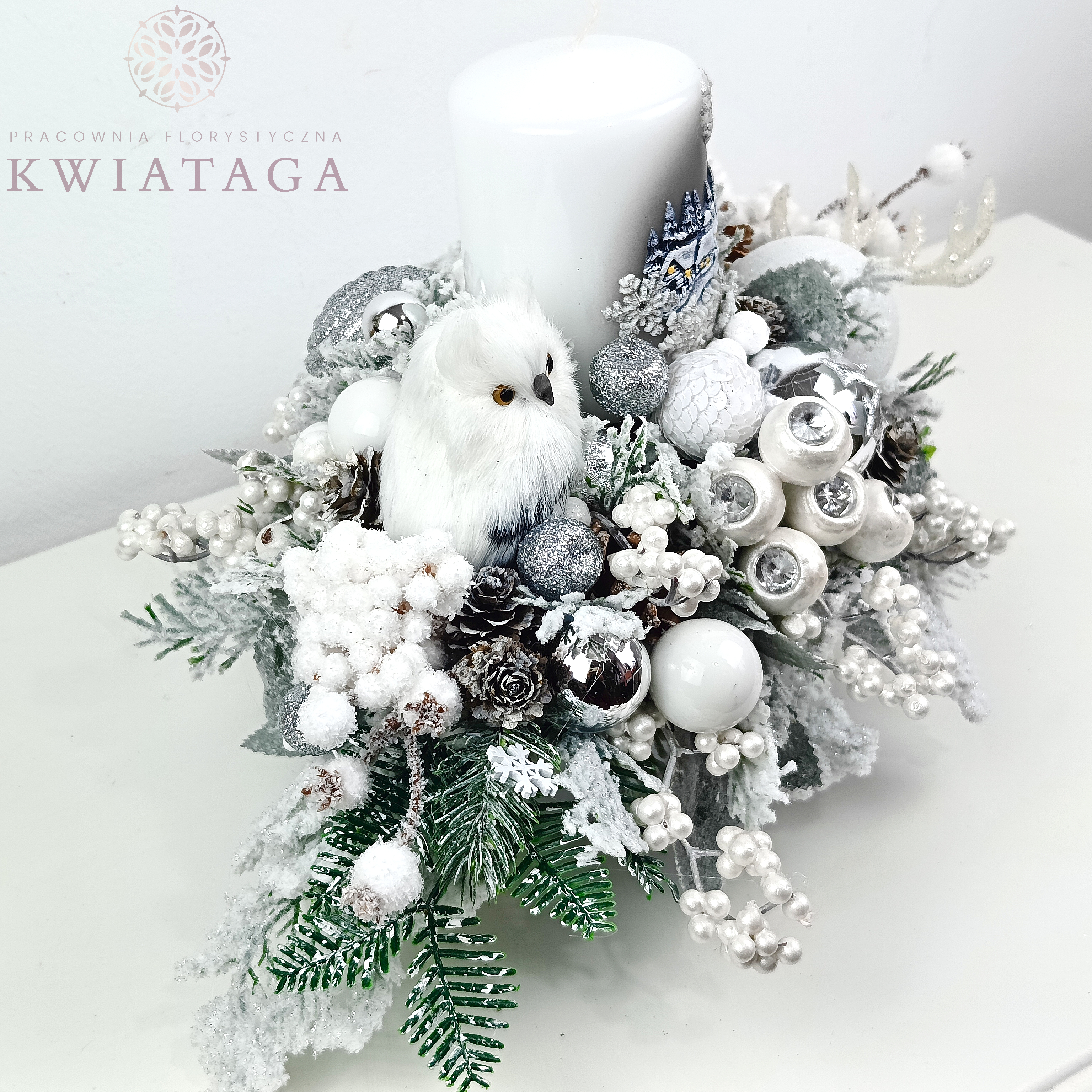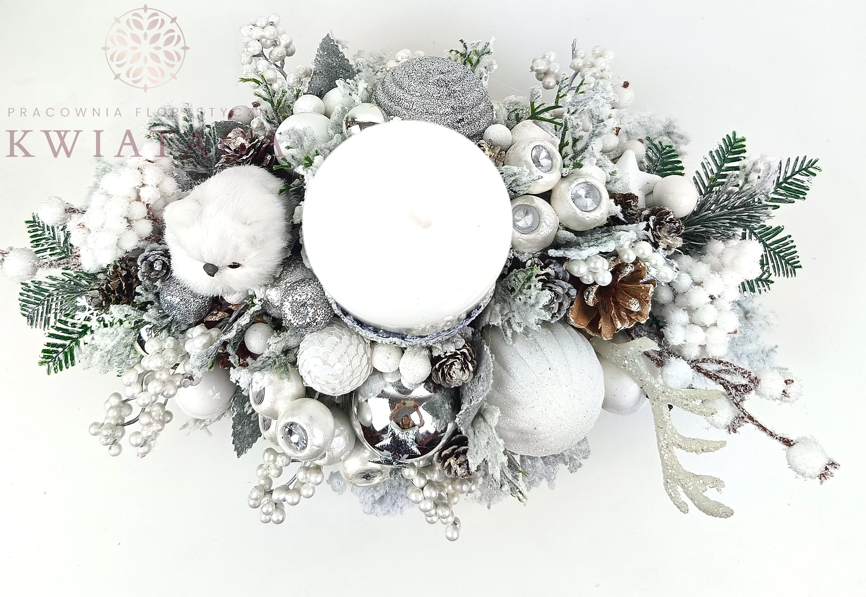 Elegancki, wydłużony stroik w kolorach bieli i srebra. Wykonany jest z wysokiej jakości sztucznego igliwia, brokatowych i ozdobnych gałązek. Zdobiony szklanymi i plastikowymi bombkami, uzupełniony różnorodnymi elementami dekoracyjnymi. Punktem centralnym kompozycji jest piękna, zdobiona świeca, zaś podstawą jest ceramiczne naczynie.