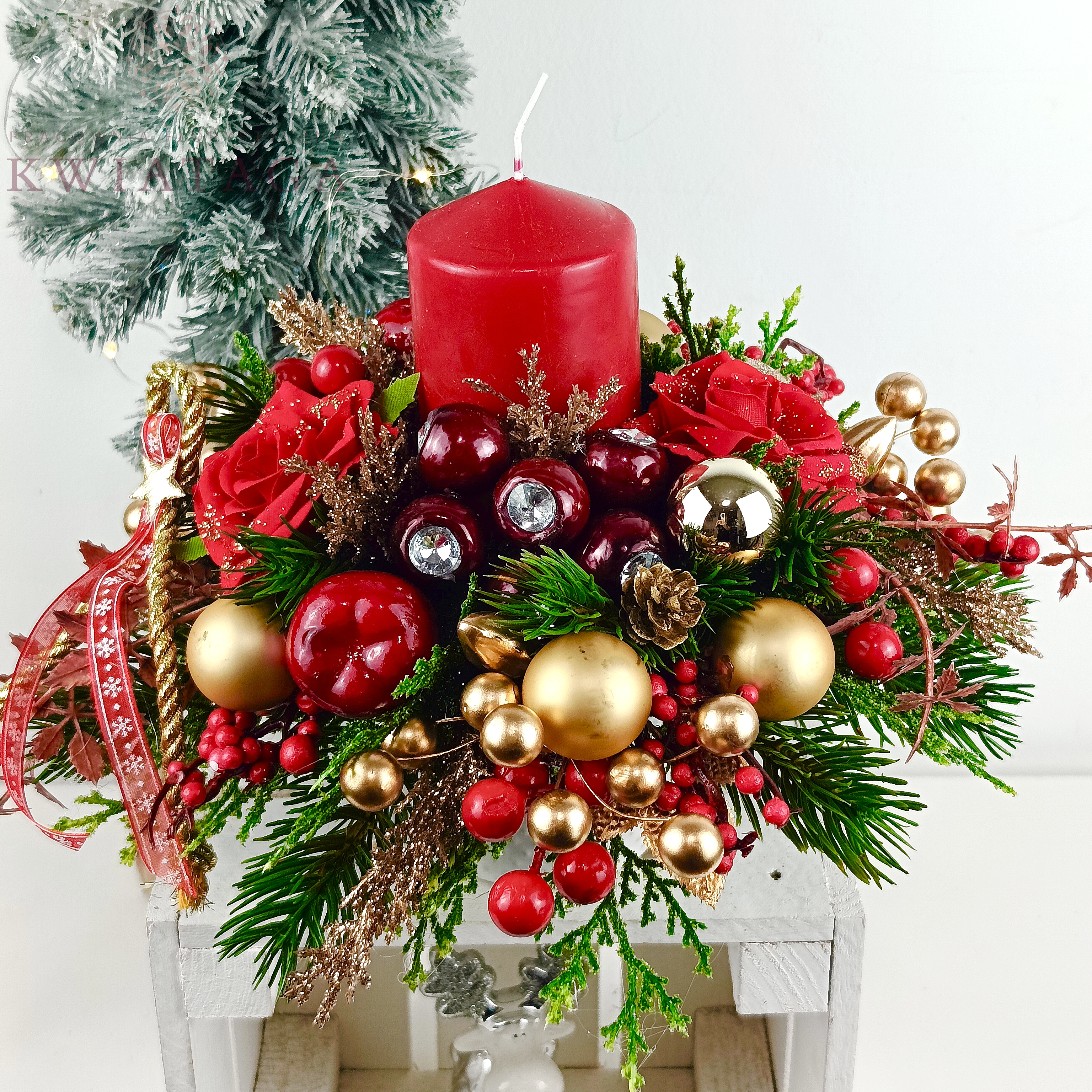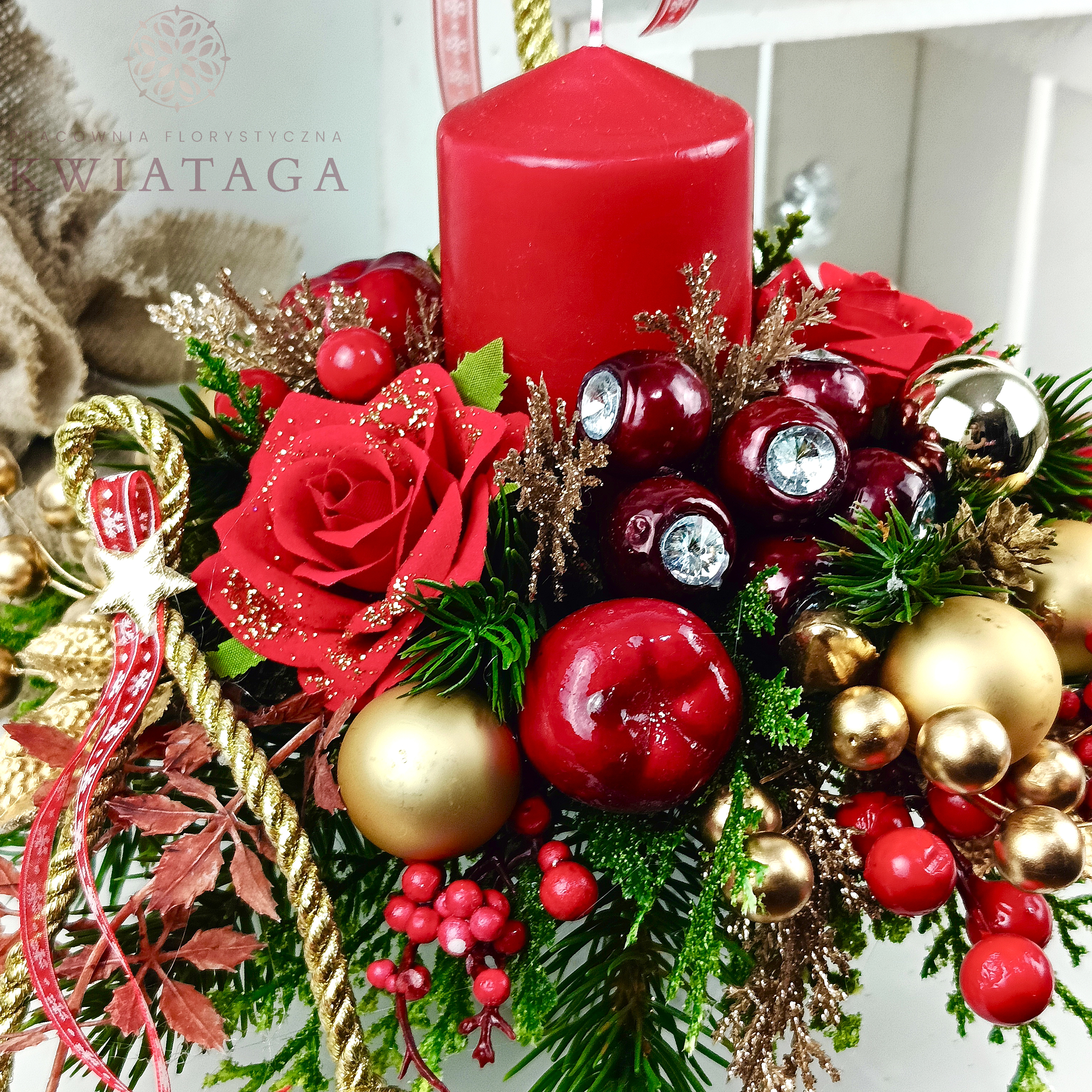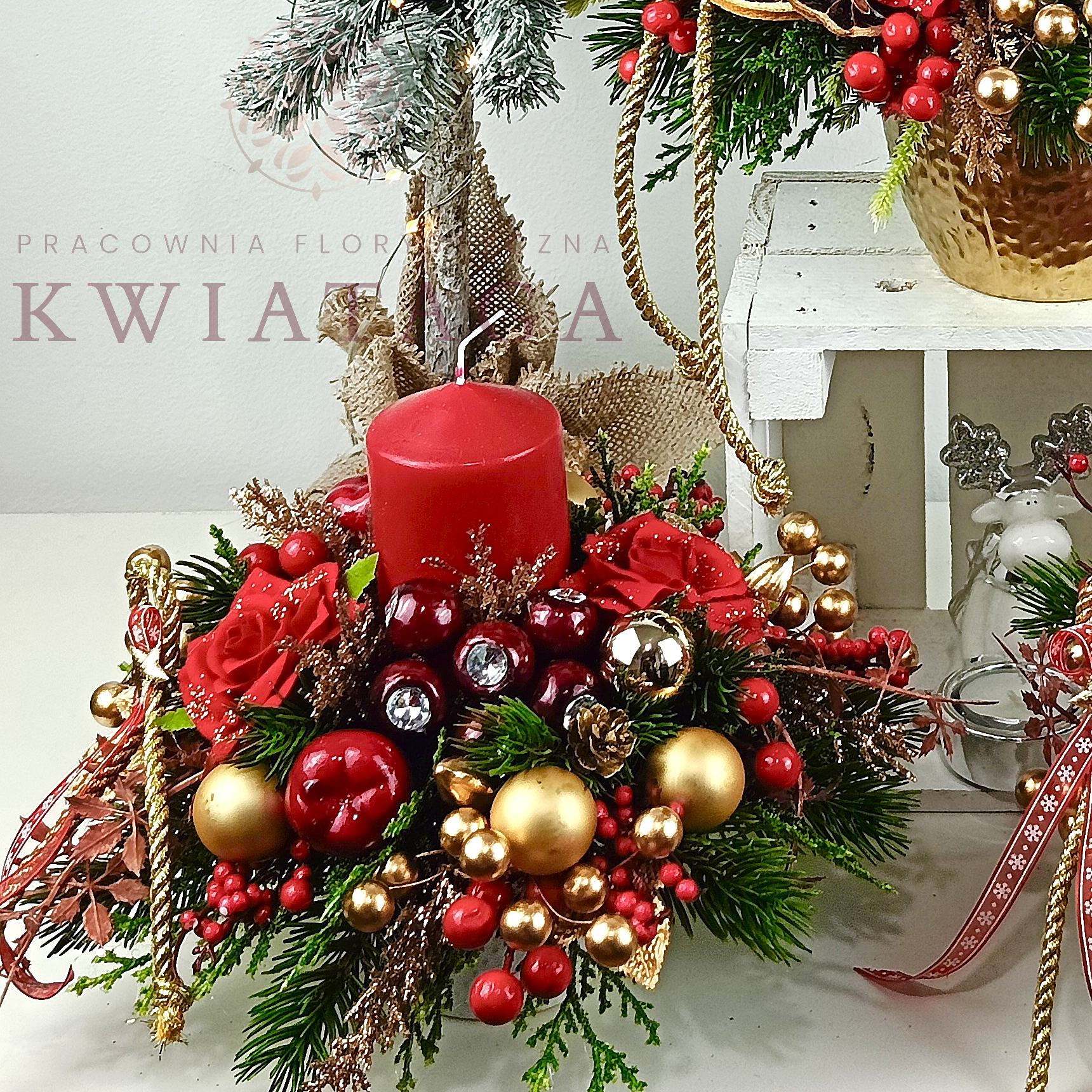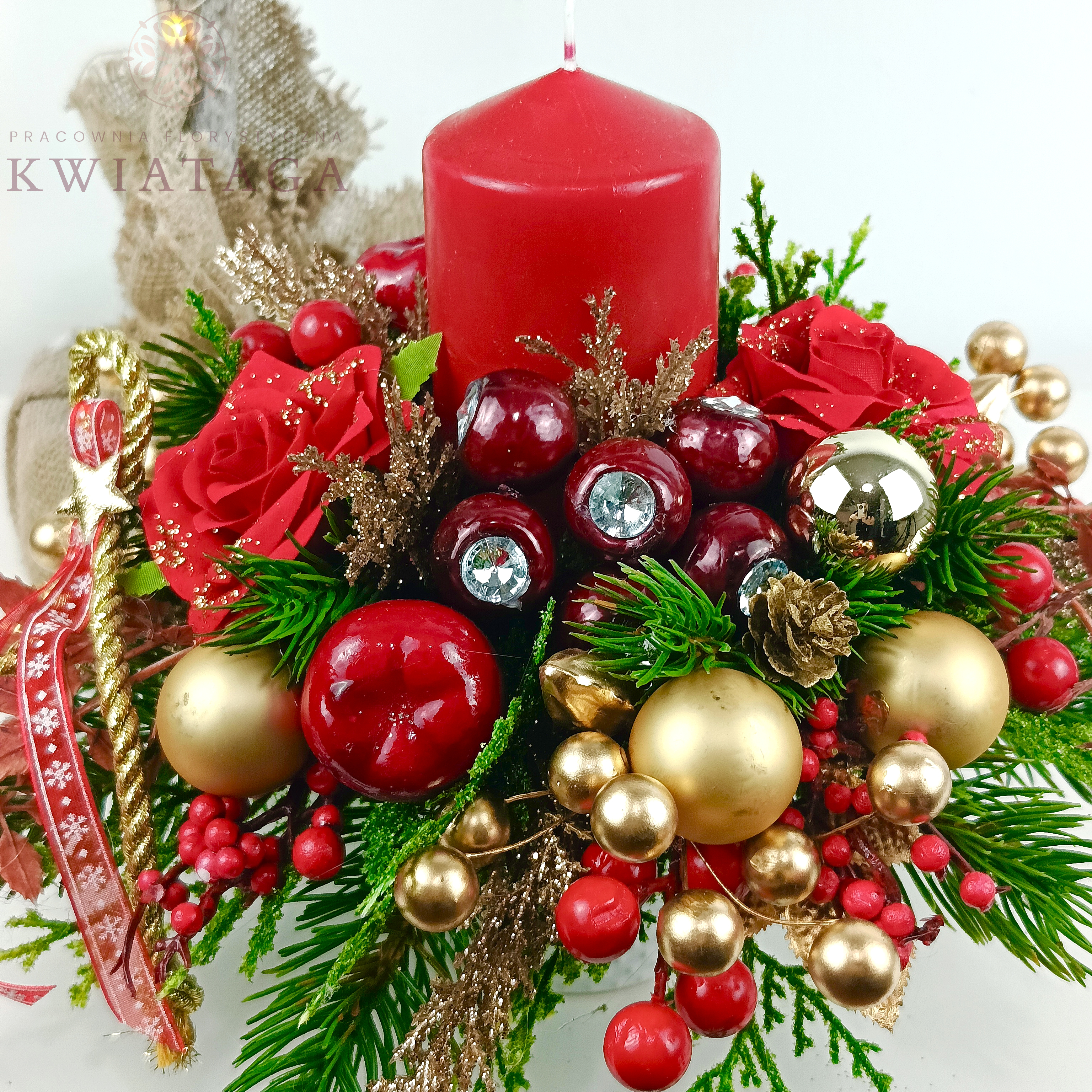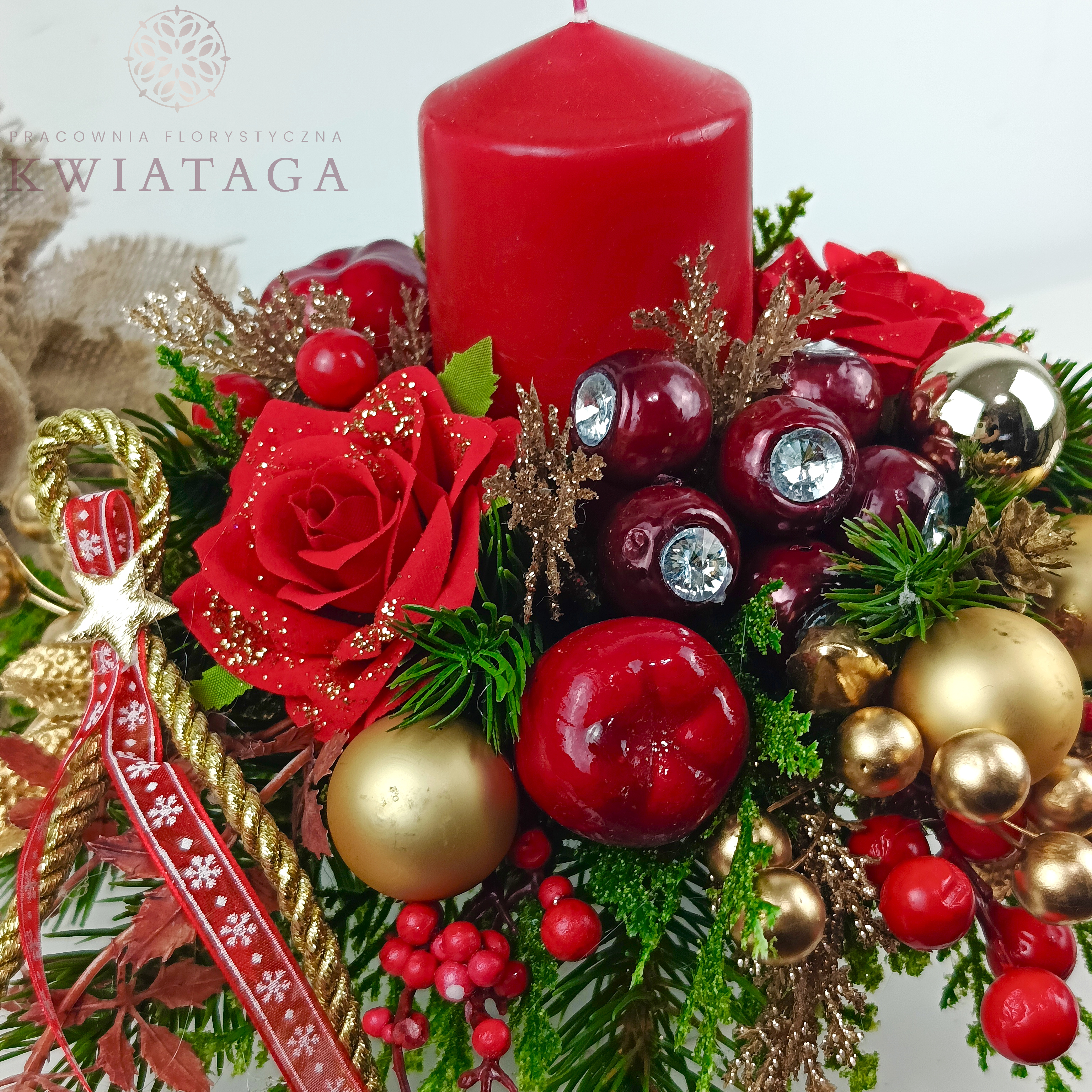 Elegancki stroik w kolorach czerwieni i złota z nutą brązu. Wykonany jest z wysokiej jakości sztucznego igliwia, brokatowych i ozdobnych gałązek. Zdobiony szklanymi i plastikowymi bombkami, kwiatami czerwonej róży, uzupełniony różnorodnymi elementami dekoracyjnymi. Punktem centralnym kompozycji jest czerwona świeca, zaś podstawą jest ceramiczne, białe naczynie.