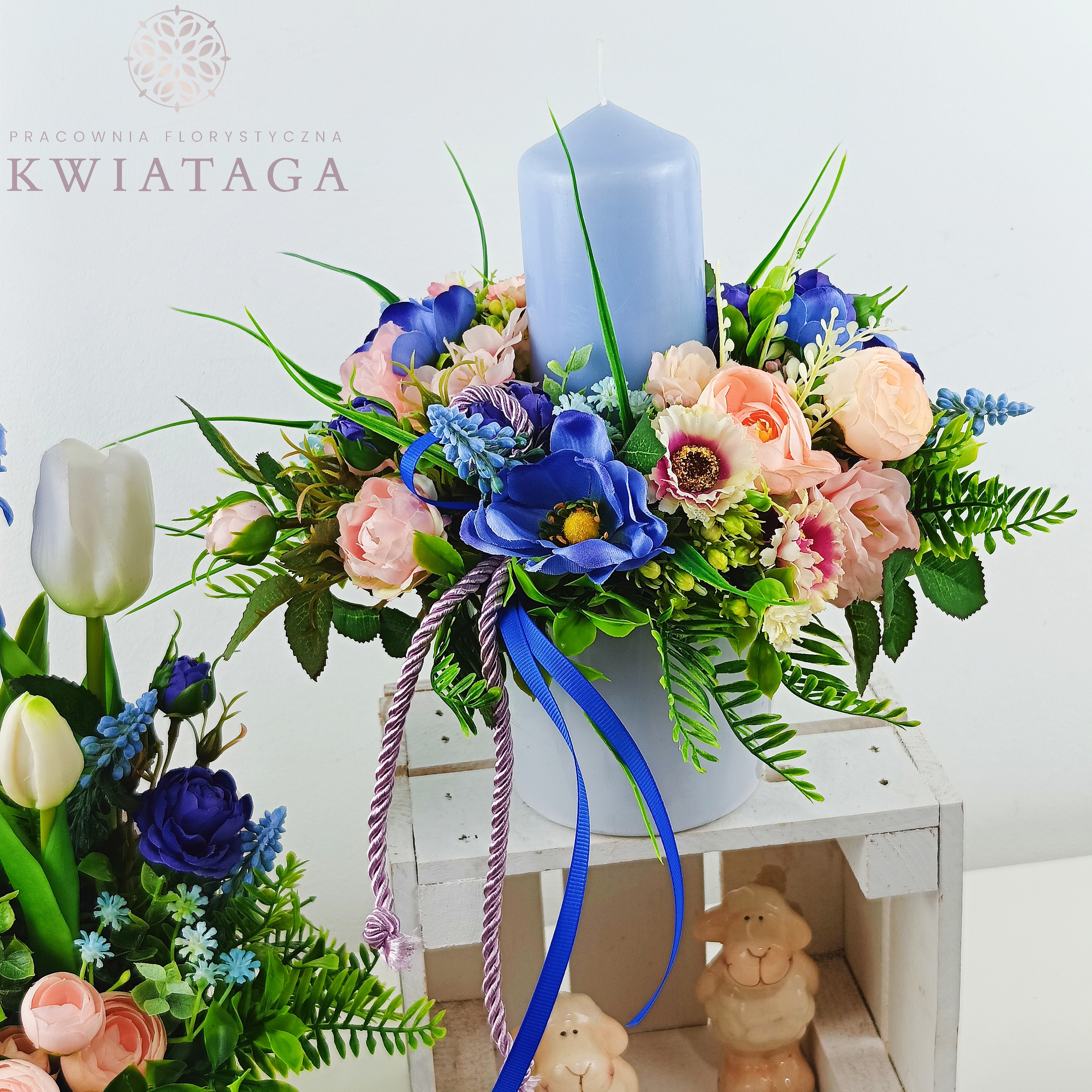 Stroik - kompozycja kwiatowa, pełna świeżości i wiosennej elegancji, wykonana jest z kwiatów i dodatków sztucznych wysokiej jakości. Punktem centralnym stroika jest błękitna świeca, zaś podstawą ceramiczne naczynie.