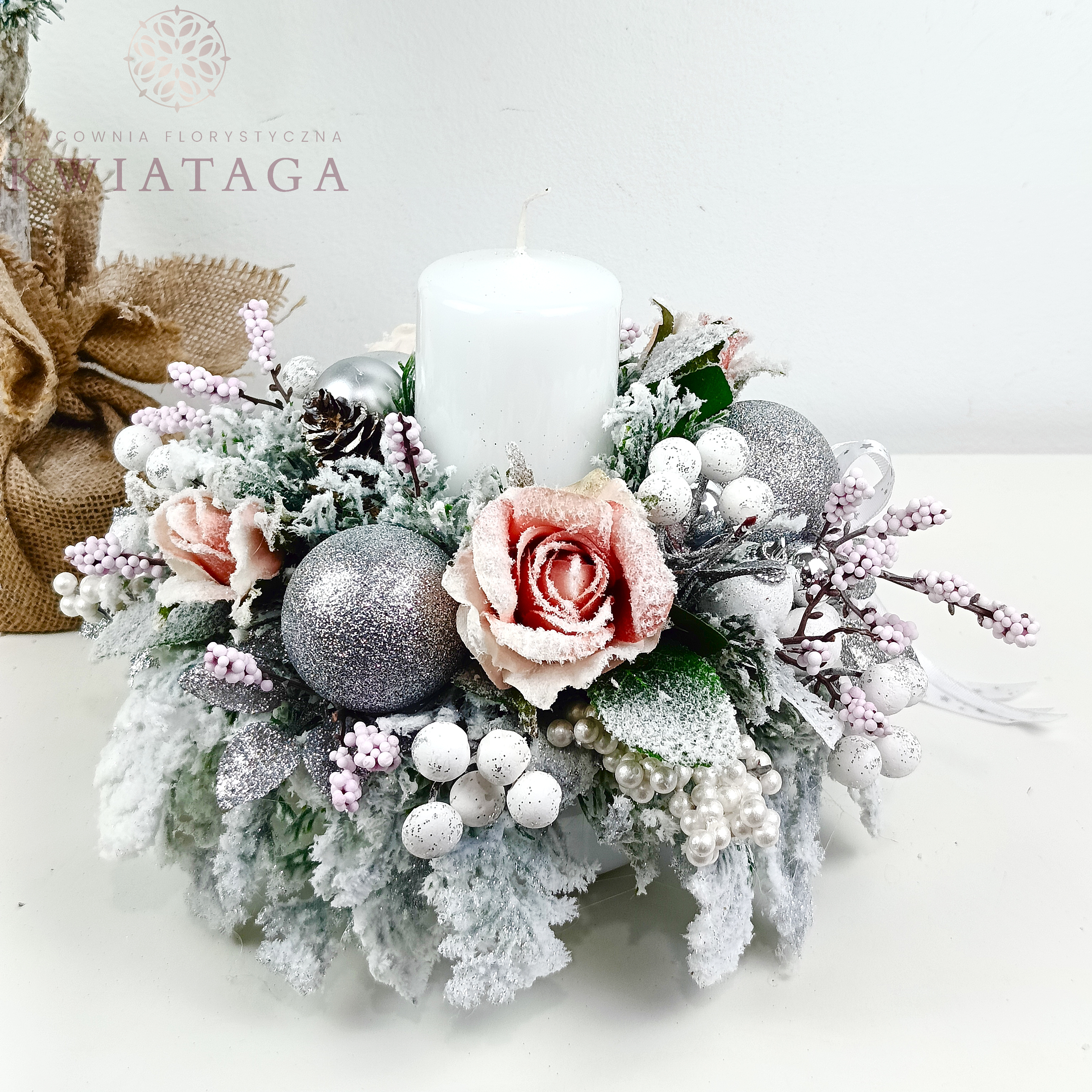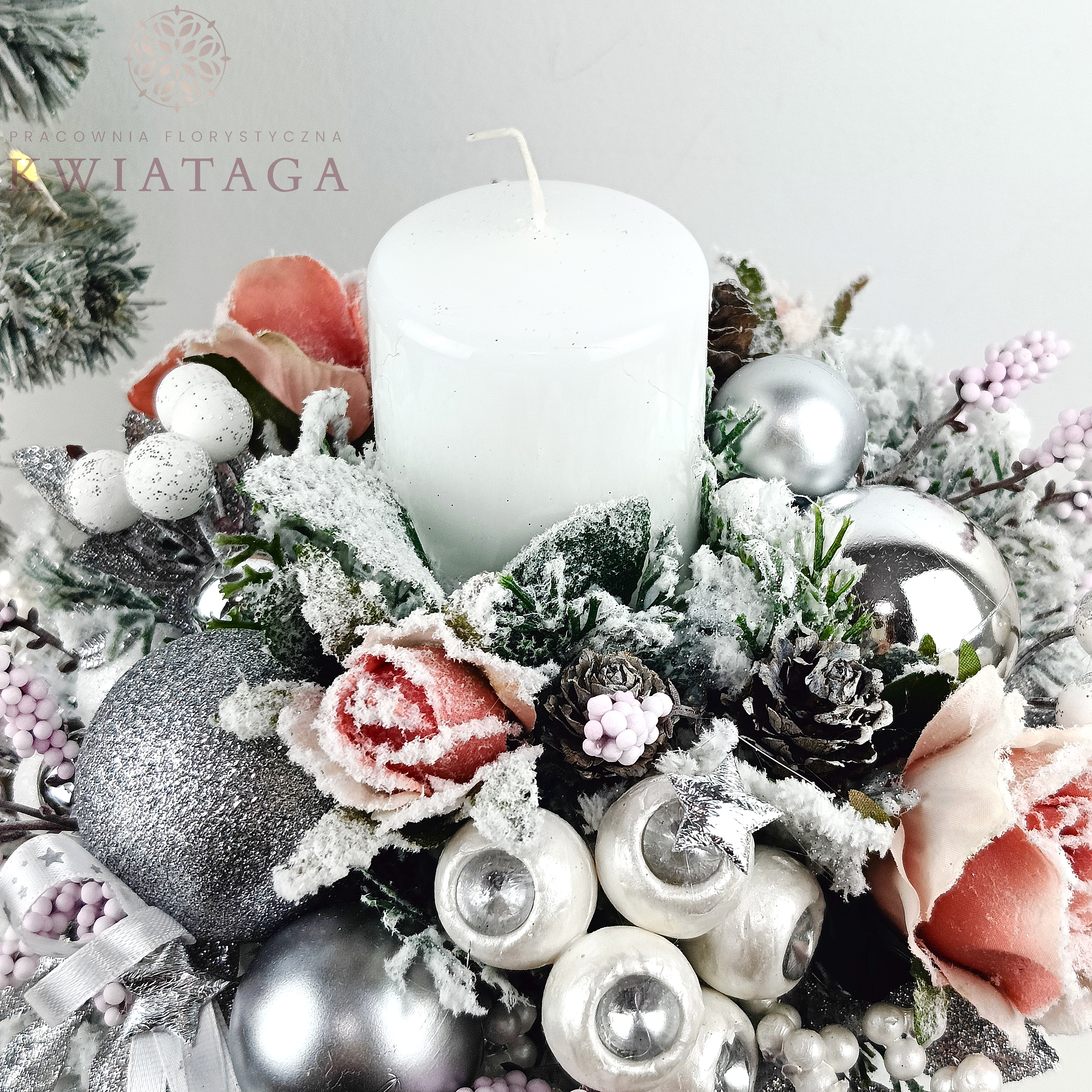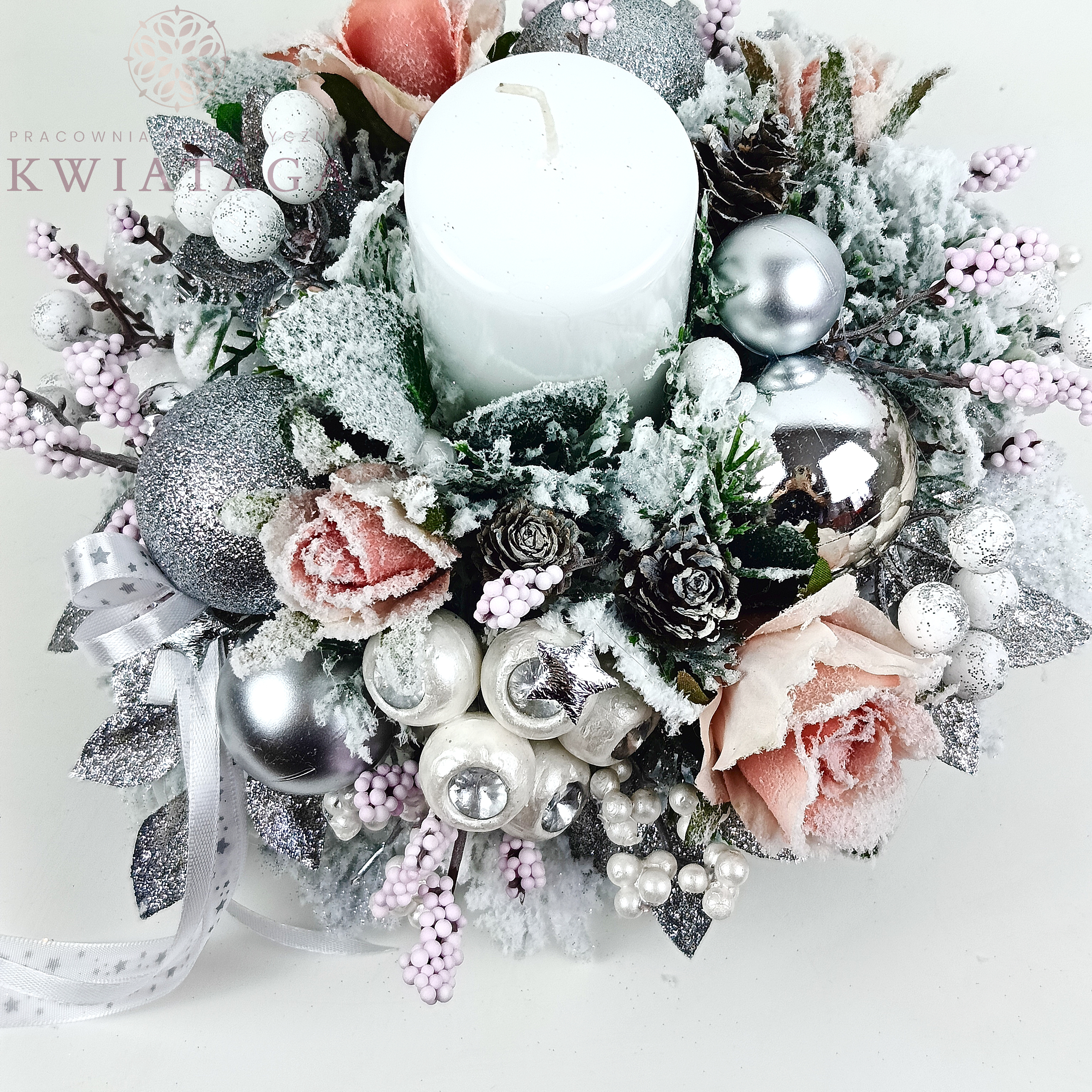 Elegancki, okrągły stroik w kolorach bieli i srebra z odrobiną różu. Wykonany jest z wysokiej jakości sztucznego, ośnieżonego igliwia, brokatowych i ozdobnych gałązek. Zdobiony szklanymi i plastikowymi bombkami, kwiatami ośnieżonej róży, uzupełniony różnorodnymi elementami dekoracyjnymi. Punktem centralnym kompozycji jest biała świeca, zaś podstawą ceramiczne naczynie.