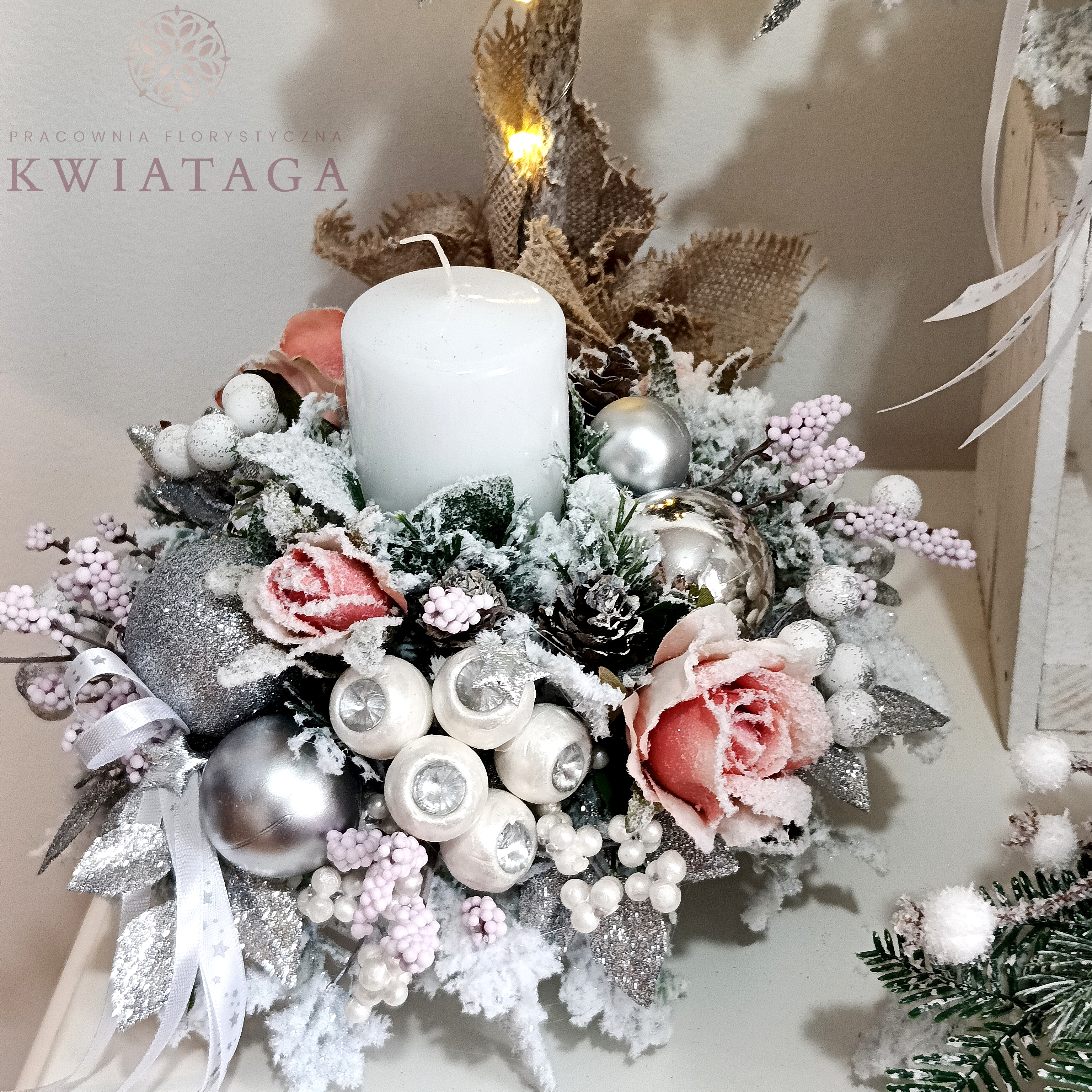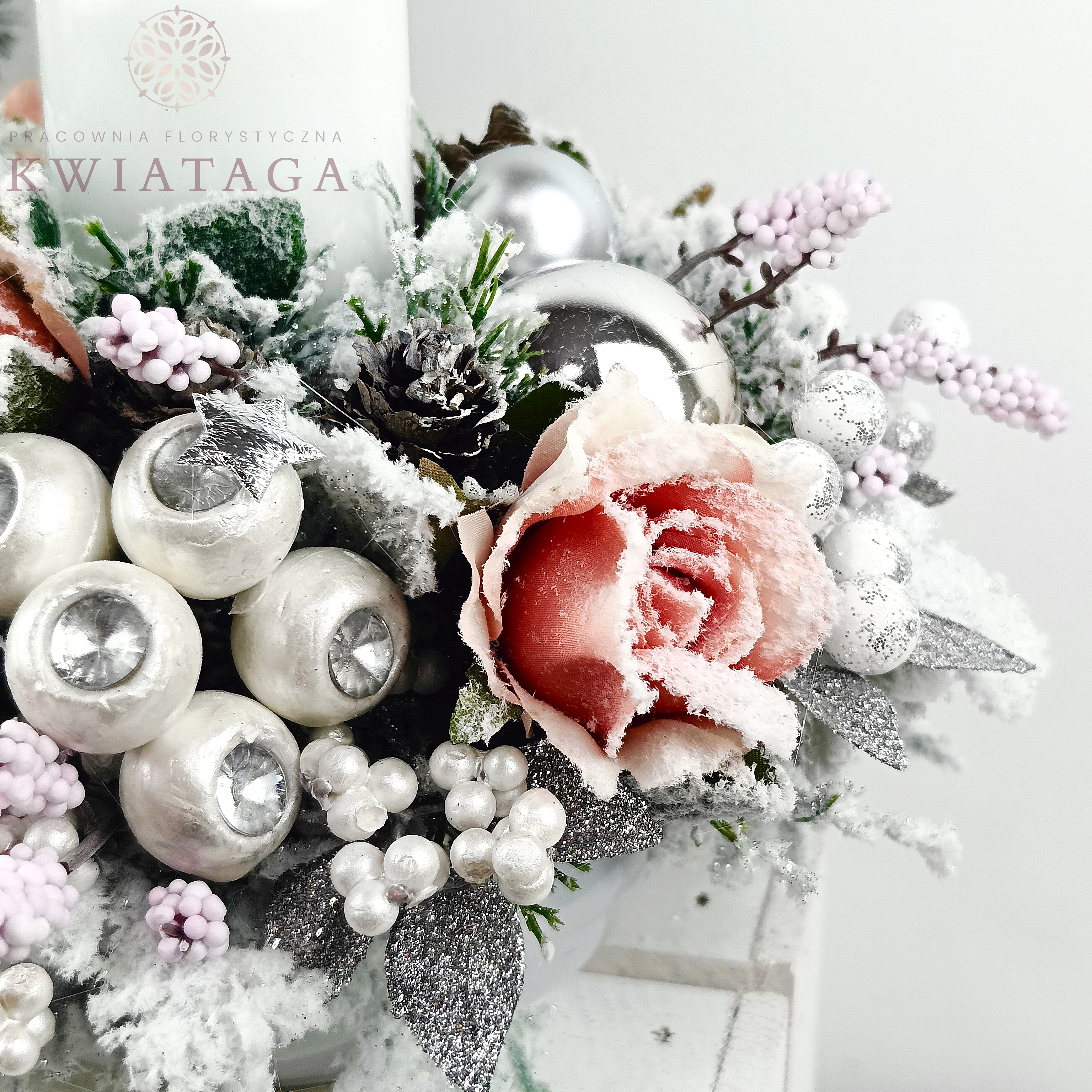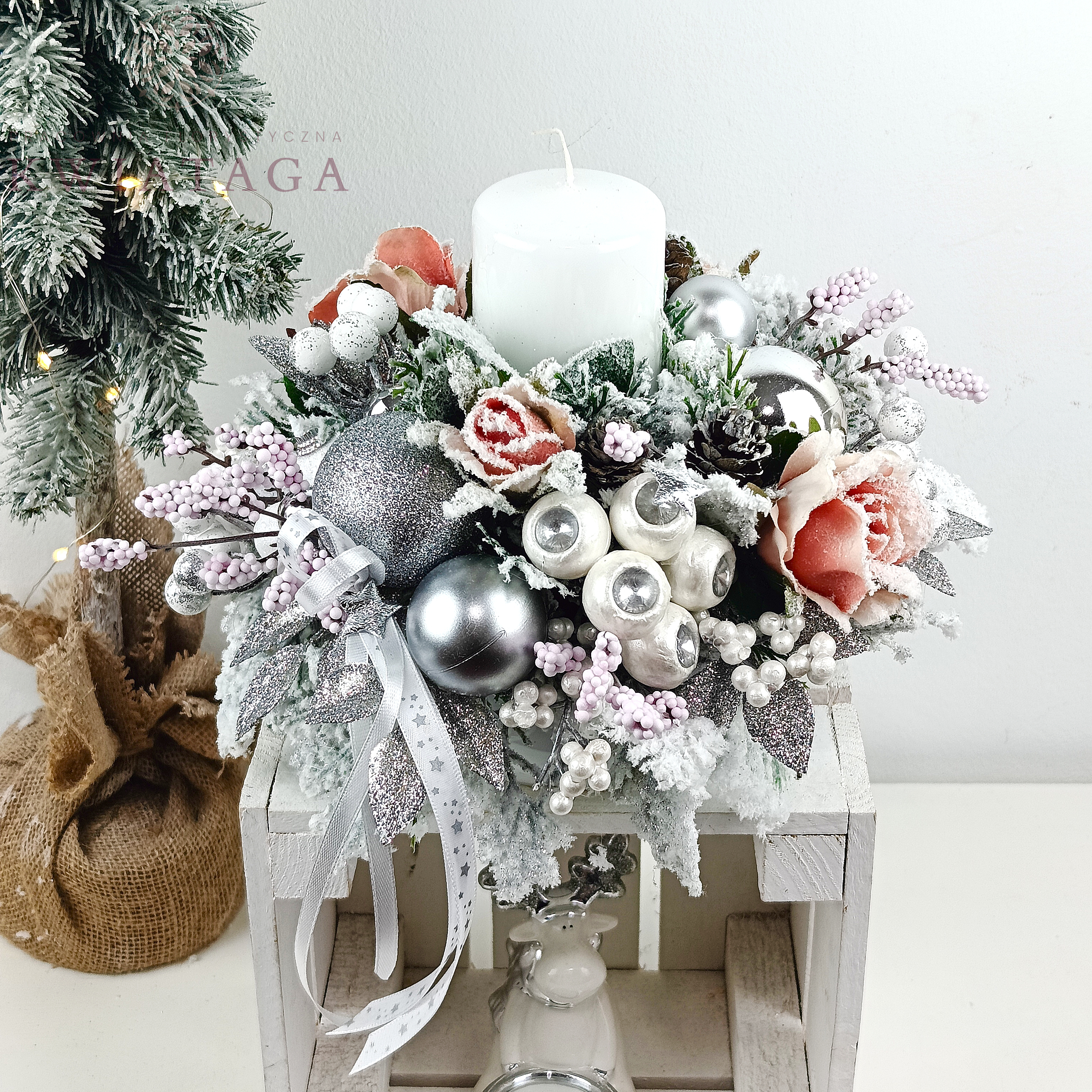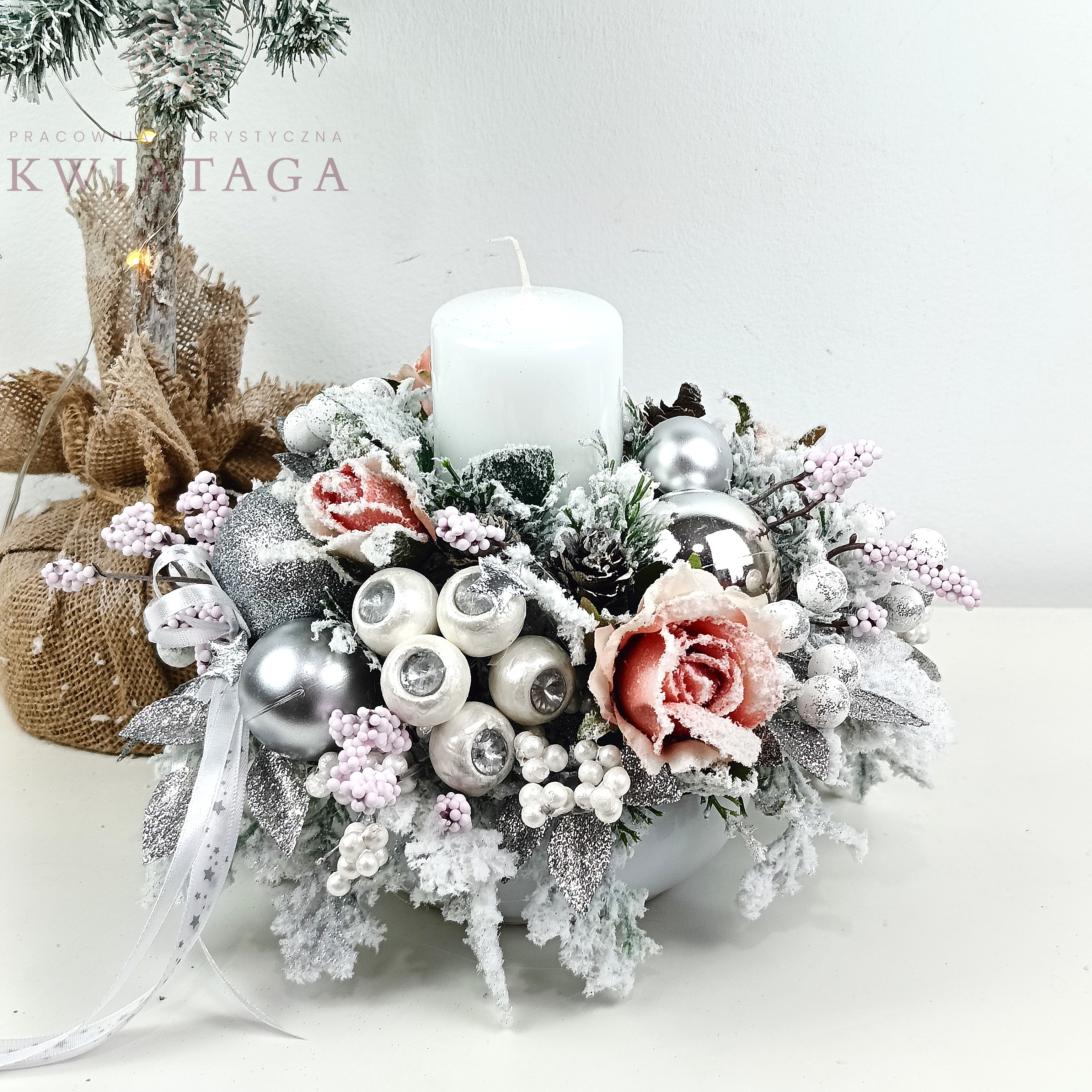 Elegancki, okrągły stroik w kolorach bieli i srebra z odrobiną różu. Wykonany jest z wysokiej jakości sztucznego, ośnieżonego igliwia, brokatowych i ozdobnych gałązek. Zdobiony szklanymi i plastikowymi bombkami, kwiatami ośnieżonej róży, uzupełniony różnorodnymi elementami dekoracyjnymi. Punktem centralnym kompozycji jest biała świeca, zaś podstawą ceramiczne naczynie.