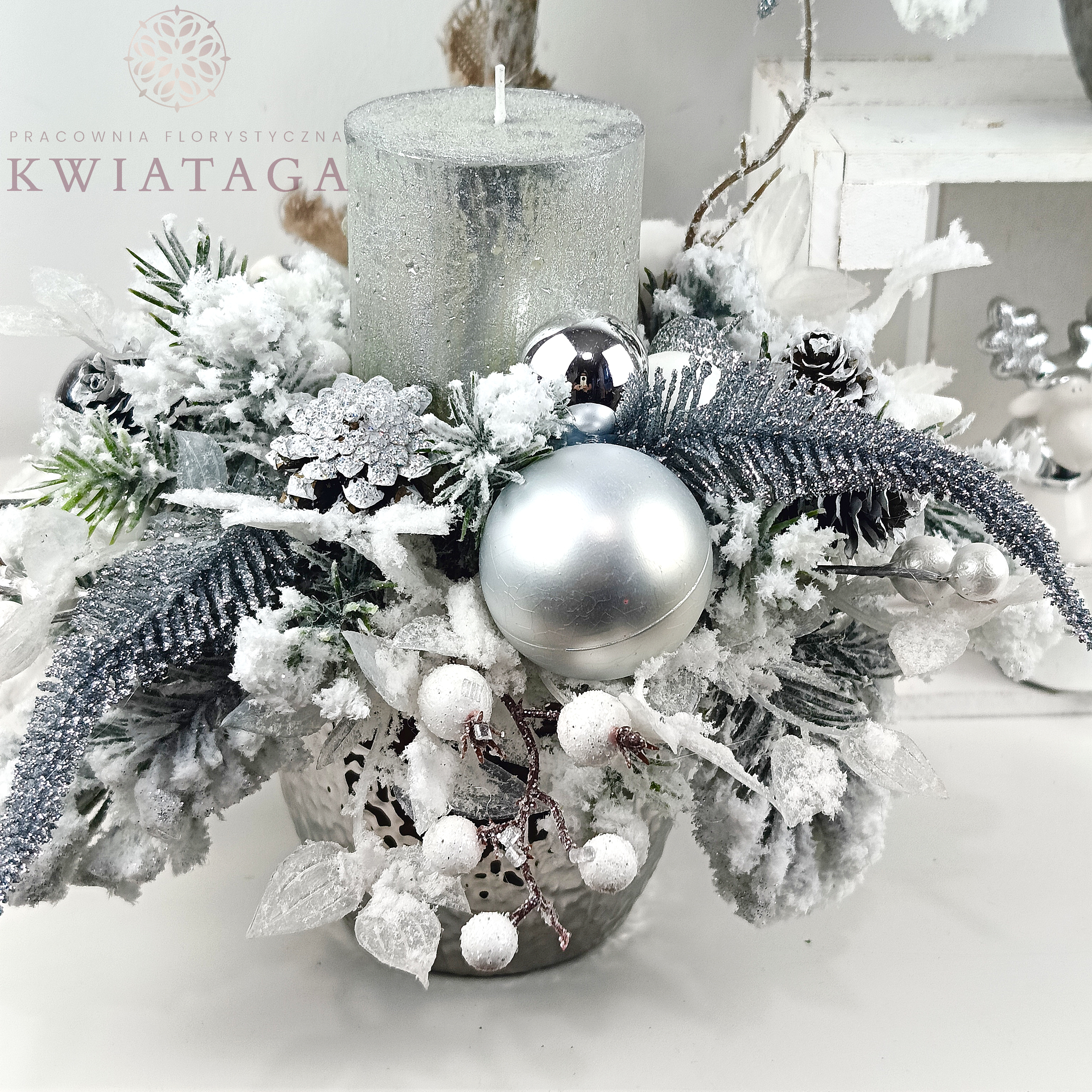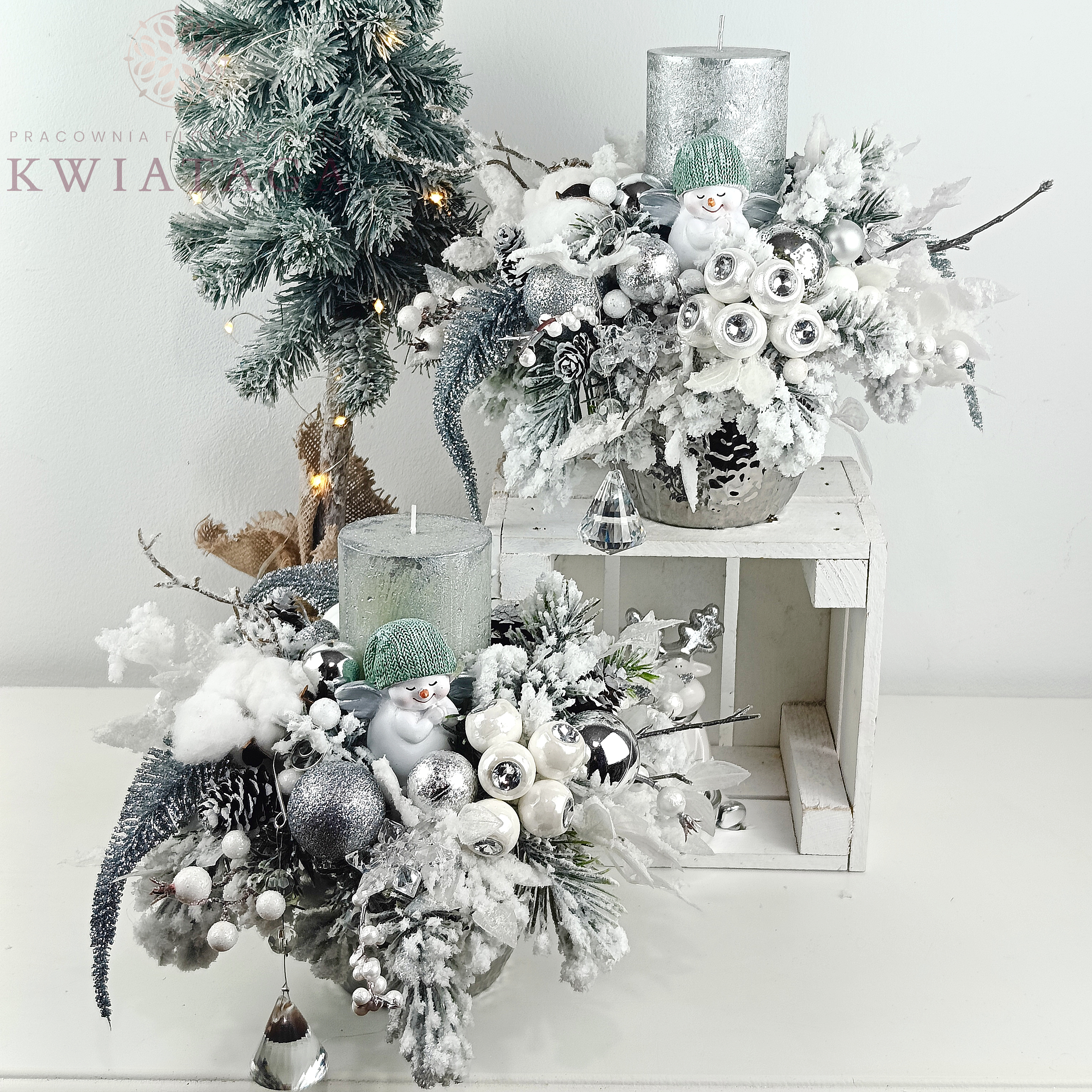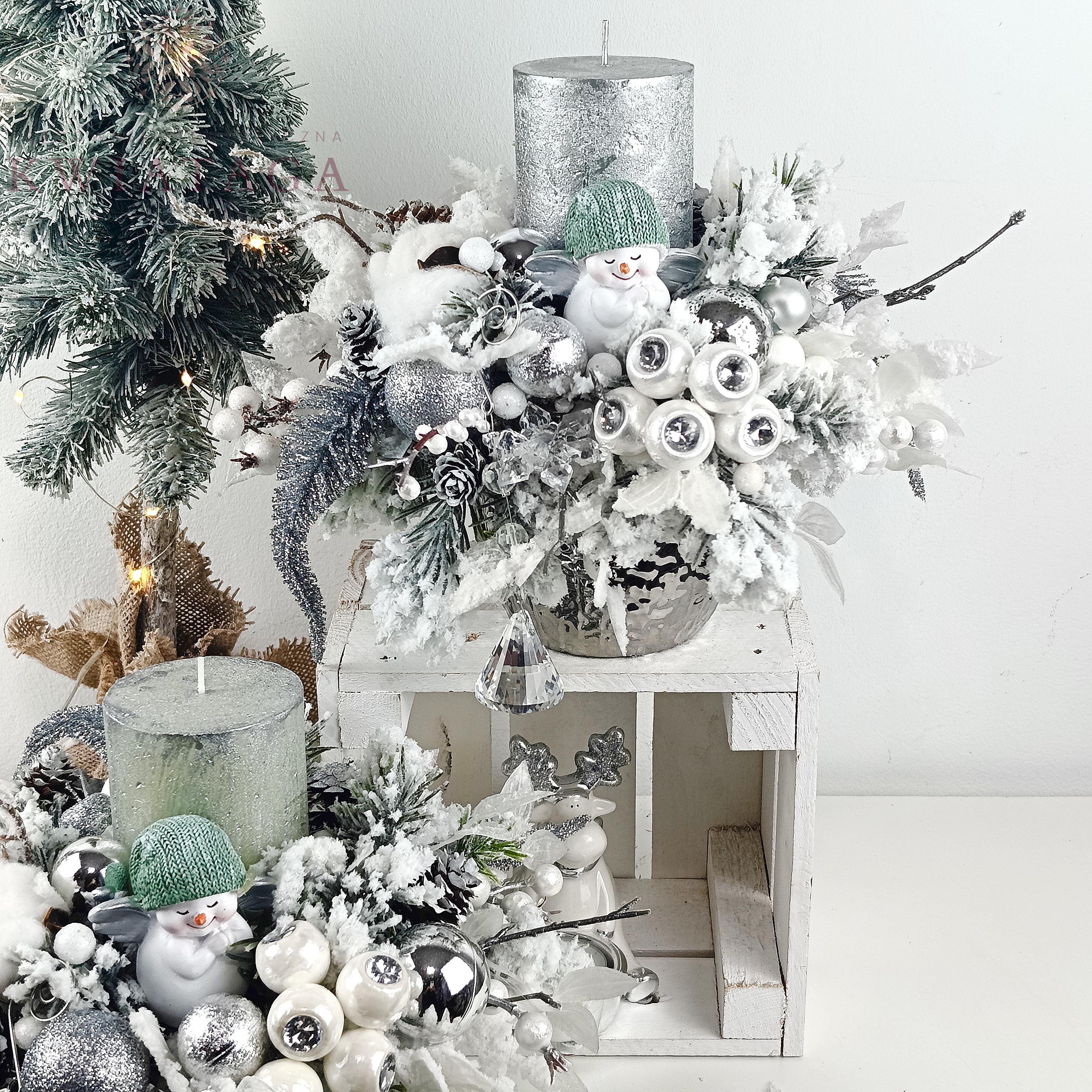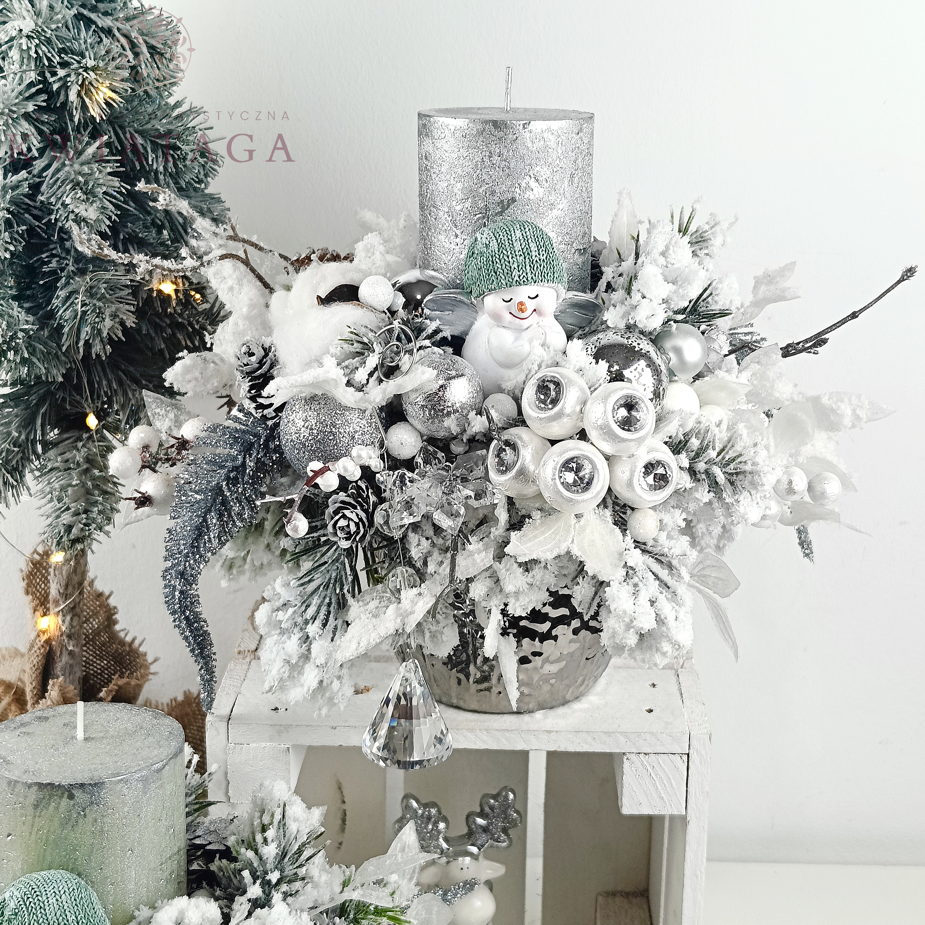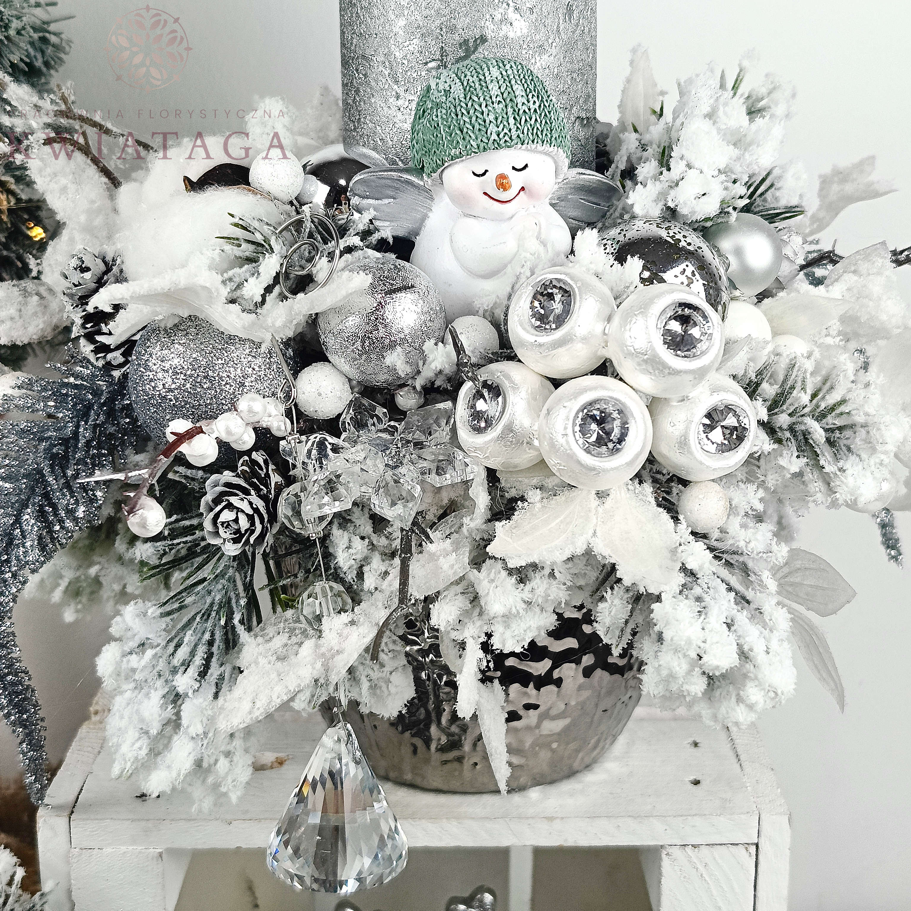 Elegancki, okrągły stroik w kolorach bieli i srebra. Wykonany jest z wysokiej jakości sztucznego, ośnieżonego igliwia, brokatowych i ozdobnych gałązek. Zdobiony szklanymi i plastikowymi bombkami, uzupełniony różnorodnymi elementami dekoracyjnymi i kryształowym zwisem. Punktem centralnym kompozycji jest srebrna świeca i słodka figurka bałwanka, zaś podstawą ceramiczne, srebrne naczynie.