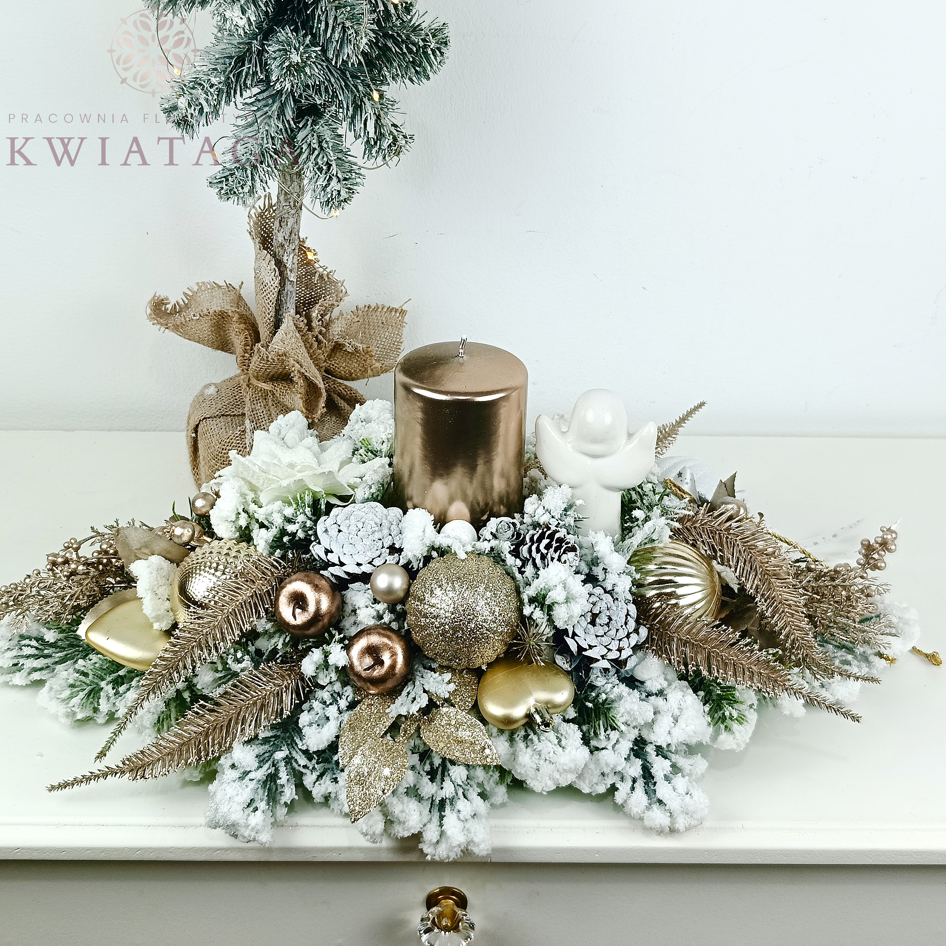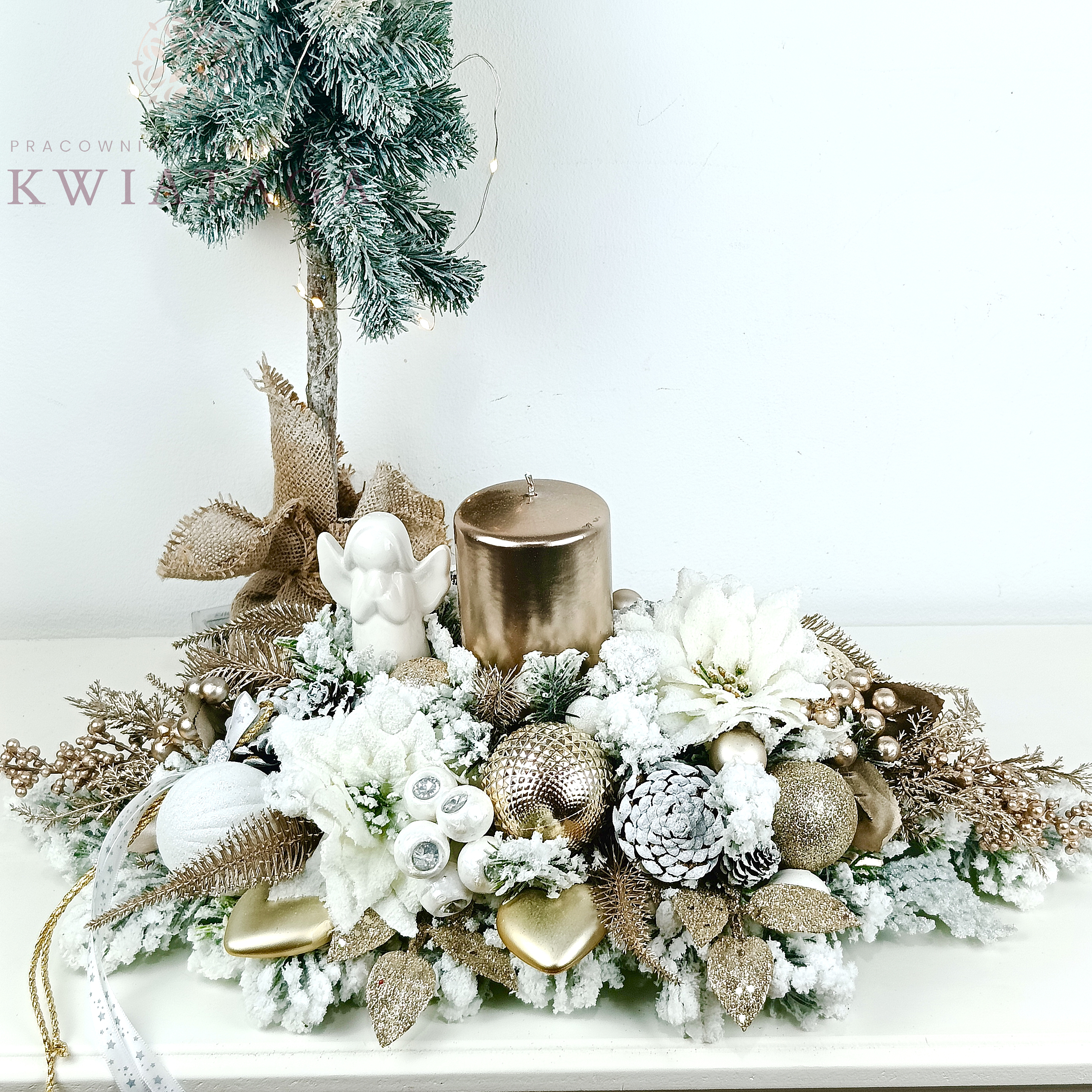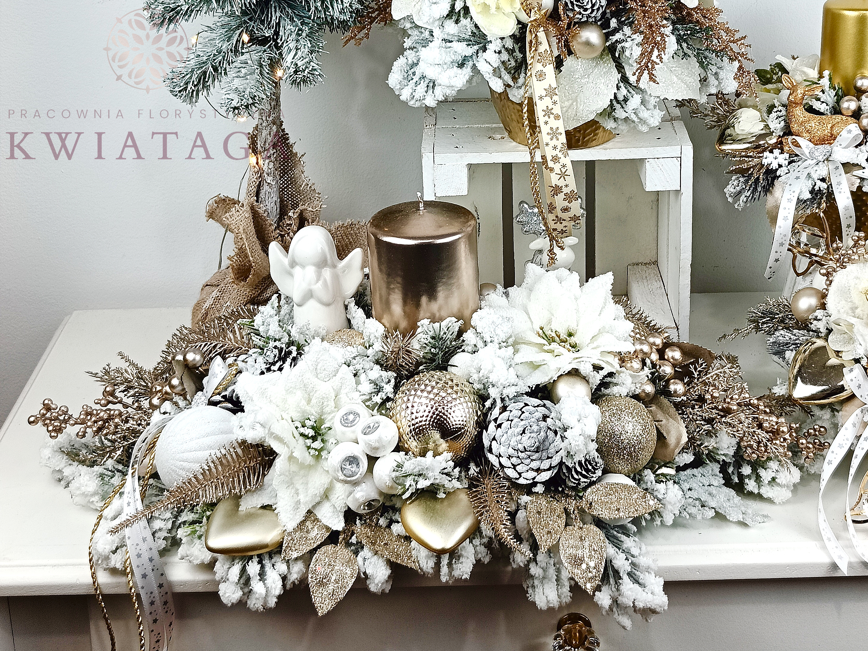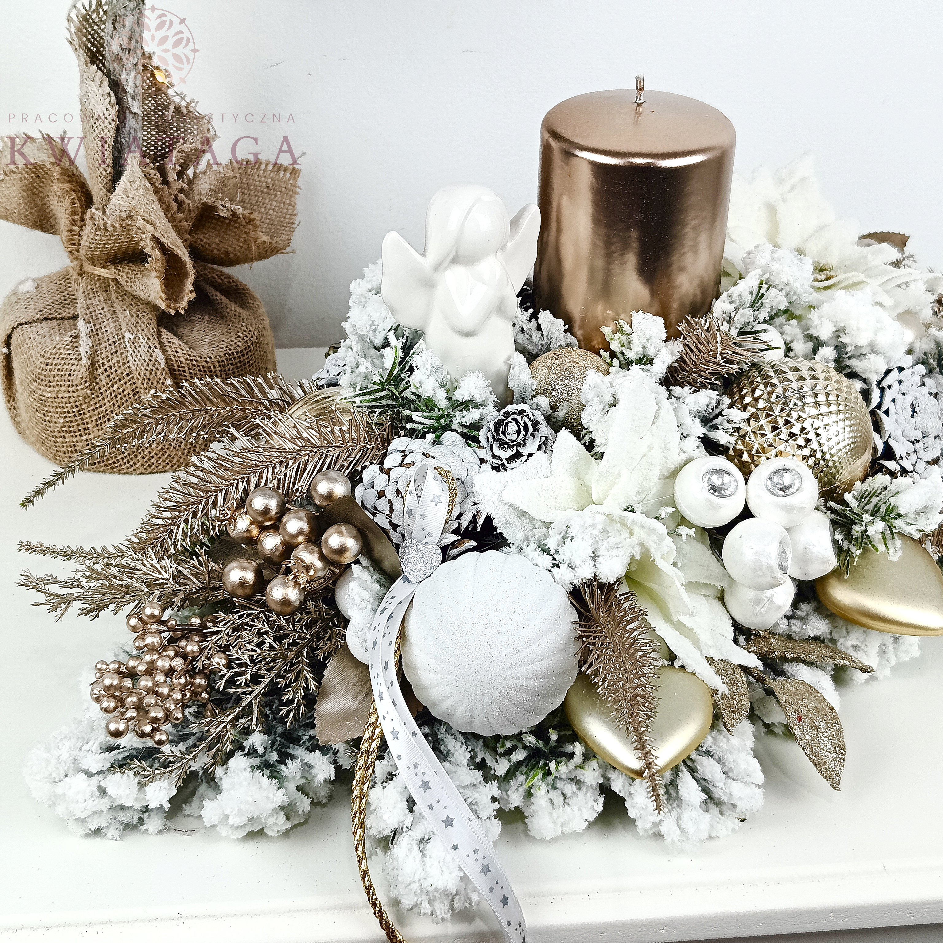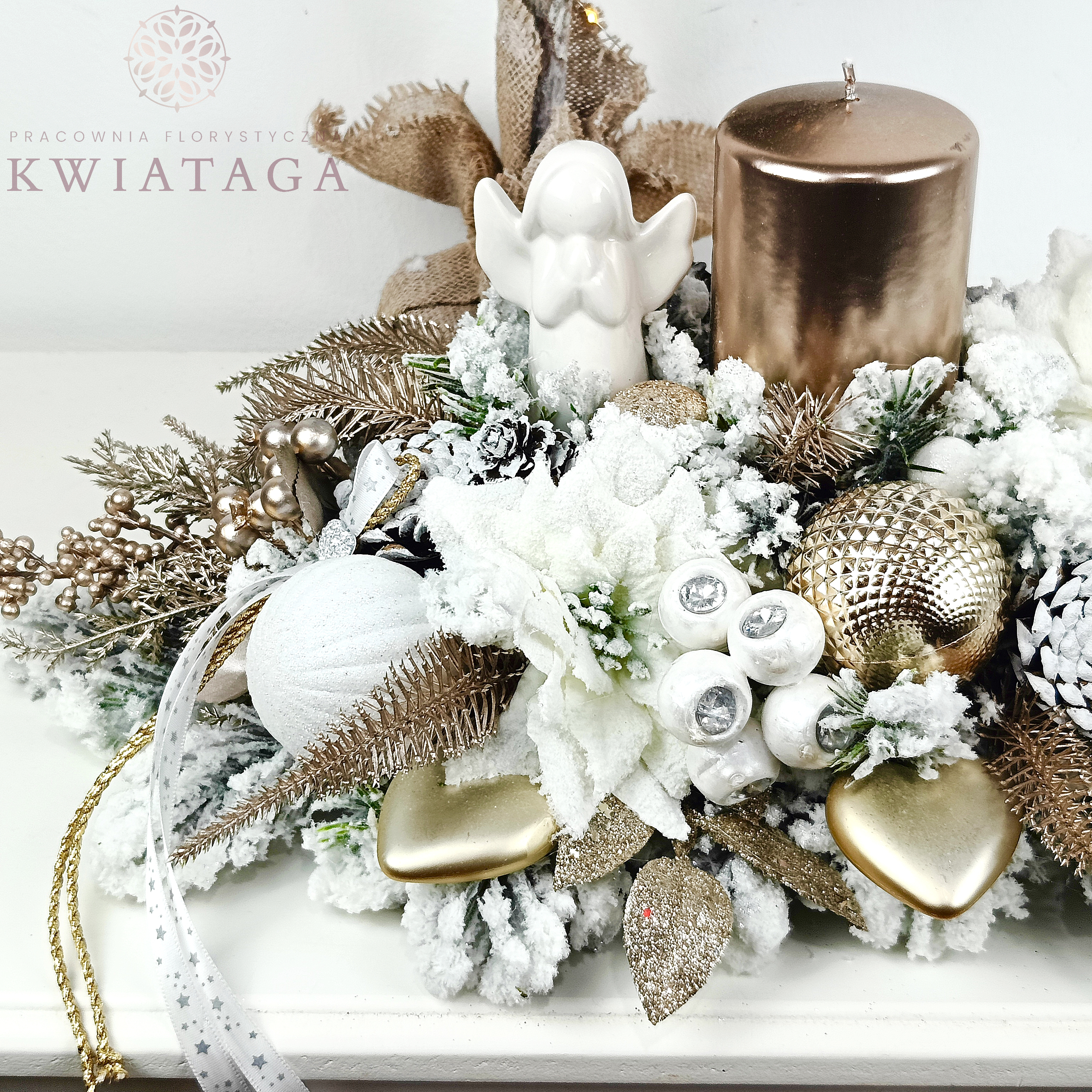 Elegancki, podłużny stroik w kolorach bieli, złota i szampana. Wykonany jest z wysokiej jakości sztucznego, ośnieżonego igliwia, brokatowych i ozdobnych gałązek. Zdobiony szklanymi i plastikowymi bombkami, kwiatami ośnieżonej poisencji, uzupełniony różnorodnymi elementami dekoracyjnymi. Punktem centralnym kompozycji jest złota świeca i figurka aniołka, zaś podstawą jest plastikowy podstawek.