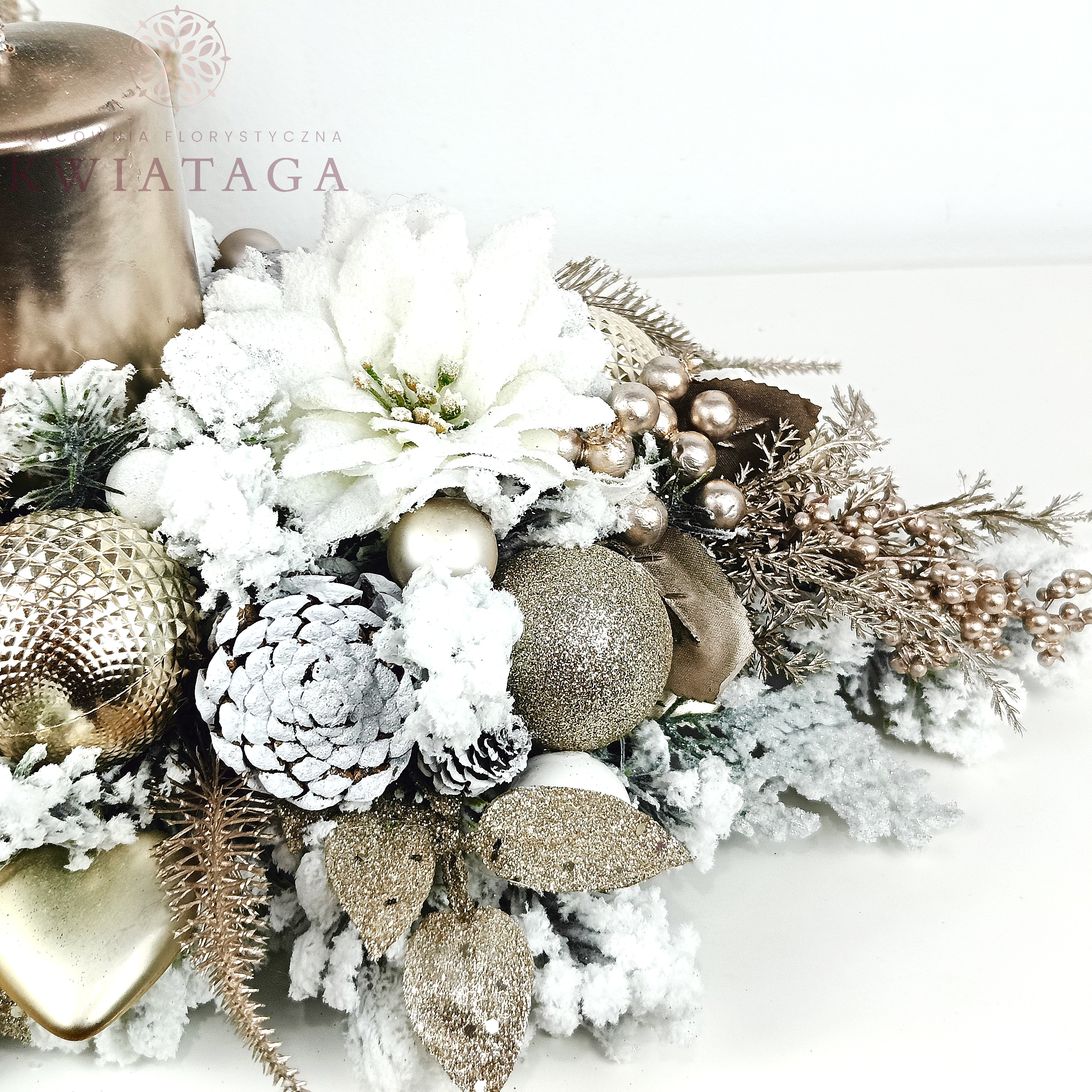 Strona główna » Florystyka z kwiatów sztucznych wysokiej jakości » Boże Narodzenie » Stroiki świąteczne » Stroik w kolorze bieli, złota i szampana nr 50