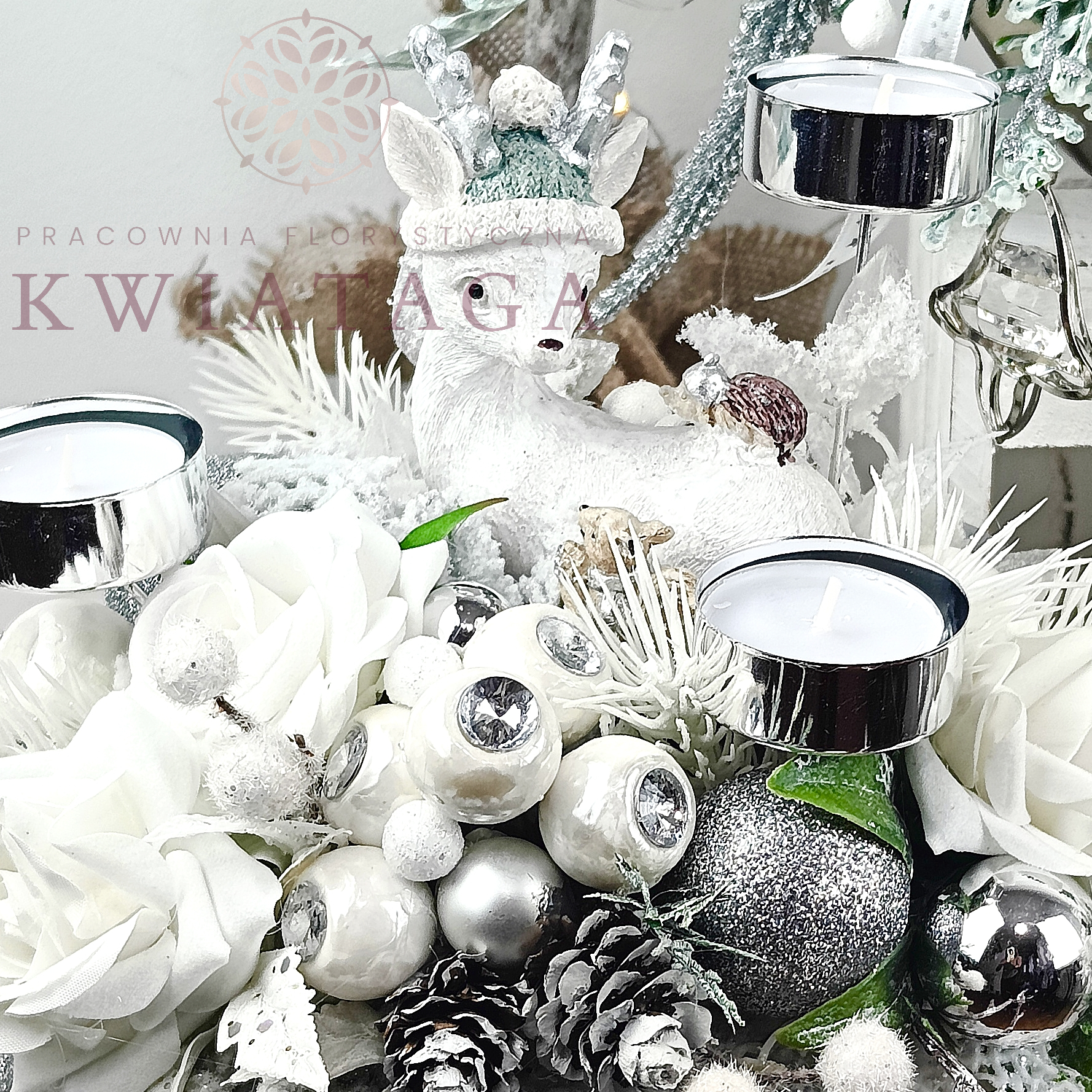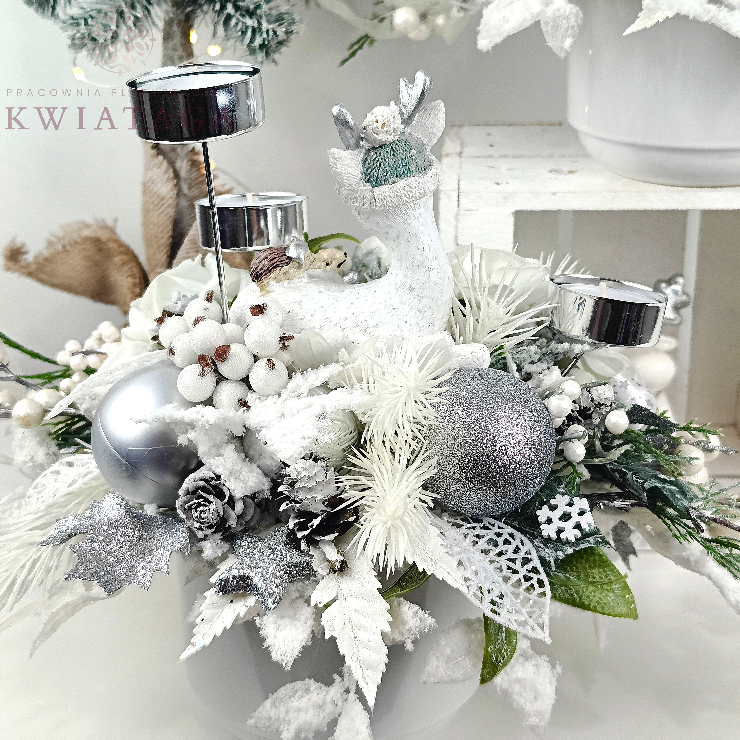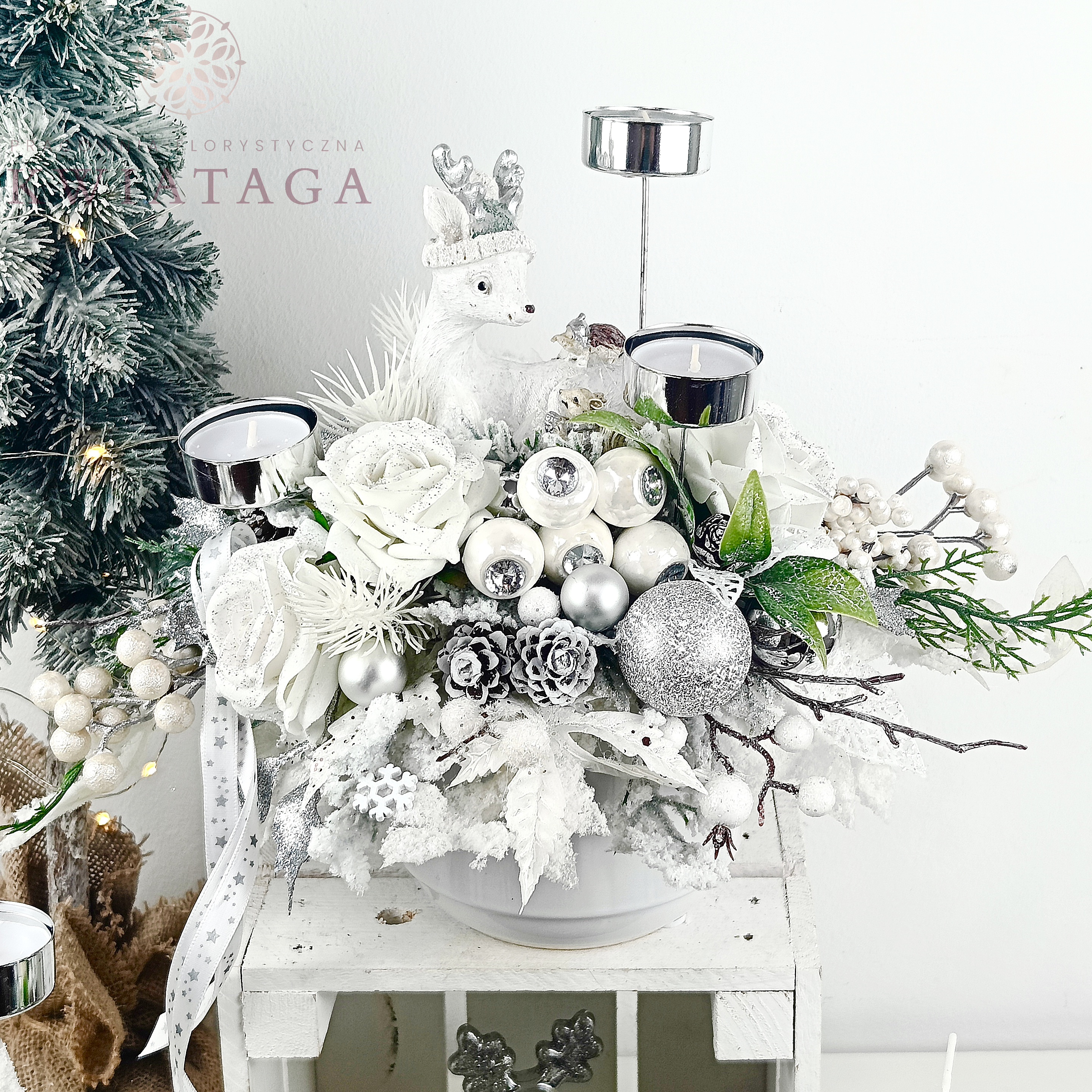 Elegancki, wydłużony stroik w kolorach bieli i srebra. Wykonany jest z wysokiej jakości sztucznego, ośnieżonego igliwia, brokatowych i ozdobnych gałązek. Zdobiony szklanymi i plastikowymi bombkami, kwiatami róży, uzupełniony różnorodnymi elementami dekoracyjnymi. Punktem centralnym kompozycji jest figurka jelonka oraz trzy świeczniki na tilighty, zaś podstawą jest ceramiczne naczynie.