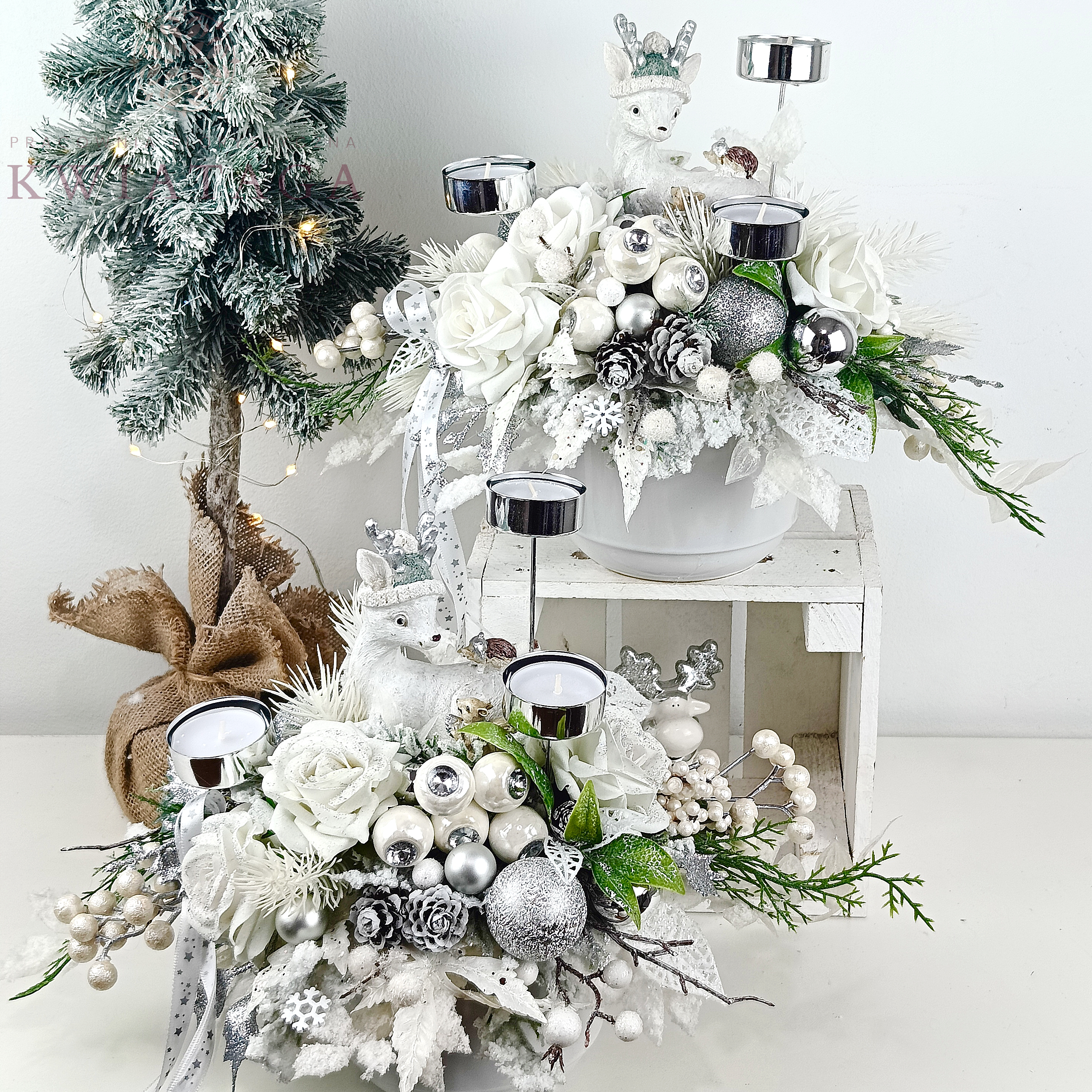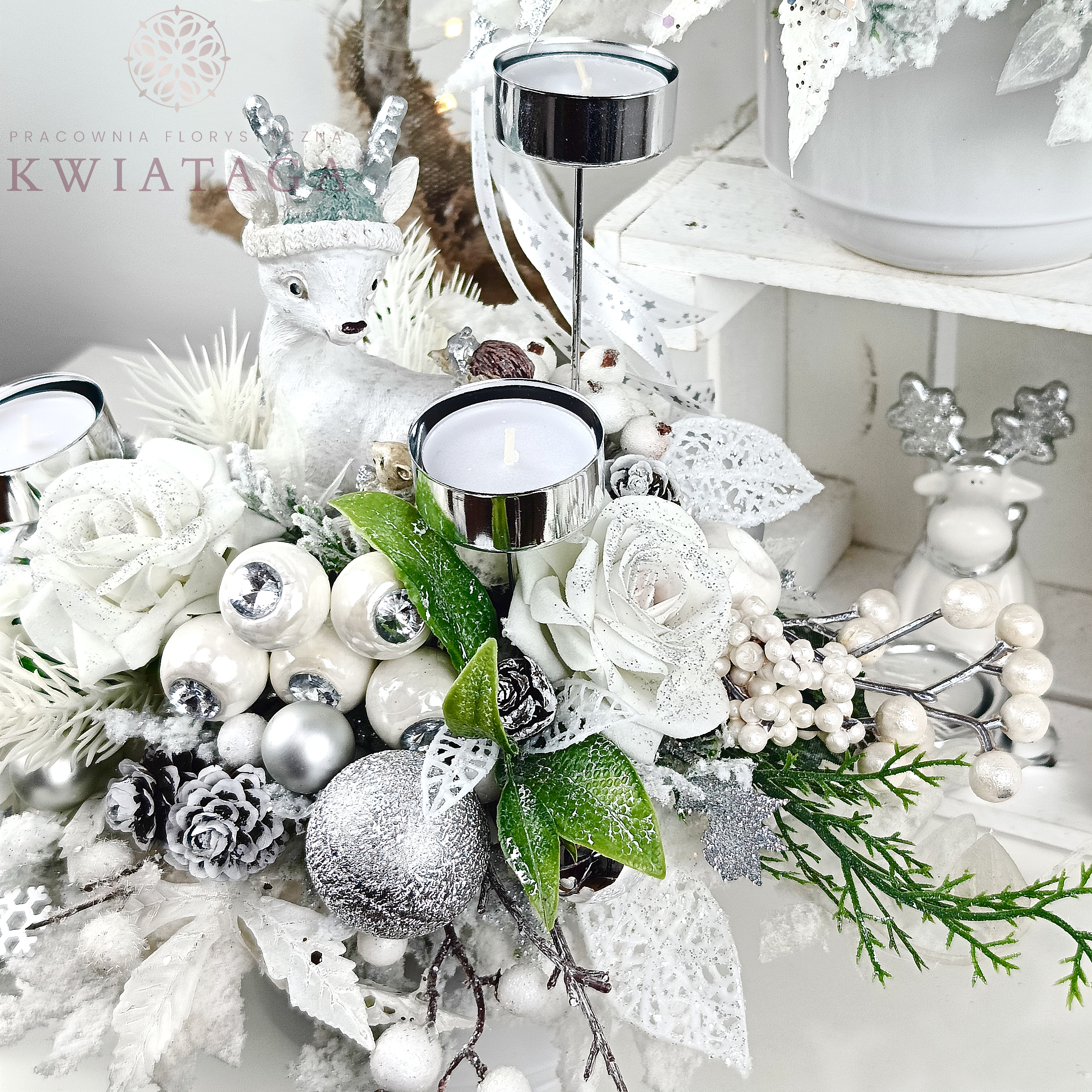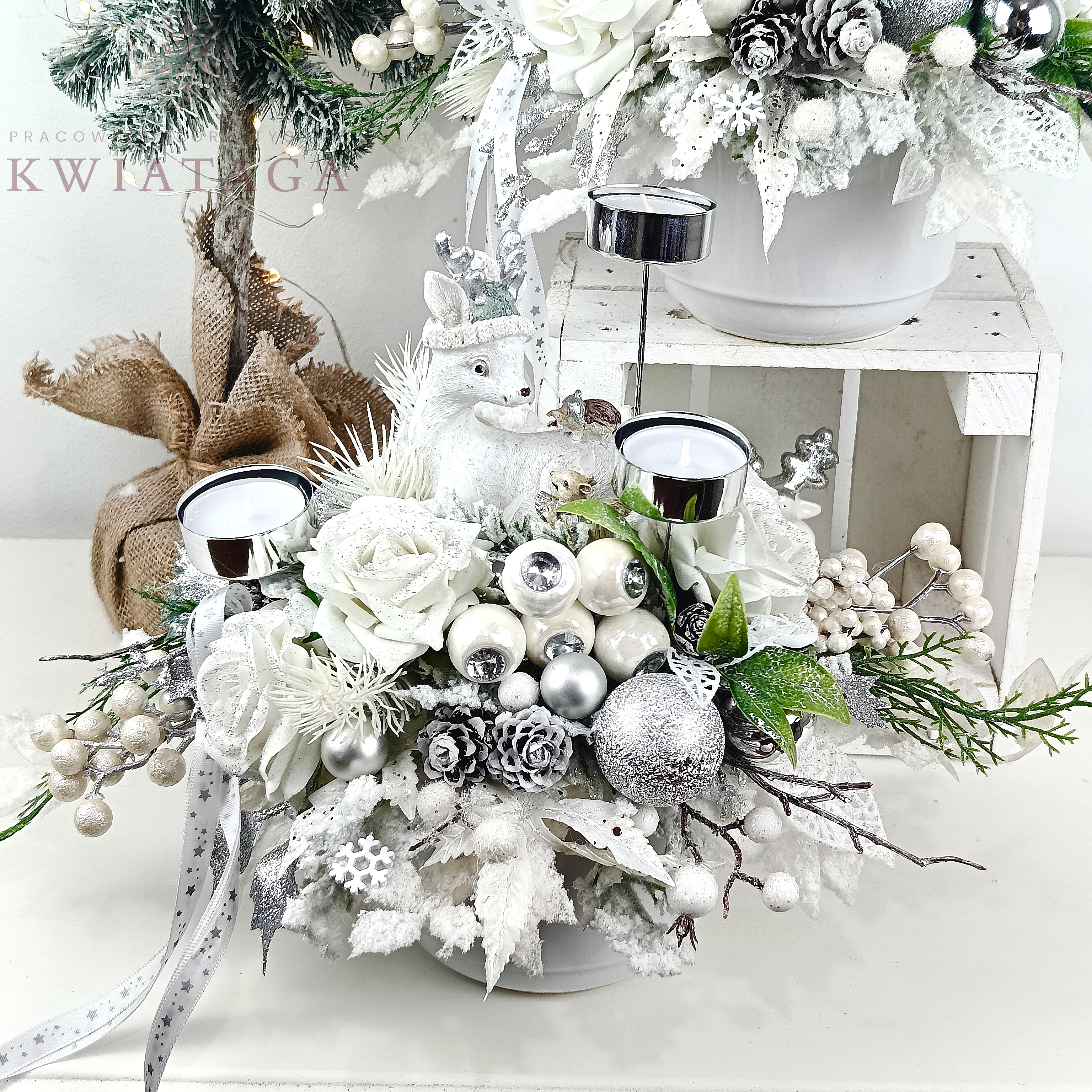 Elegancki, wydłużony stroik w kolorach bieli i srebra. Wykonany jest z wysokiej jakości sztucznego, ośnieżonego igliwia, brokatowych i ozdobnych gałązek. Zdobiony szklanymi i plastikowymi bombkami, kwiatami róży, uzupełniony różnorodnymi elementami dekoracyjnymi. Punktem centralnym kompozycji jest figurka jelonka oraz trzy świeczniki na tilighty, zaś podstawą jest ceramiczne naczynie.