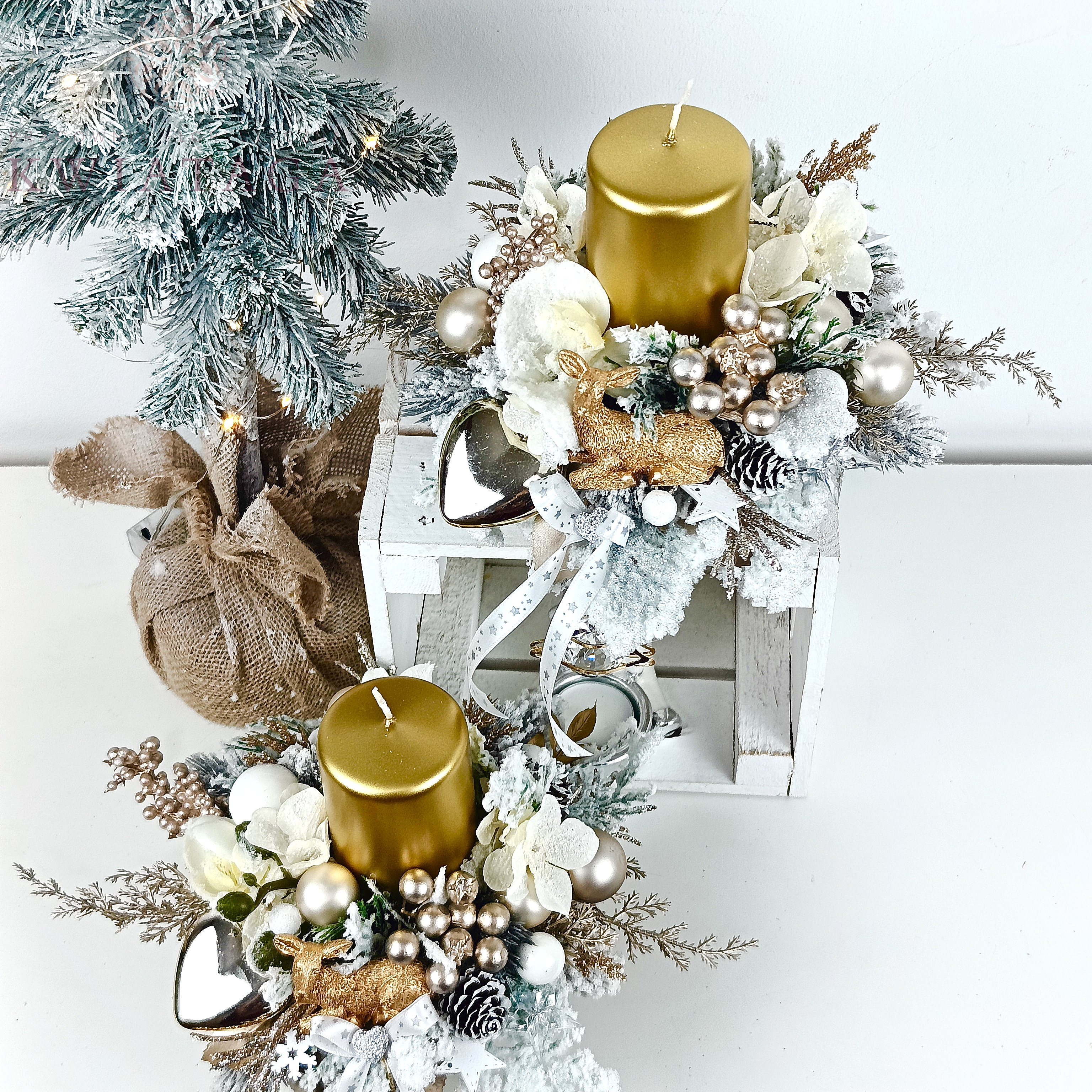Strona główna » Florystyka z kwiatów sztucznych wysokiej jakości » Boże Narodzenie » Stroiki świąteczne » Stroik złoto - biały nr 48