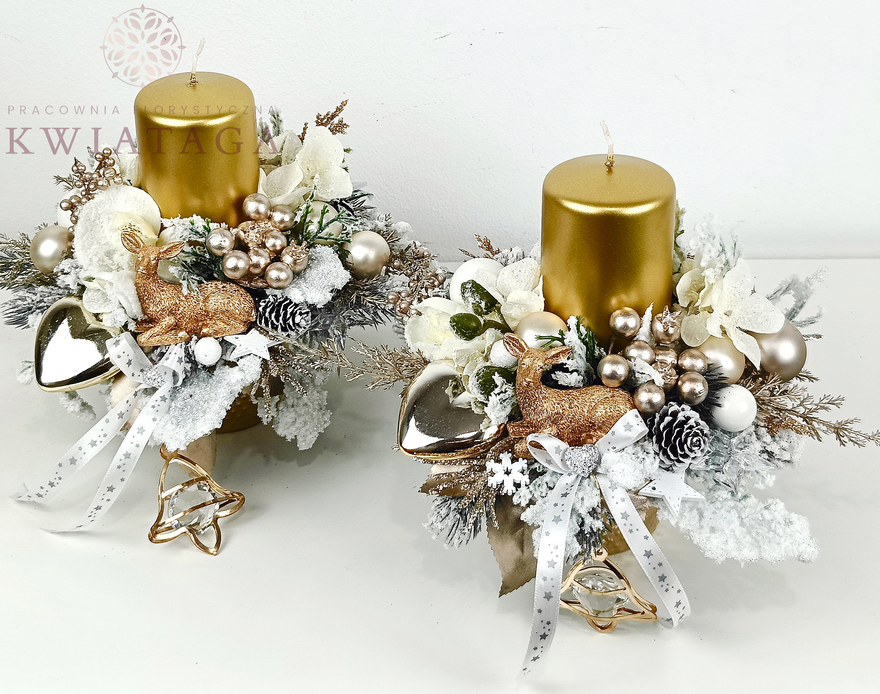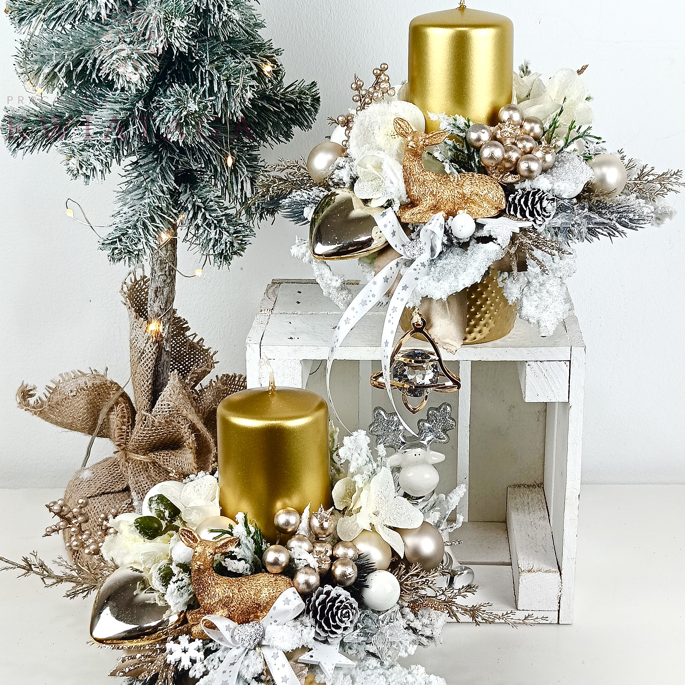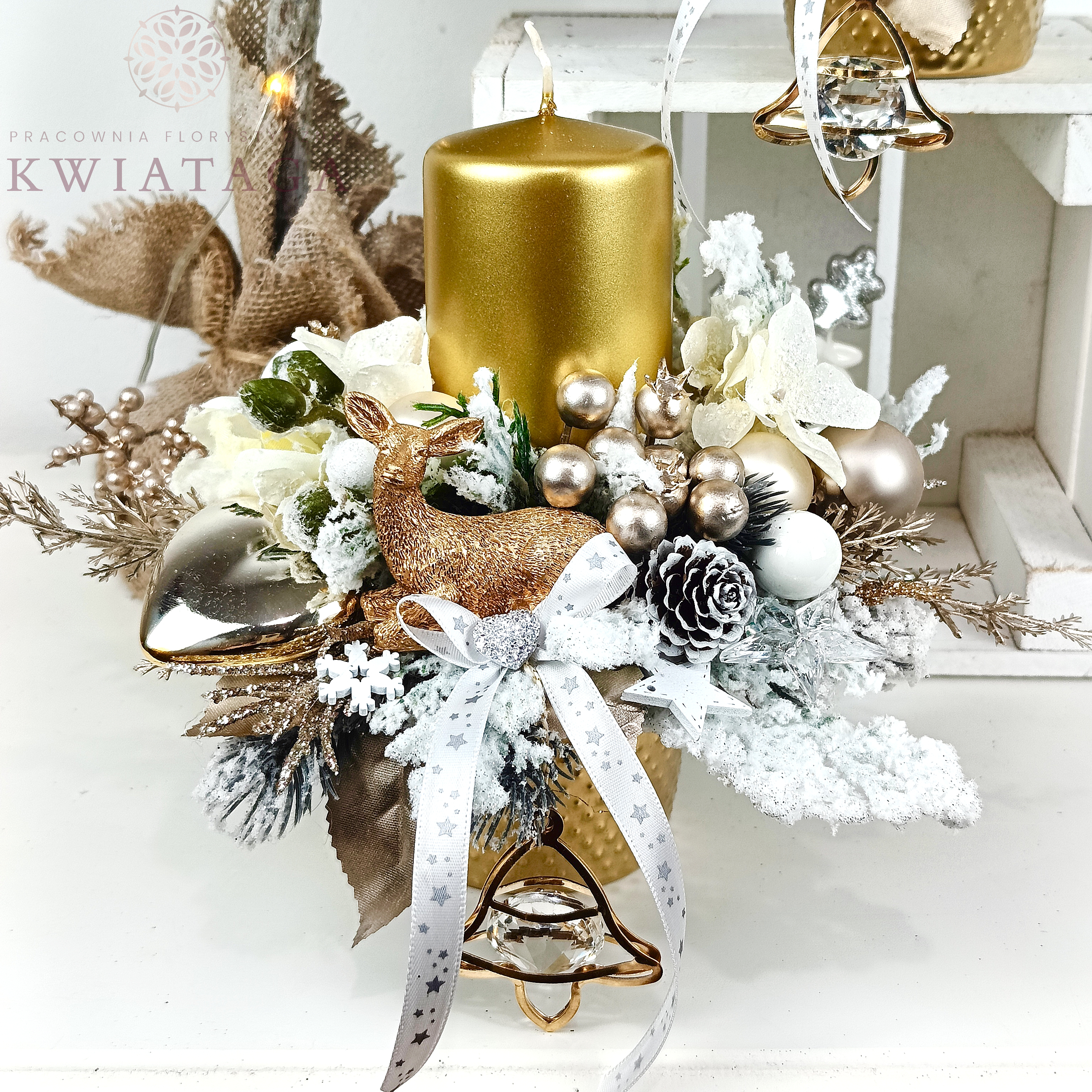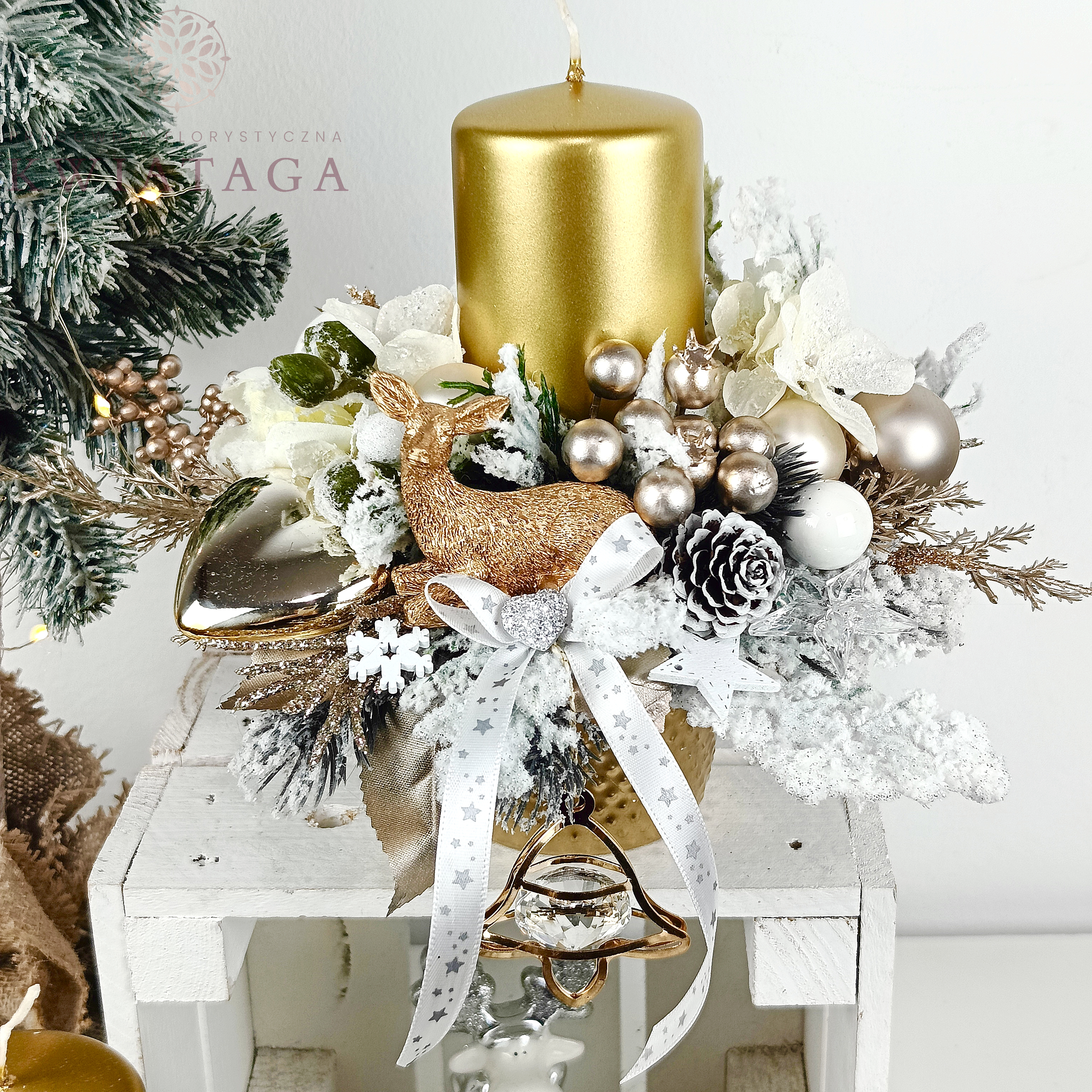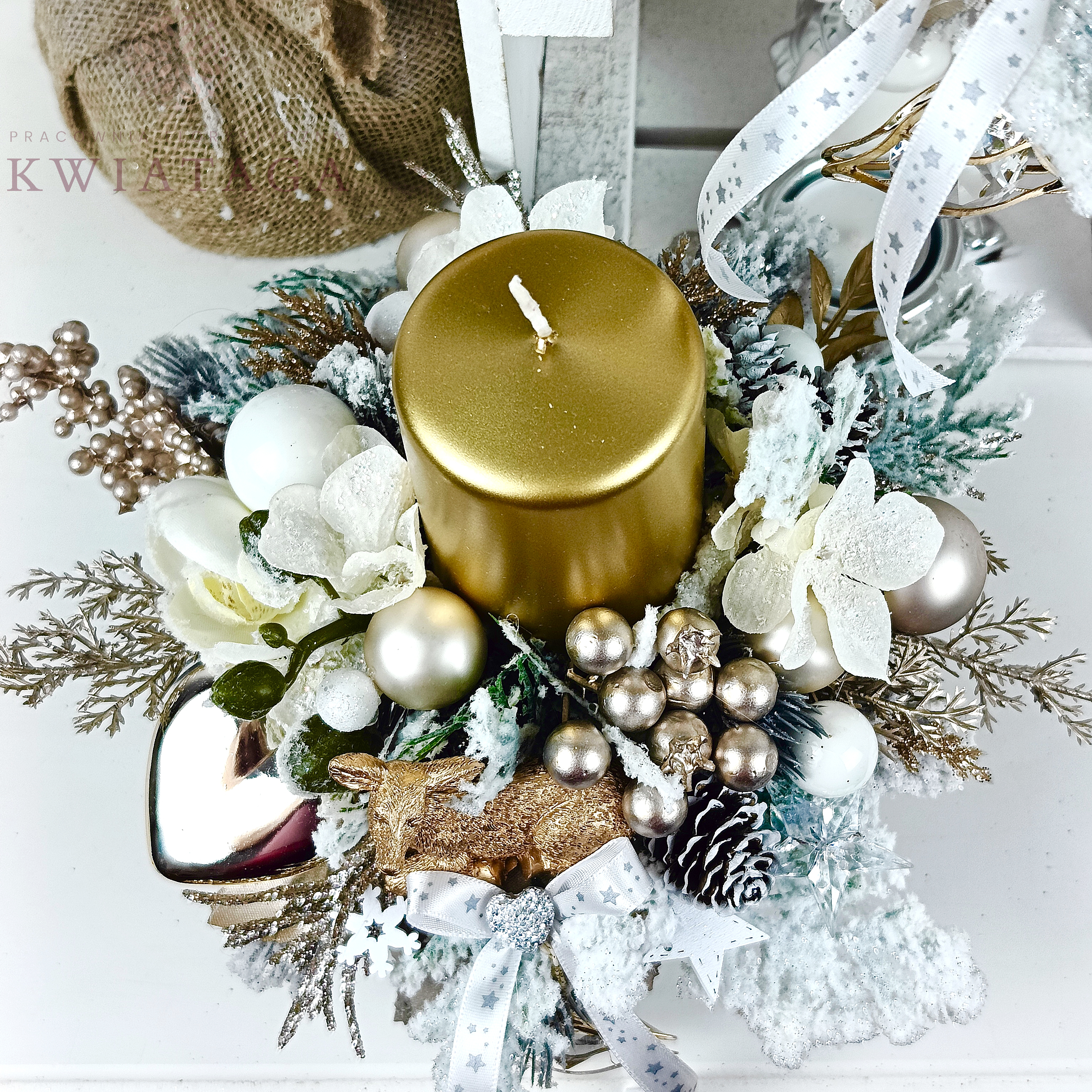 Elegancki, okrągły stroik w kolorach bieli, złota i szampana. Wykonany jest z wysokiej jakości sztucznego, ośnieżonego igliwia, brokatowych i ozdobnych gałązek. Zdobiony szklanymi i plastikowymi bombkami, kwiatami ośnieżonego storczyka, uzupełniony różnorodnymi elementami dekoracyjnymi. Punktem centralnym kompozycji jest złota świeca, zaś podstawą jest złote, ceramiczne naczynie o szerokości 6.5 cm.