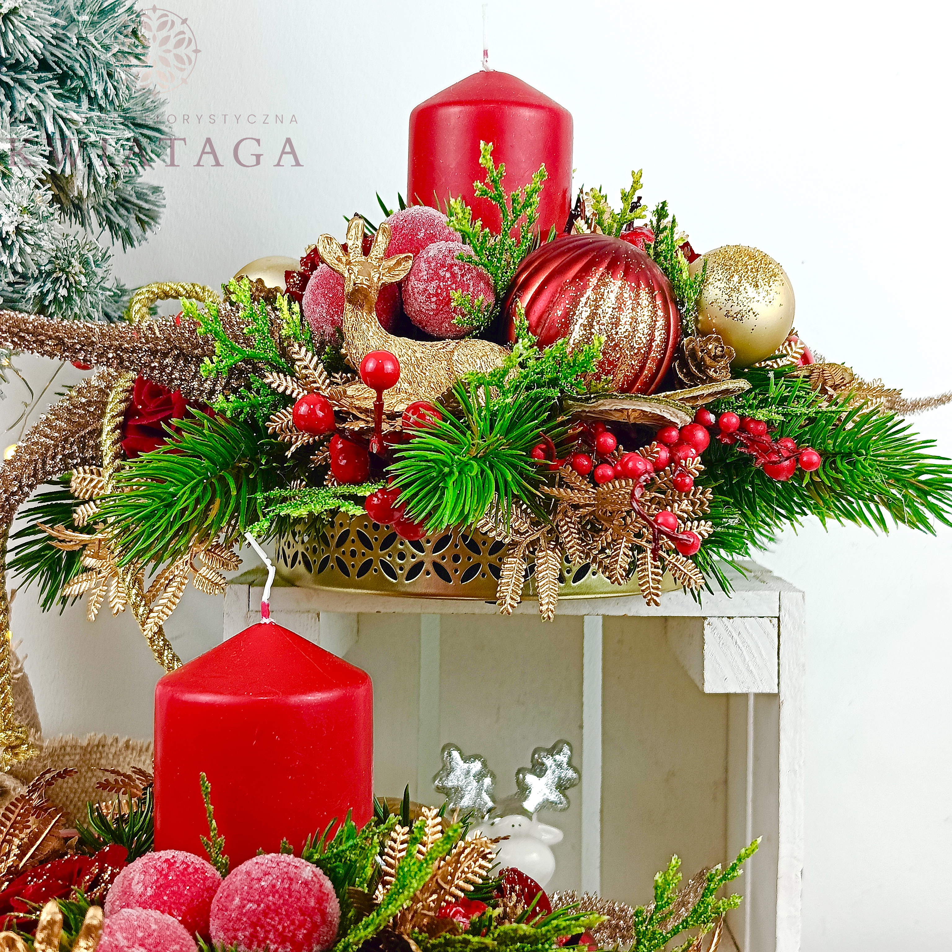 Elegancki stroik w kolorach czerwieni, złota i burgundu. Wykonany jest z wysokiej jakości sztucznego igliwia, brokatowych i ozdobnych gałązek. Zdobiony szklanymi i plastikowymi bombkami, kwiatami bordowej róży, uzupełniony różnorodnymi elementami dekoracyjnymi. Punktem centralnym kompozycji jest czerwona świeca i figurka jelonka, zaś podstawą jest plastikowy podstawek.