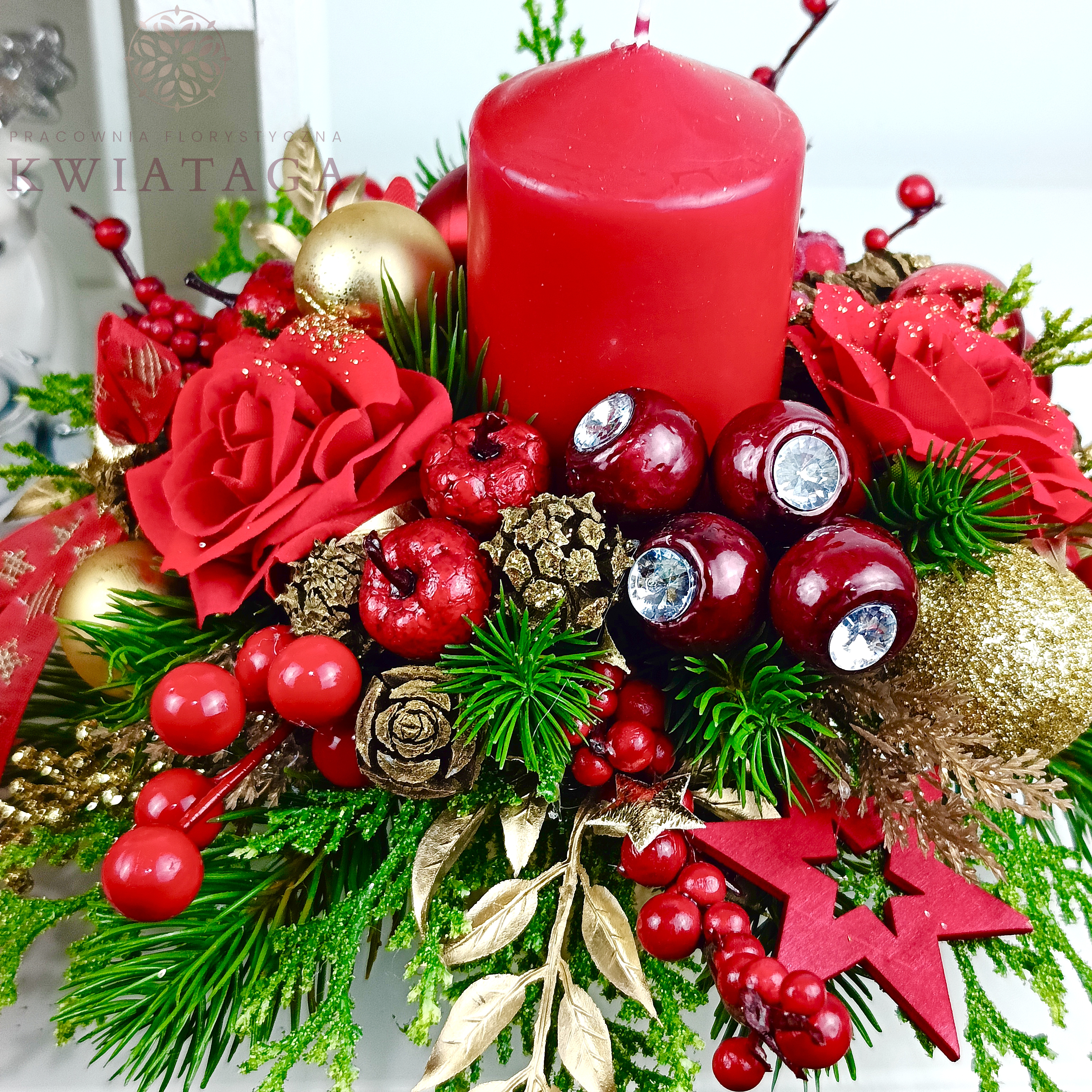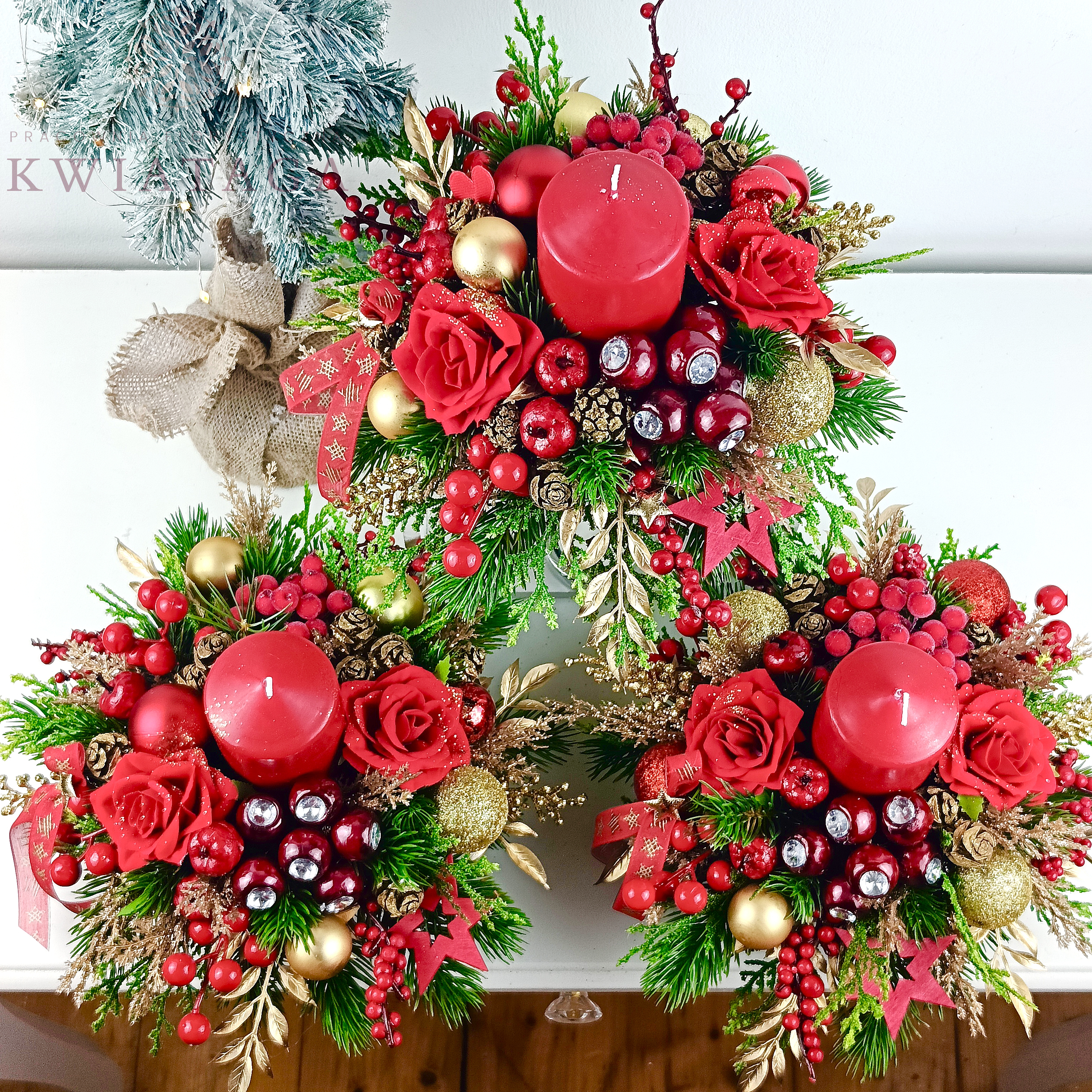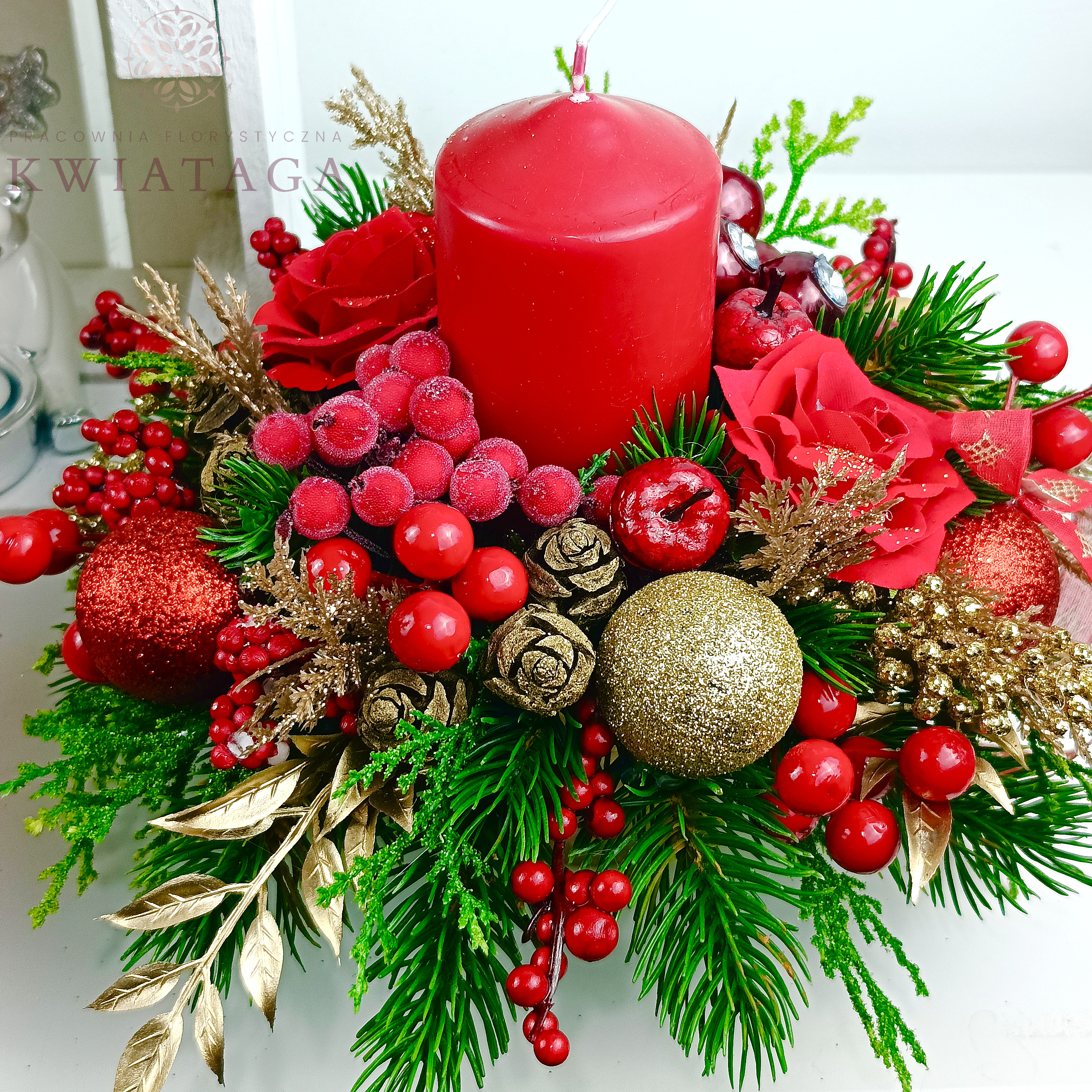 Elegancki stroik w kolorach czerwieni i złota z nutą brązu. Wykonany jest z wysokiej jakości sztucznego igliwia, brokatowych i ozdobnych gałązek. Zdobiony szklanymi i plastikowymi bombkami, kwiatami czerwonej róży, uzupełniony różnorodnymi elementami dekoracyjnymi. Punktem centralnym kompozycji jest czerwona świeca, zaś podstawą jest ceramiczne, białe naczynie.