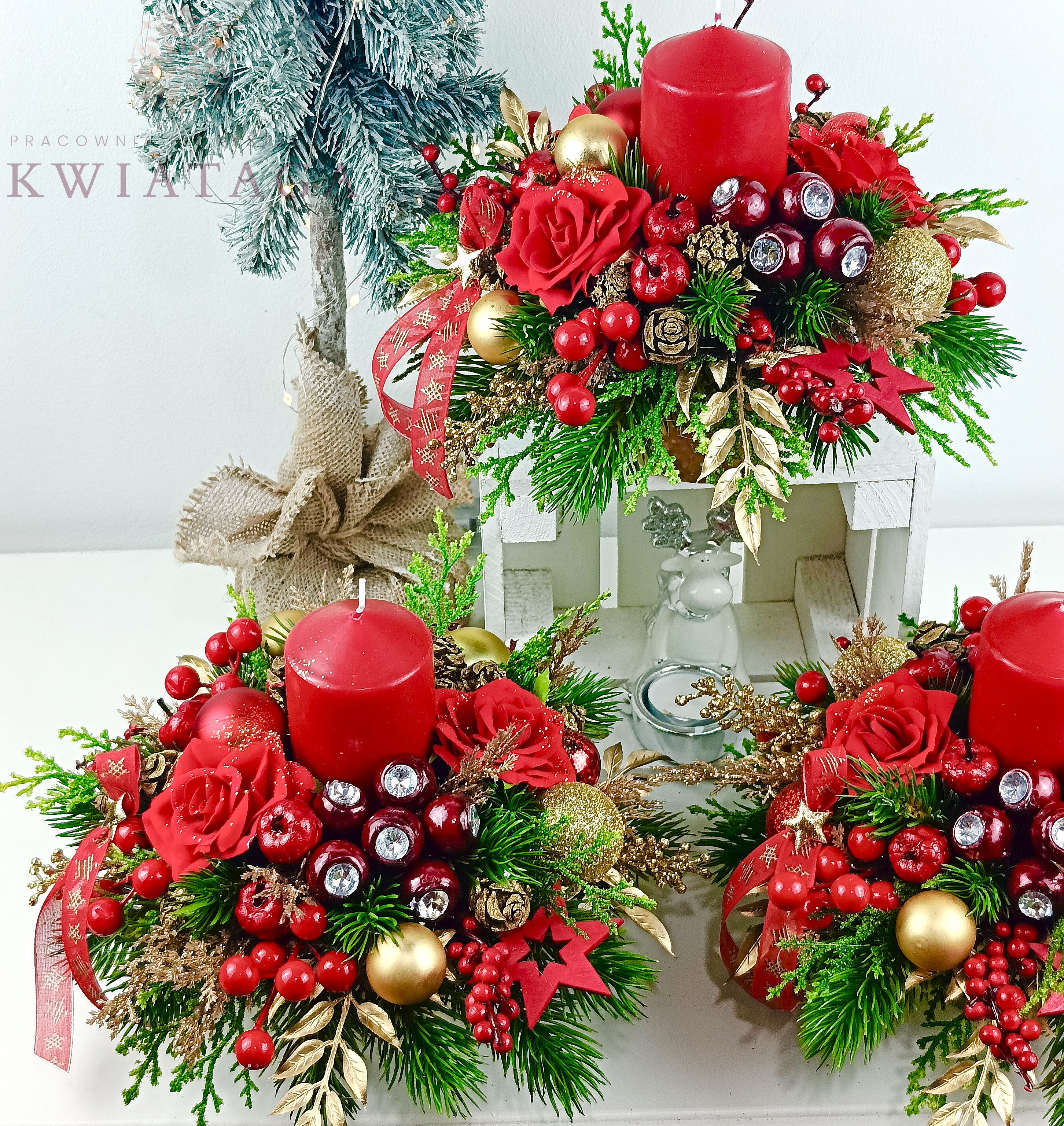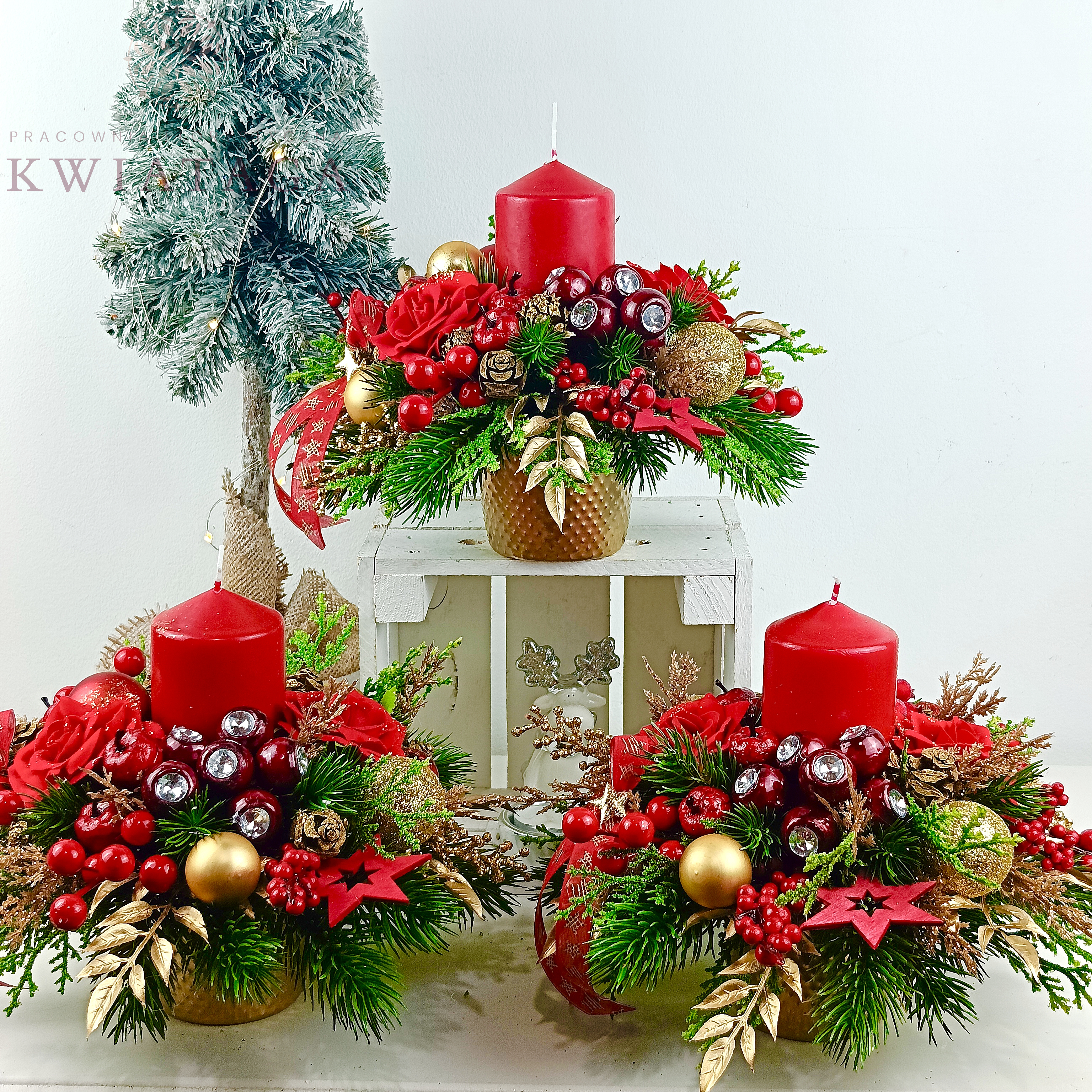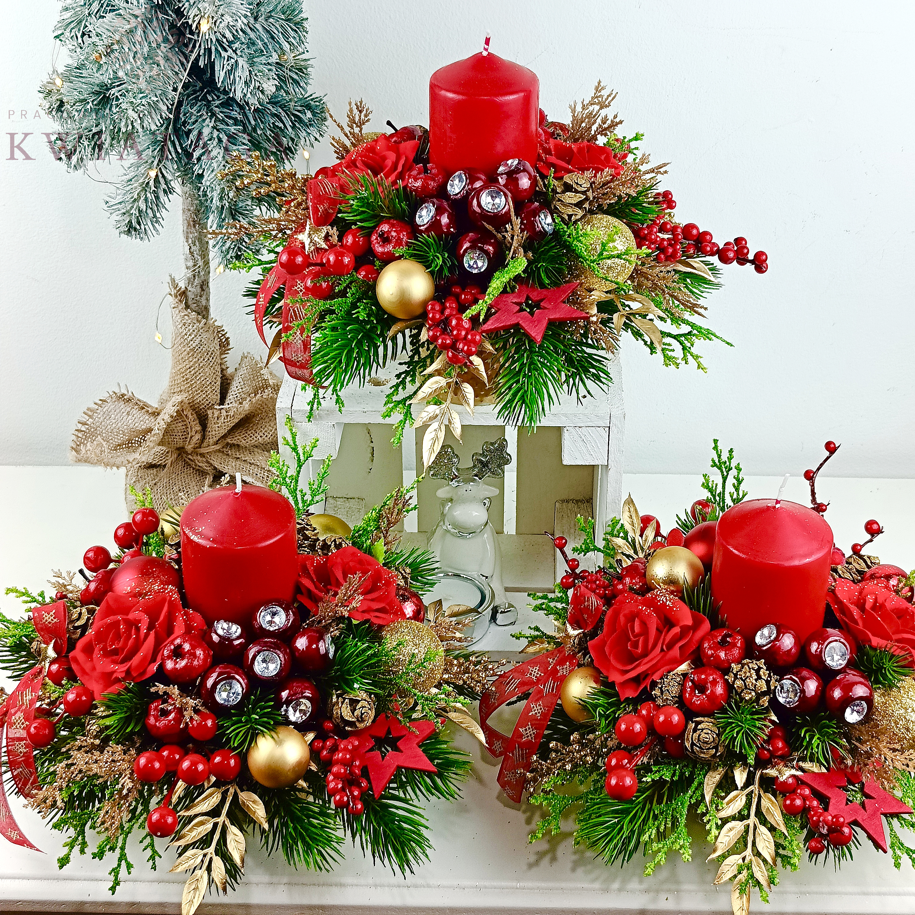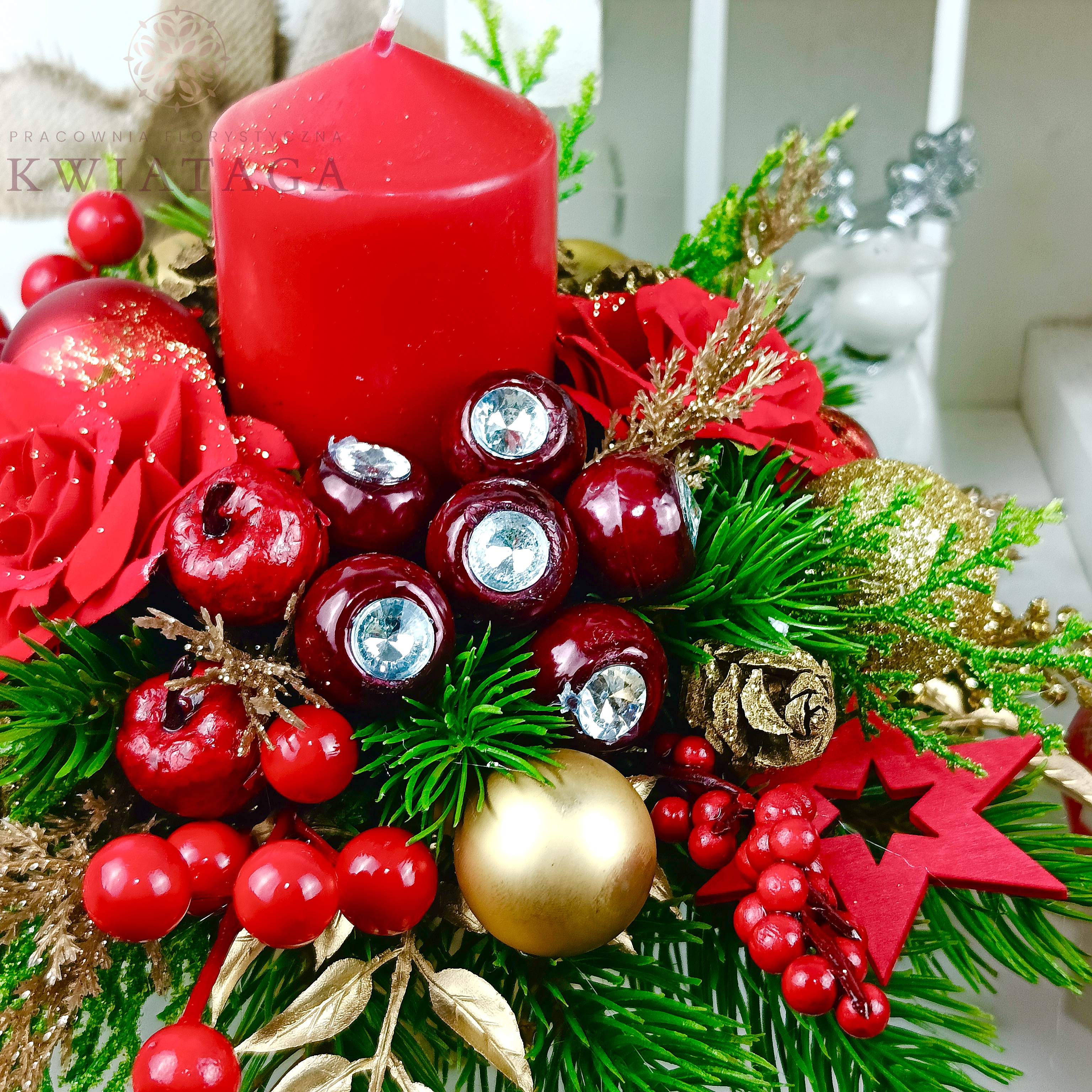 Elegancki stroik w kolorach czerwieni i złota z nutą brązu. Wykonany jest z wysokiej jakości sztucznego igliwia, brokatowych i ozdobnych gałązek. Zdobiony szklanymi i plastikowymi bombkami, kwiatami czerwonej róży, uzupełniony różnorodnymi elementami dekoracyjnymi. Punktem centralnym kompozycji jest czerwona świeca, zaś podstawą jest ceramiczne, białe naczynie.