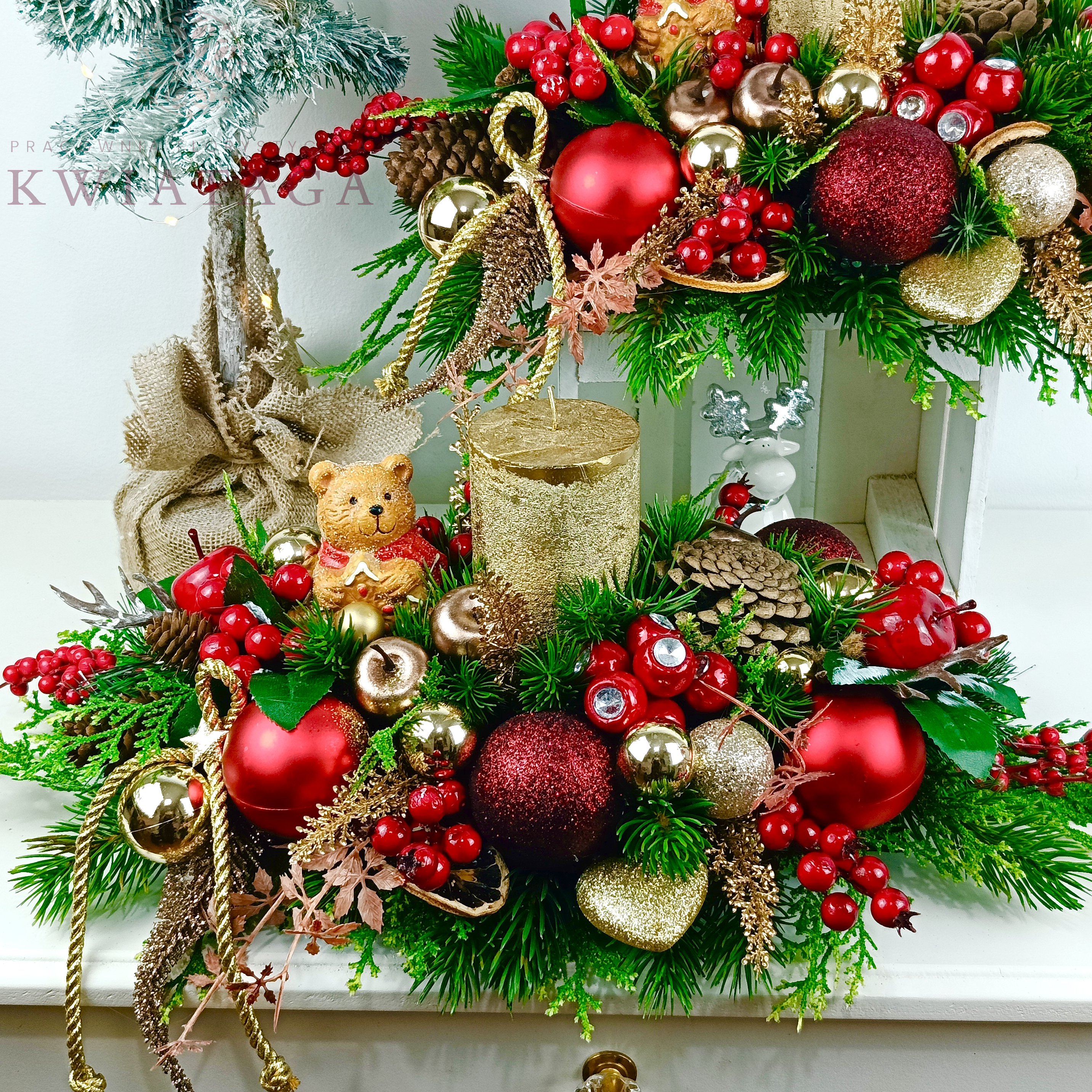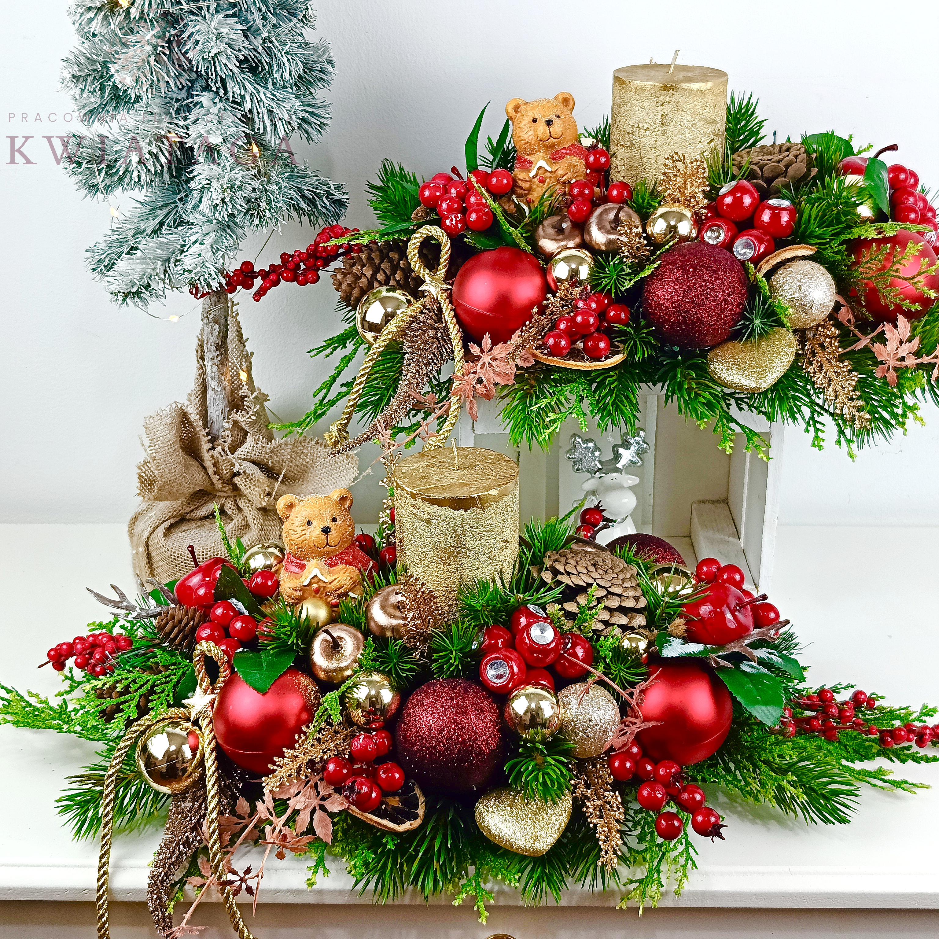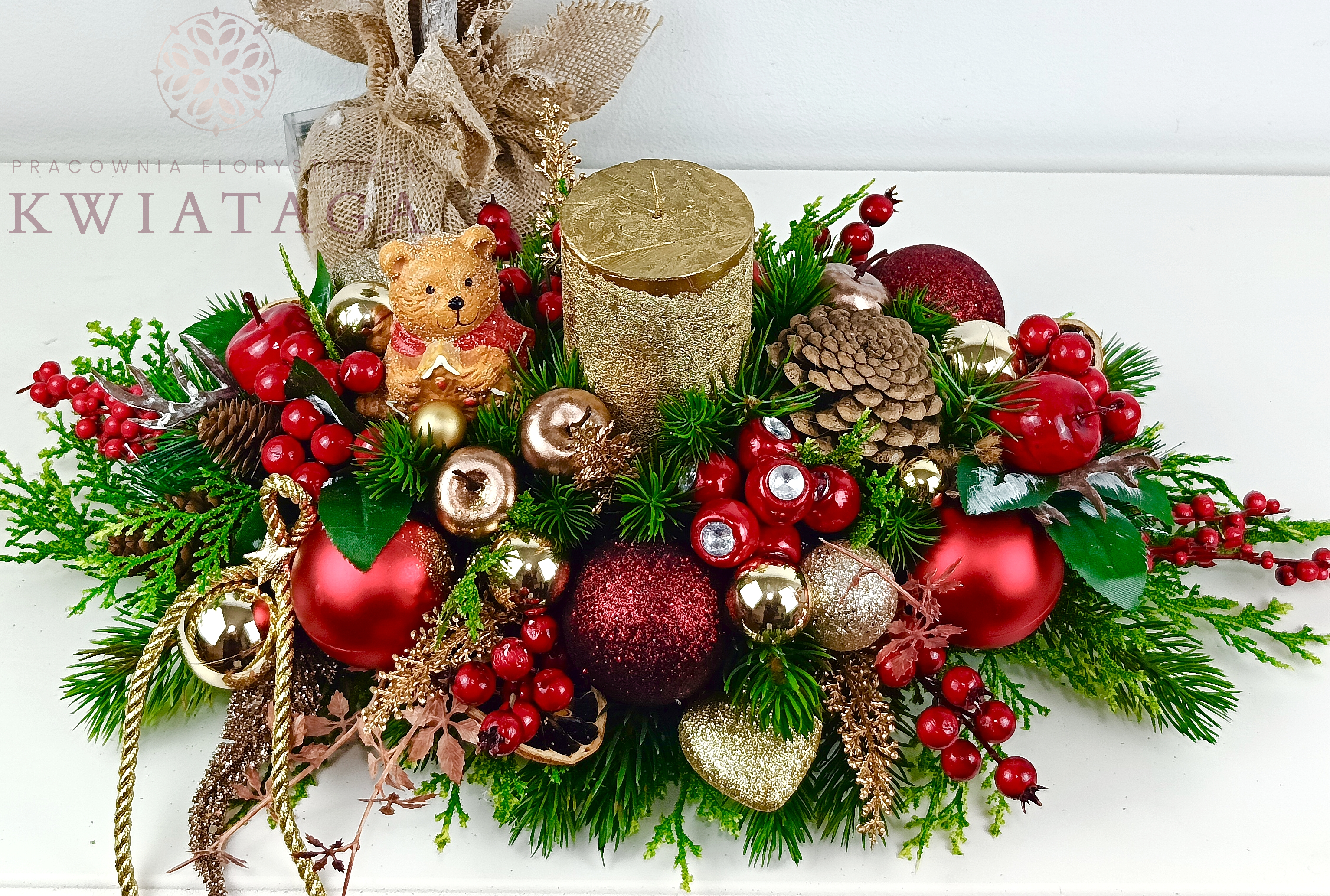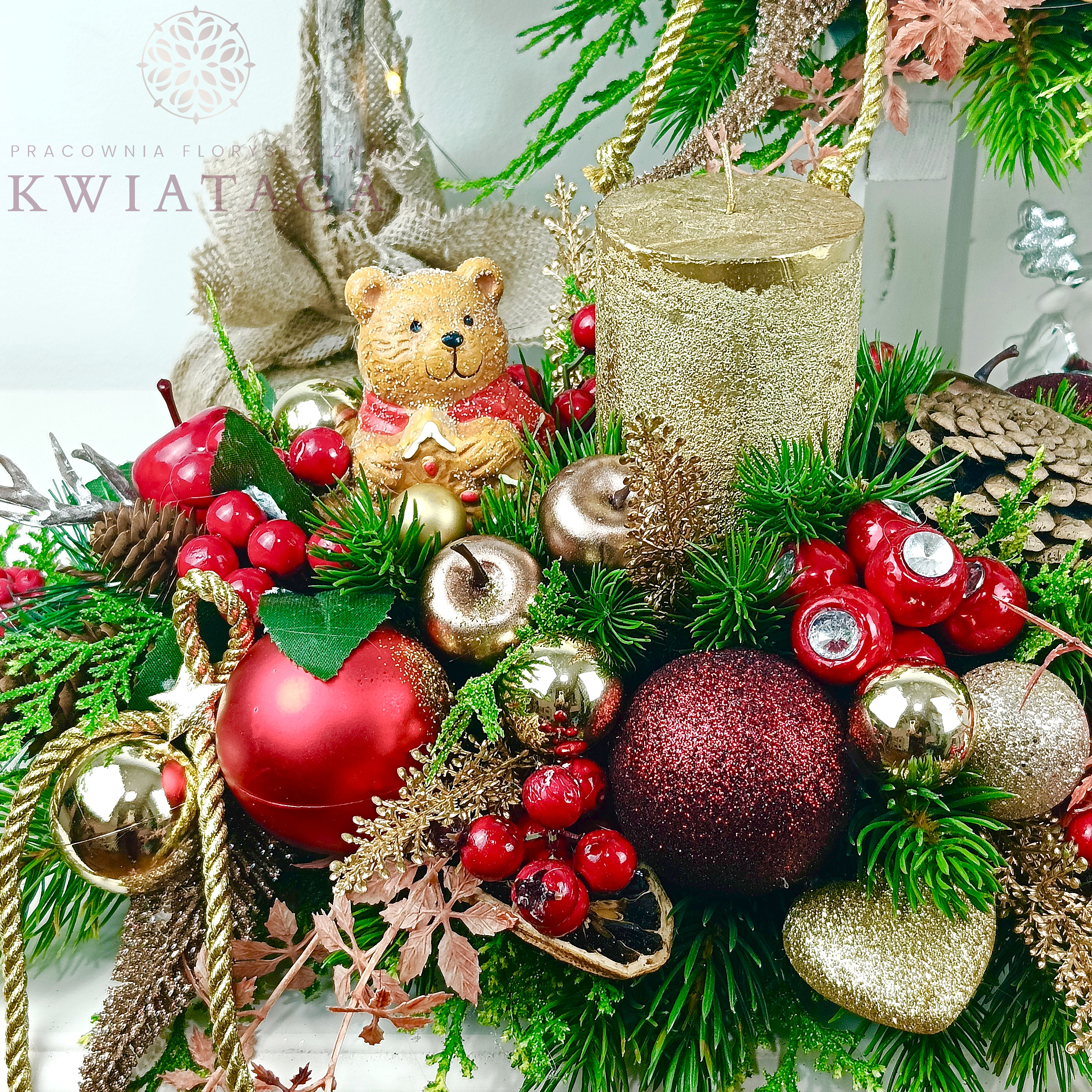 Elegancki, podłużny stroik w kolorach czerwieni, złota i burgundu. Wykonany jest z wysokiej jakości sztucznego, ośnieżonego igliwia, brokatowych i ozdobnych gałązek. Zdobiony szklanymi i plastikowymi bombkami, uzupełniony różnorodnymi elementami dekoracyjnymi. Punktem centralnym kompozycji jest złota świeca i figurka misia, zaś podstawą jest plastikowy podstawek.