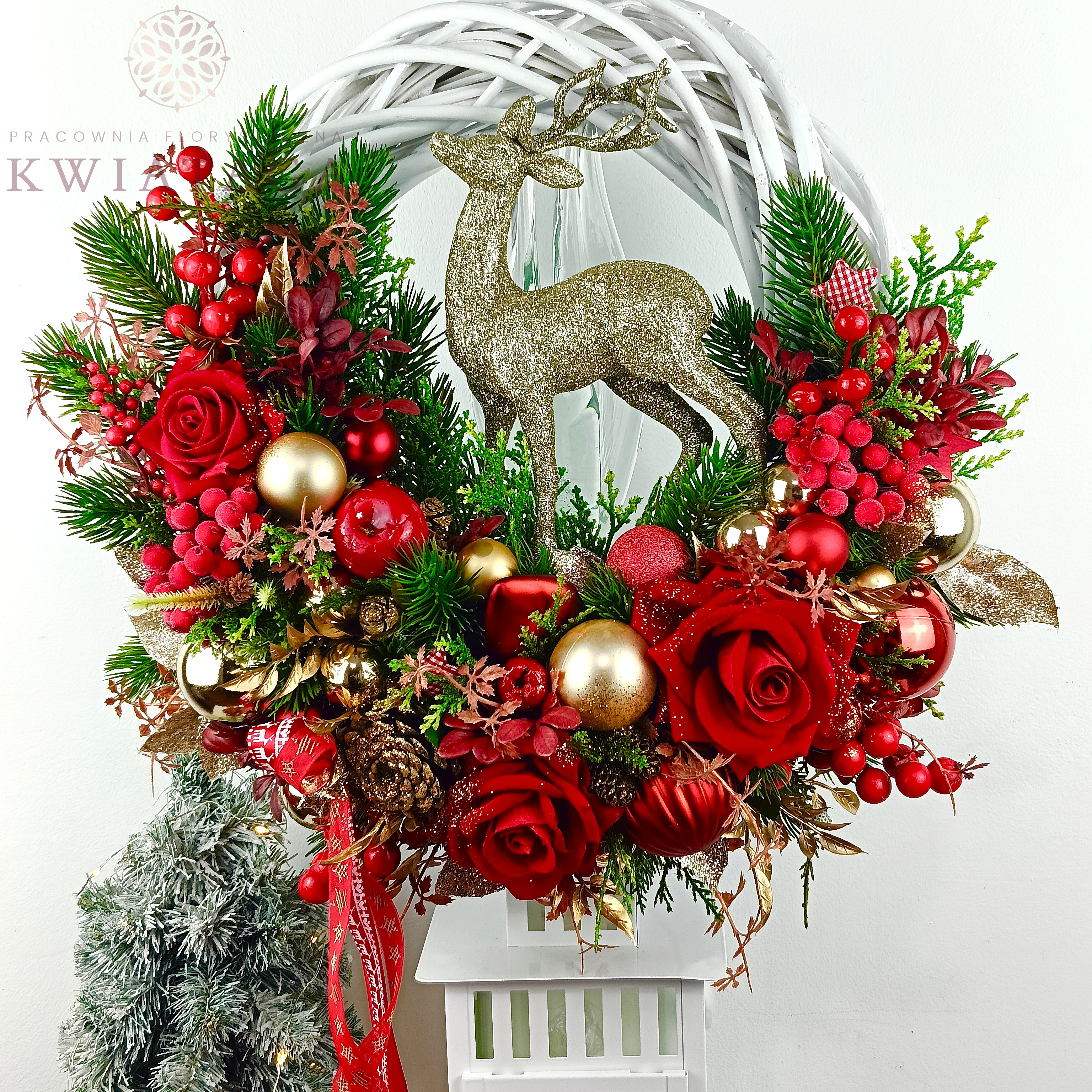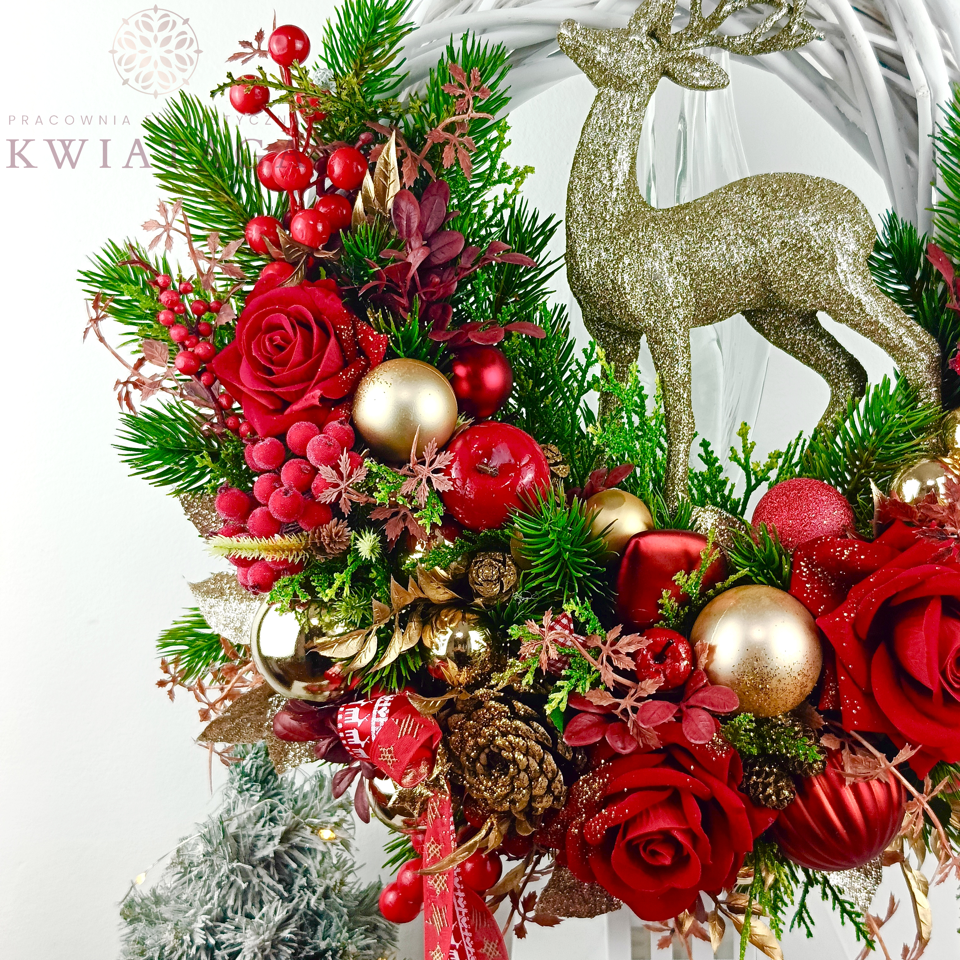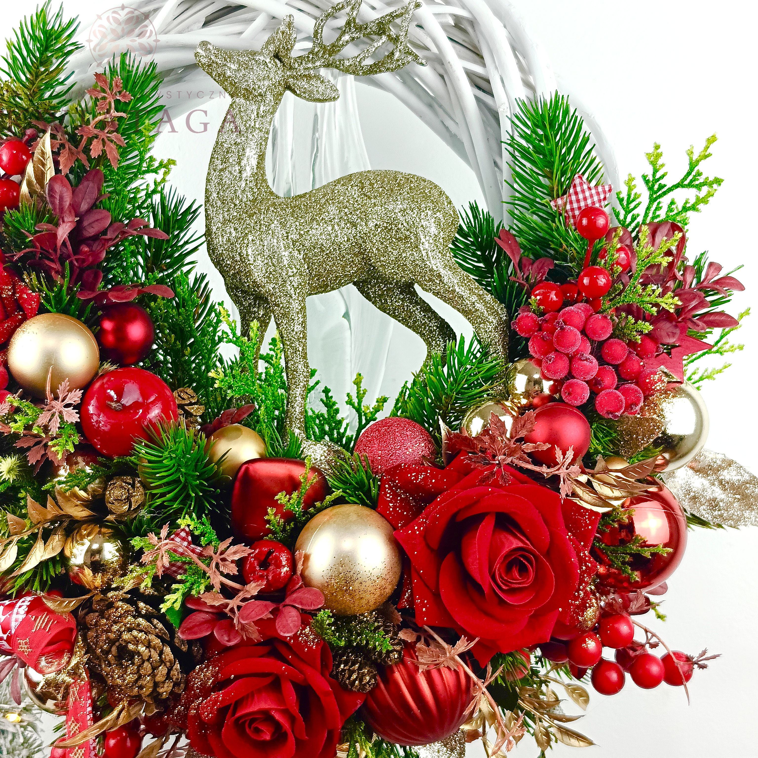 Elegancki wianek świąteczny, w kolorach czerwieni, złota i zieleni. Wykonany na białej wiklinie, z igliwia wysokiej jakości, brokatowych i ozdobnych gałązek. szklanych i plastikowych bombek. Uzupełniony pięknymi dodatkami, czerwonymi różami oraz figurką renifera.