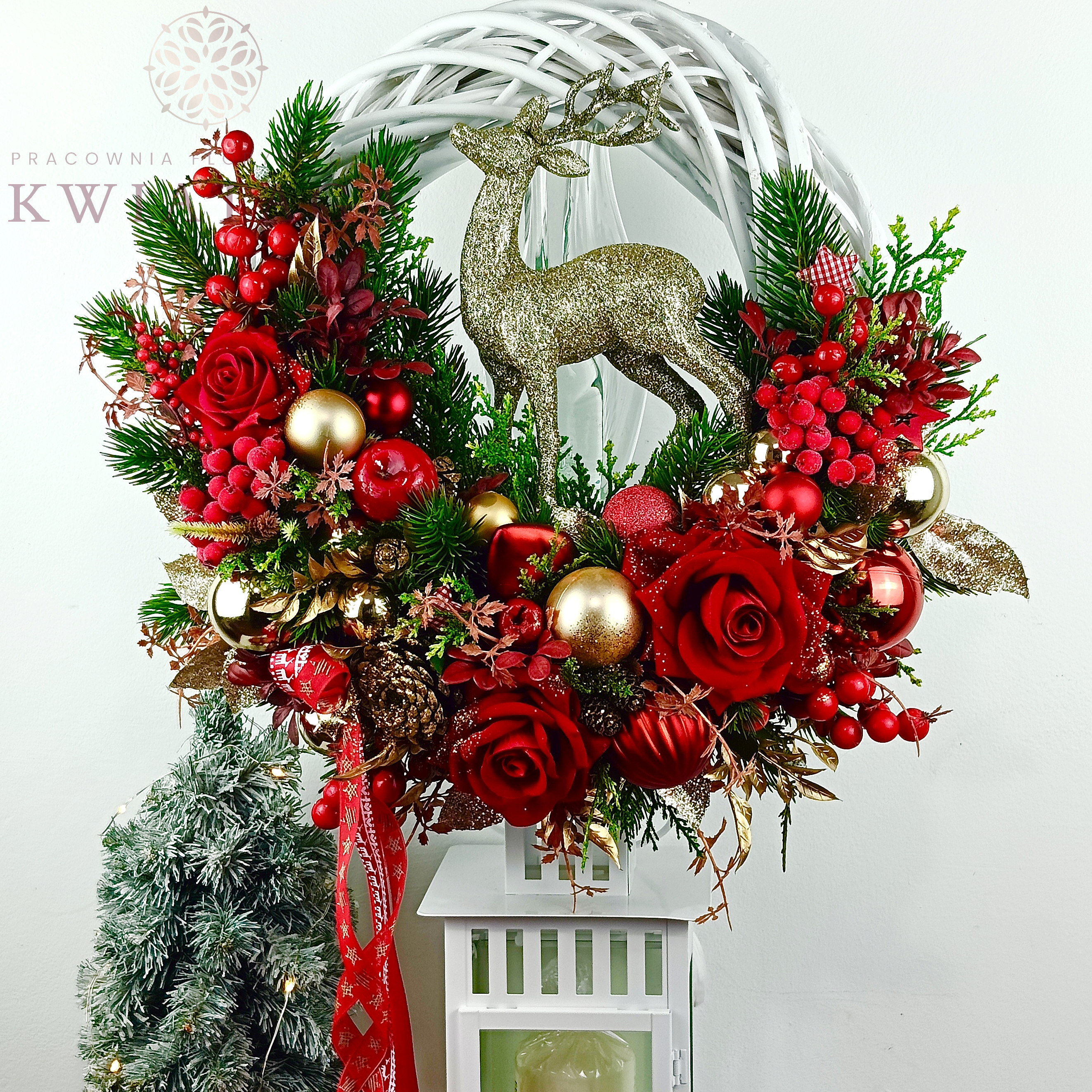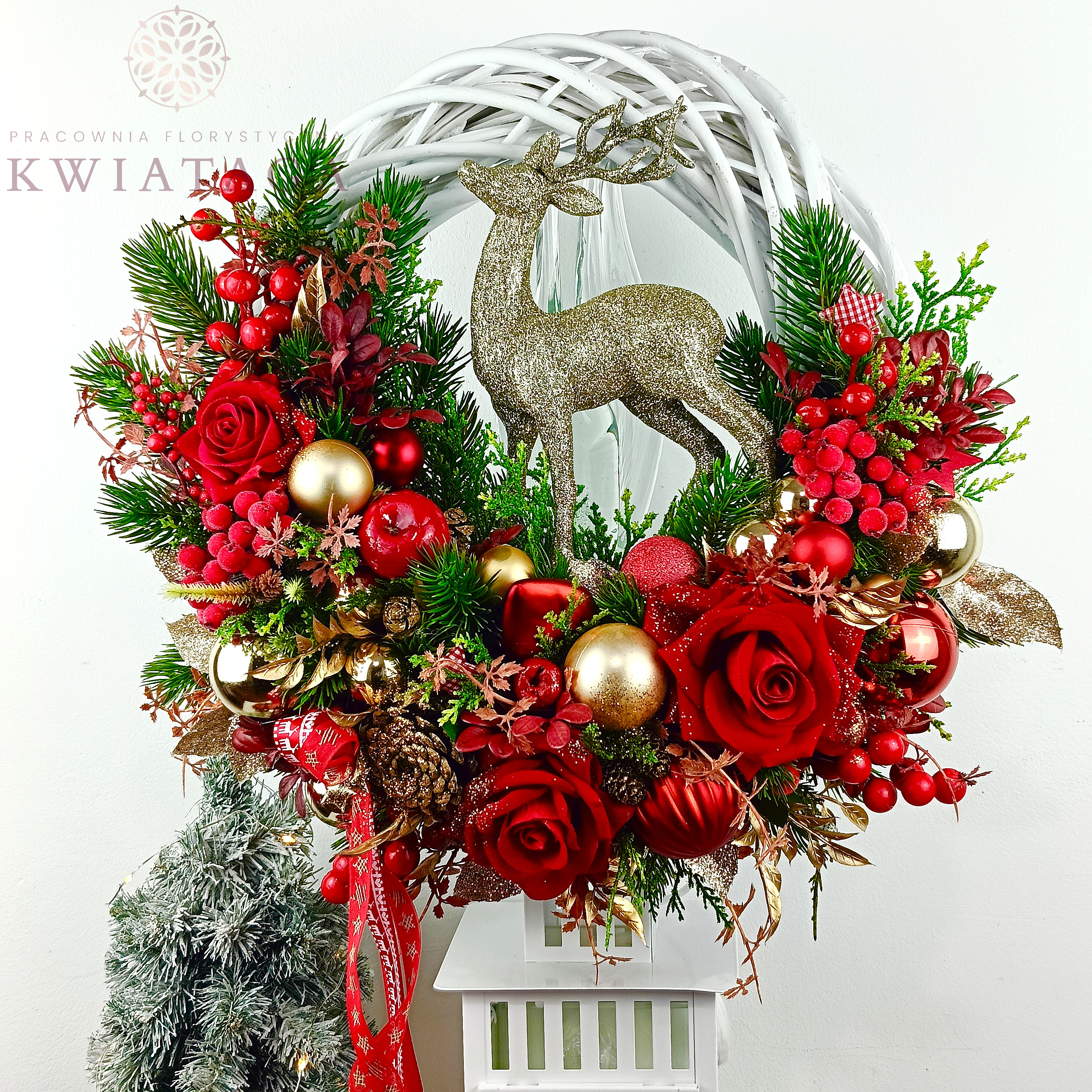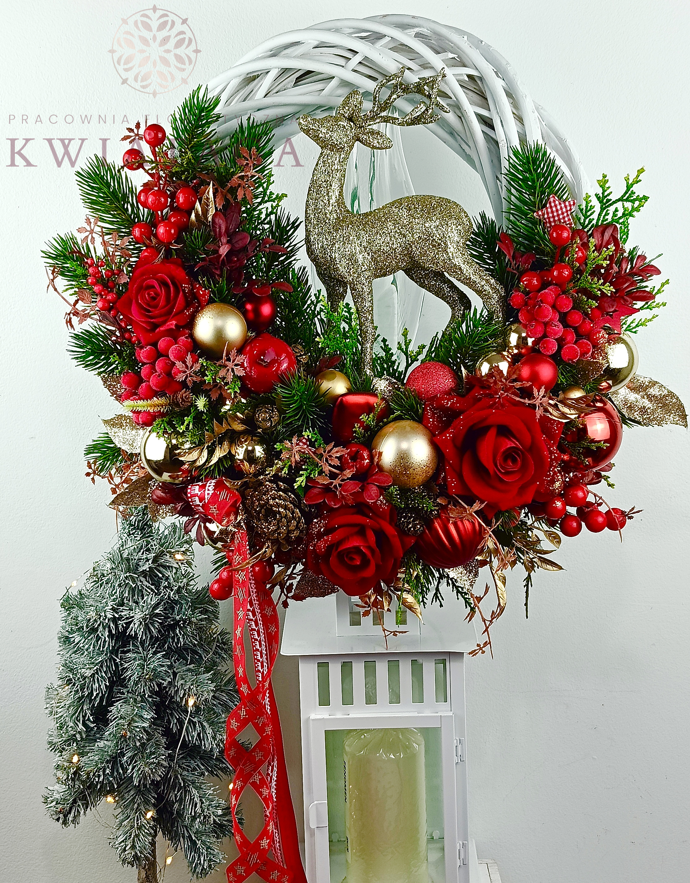 Elegancki wianek świąteczny, w kolorach czerwieni, złota i zieleni. Wykonany na białej wiklinie, z igliwia wysokiej jakości, brokatowych i ozdobnych gałązek. szklanych i plastikowych bombek. Uzupełniony pięknymi dodatkami, czerwonymi różami oraz figurką renifera.